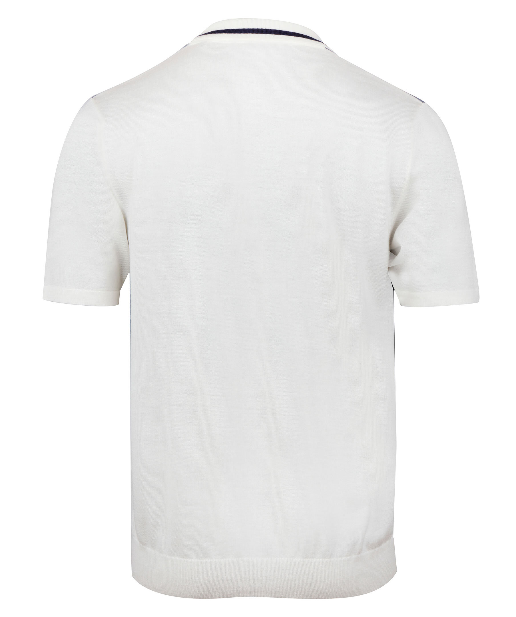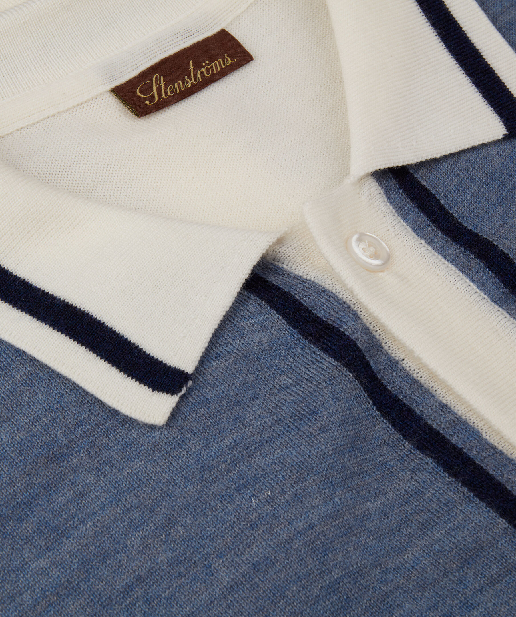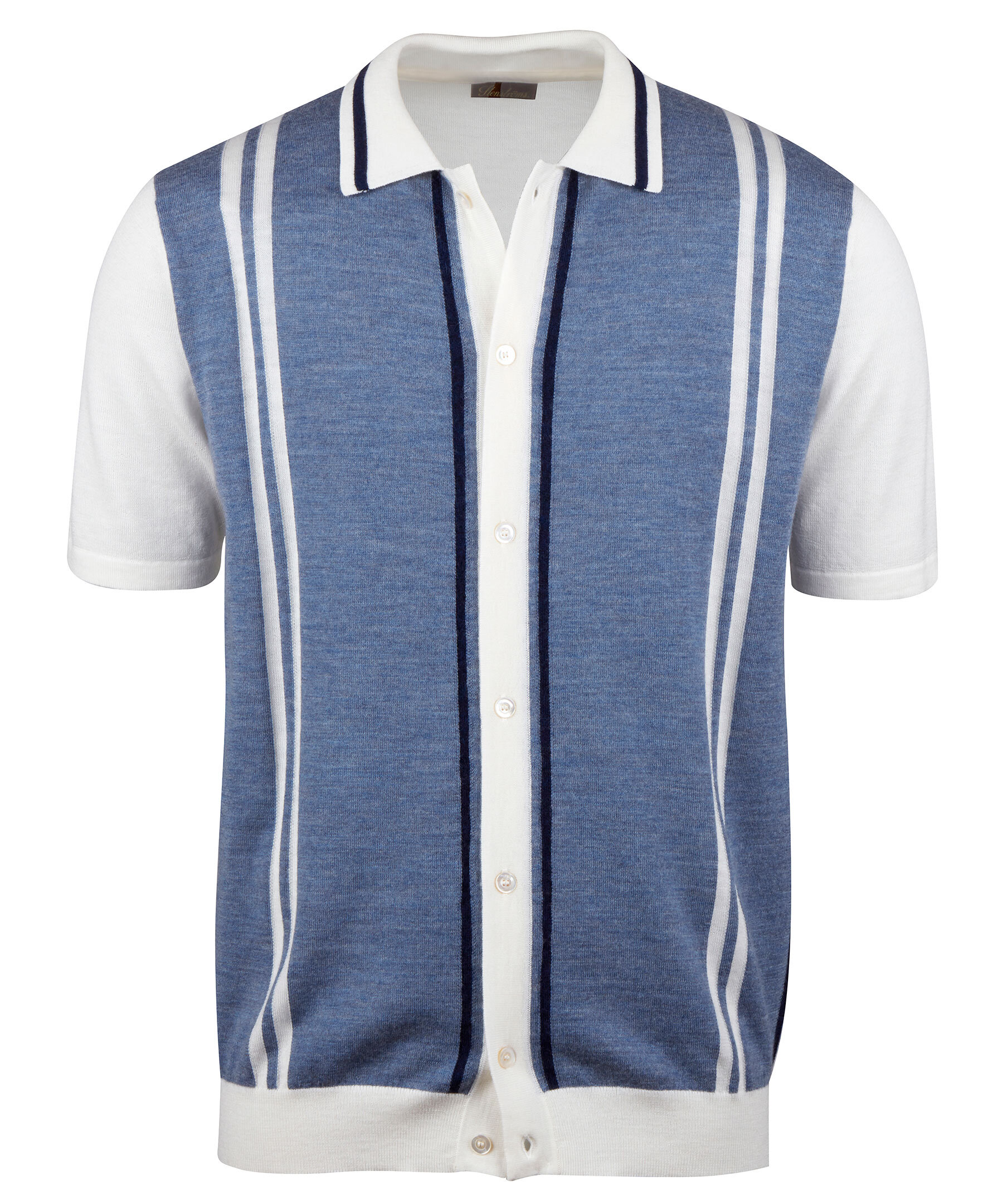 Ljusblå stickad, kortärmad skjorta från Stenströms. Tillverkad av merinoull. Detaljerad med vita ränder, vit krage, ribbstickade detaljer och pärlemorknappar hela vägen fram.