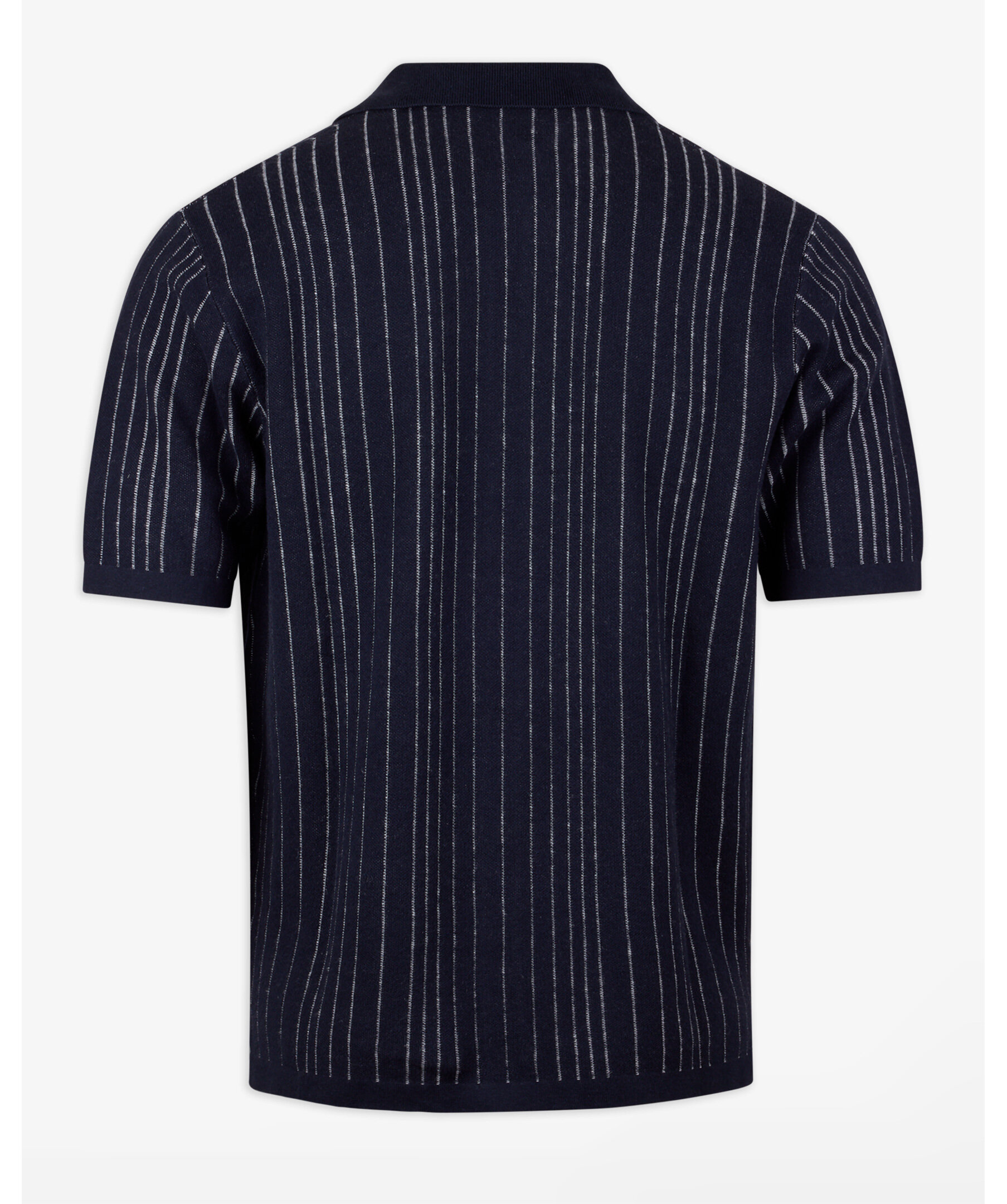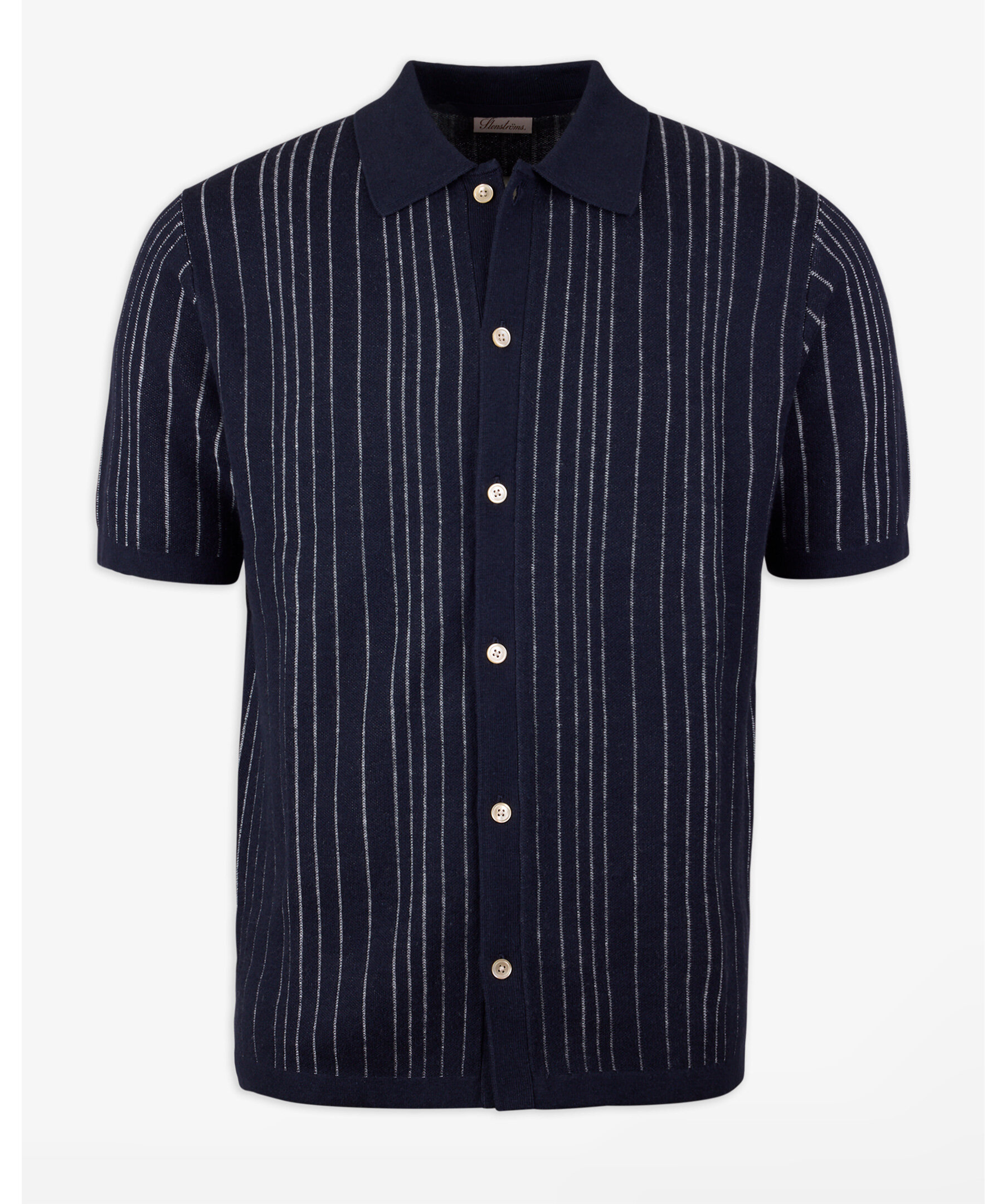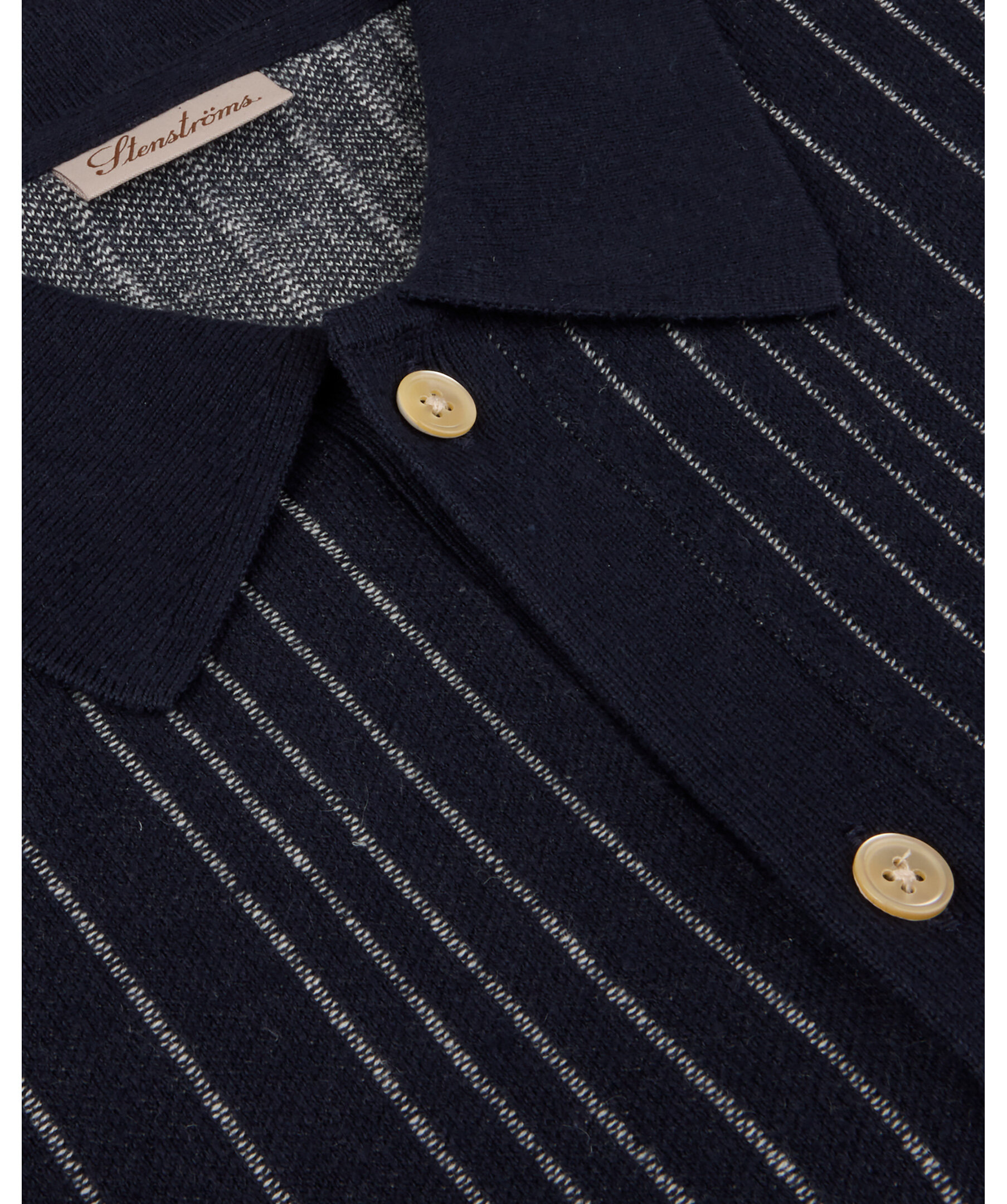 Marinblå randig stickad pikétröja tillverkad av bomull och hampa. Knappar av pärlemor.