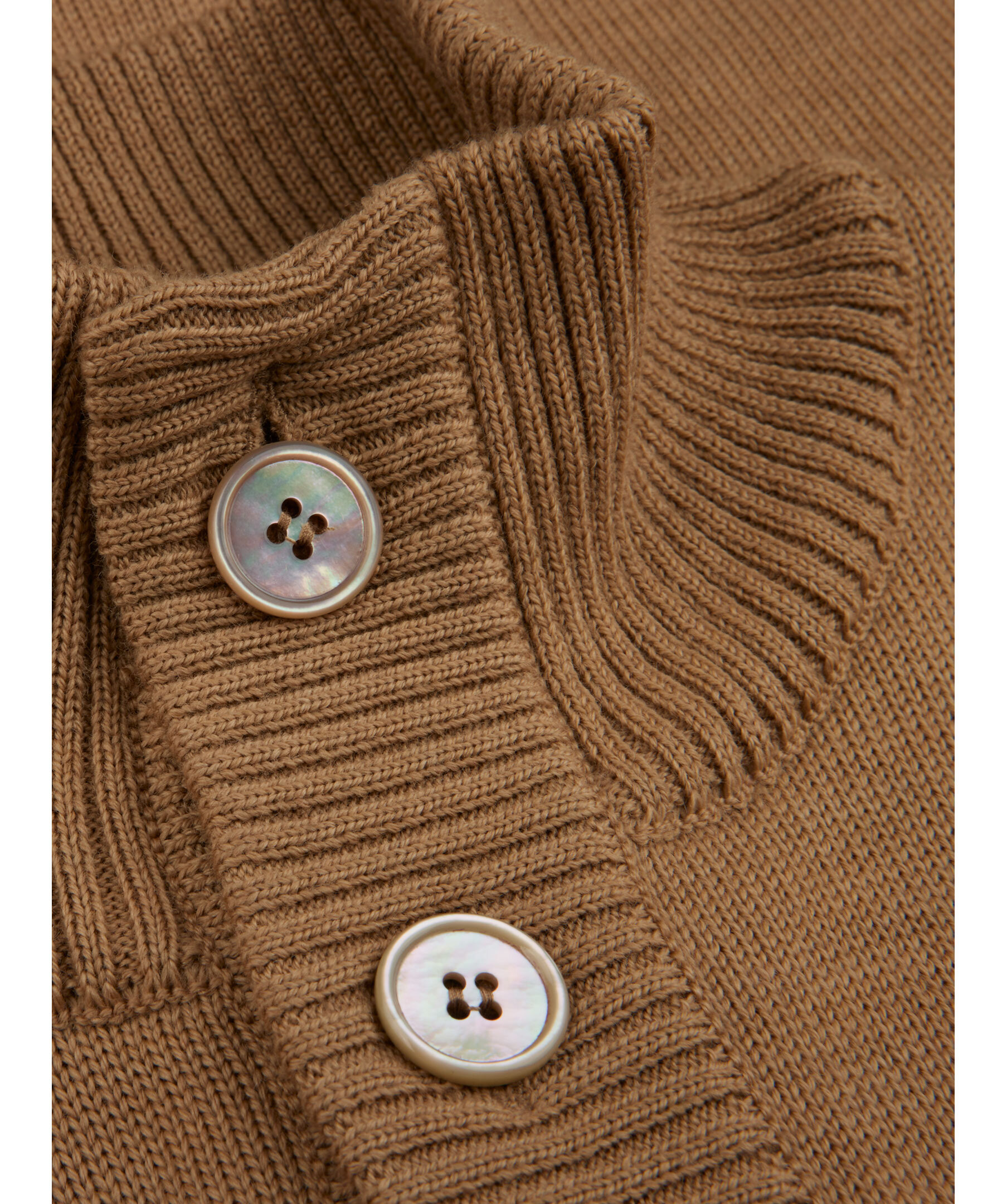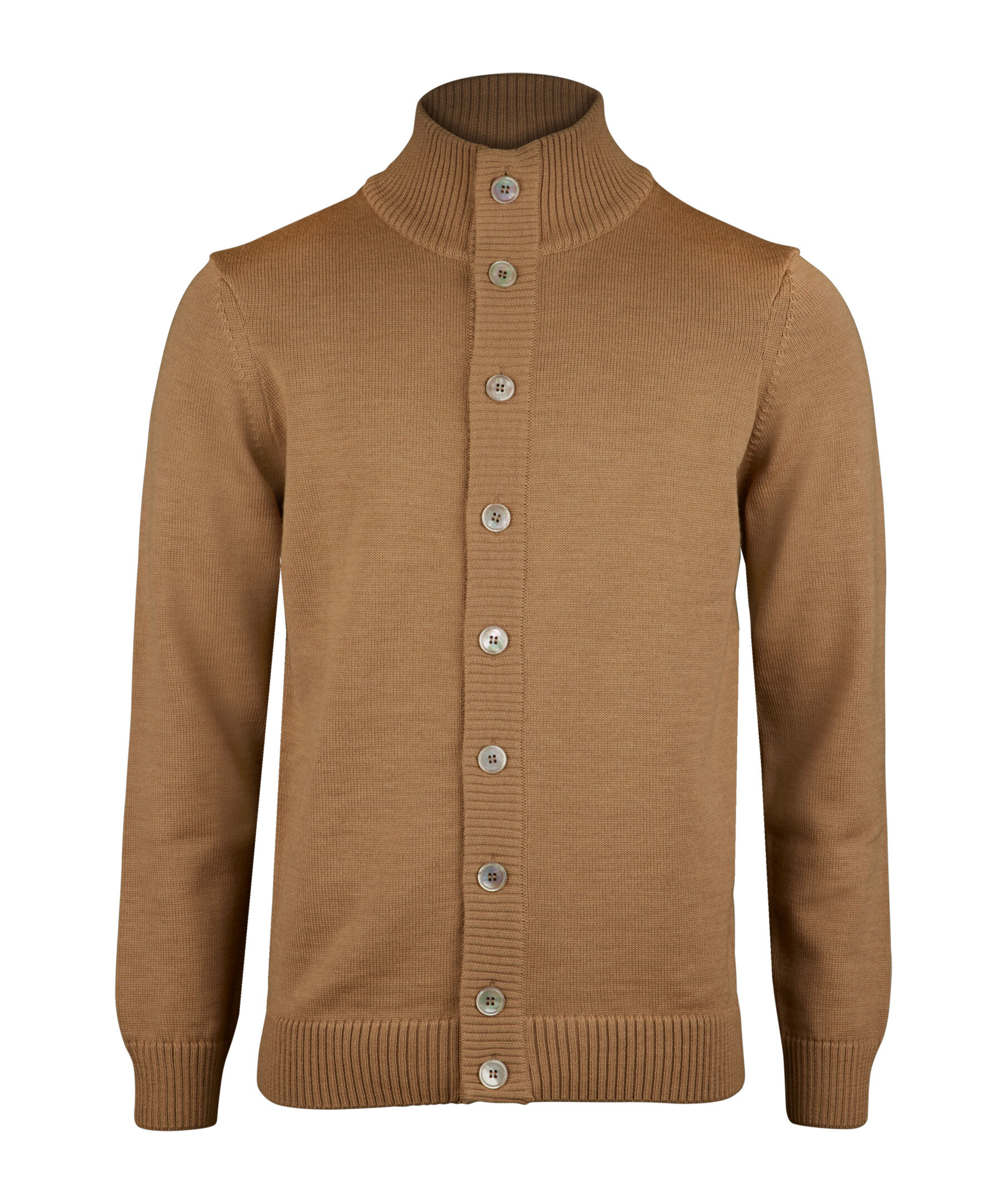 Denna cardigan är tillverkad av merinoull och har pärlemorknappar och ribstickade detaljer vid krage, ärm- och plaggslut.