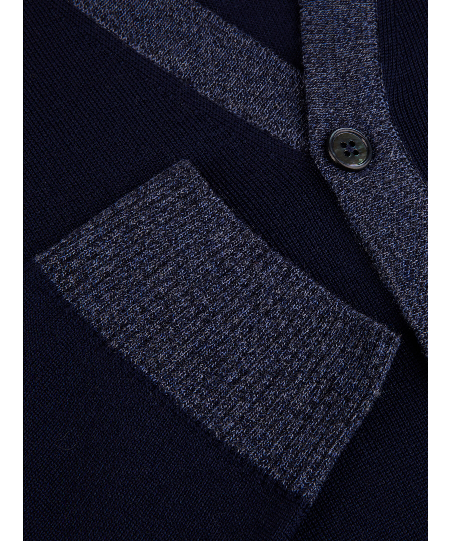 Denna kofta är tillverkad av merinoull och är detaljerad med en moulinékontrast. Koftan har pärlemorknappar och ribbstickade detaljer vid ärm, krage och plaggslut.
