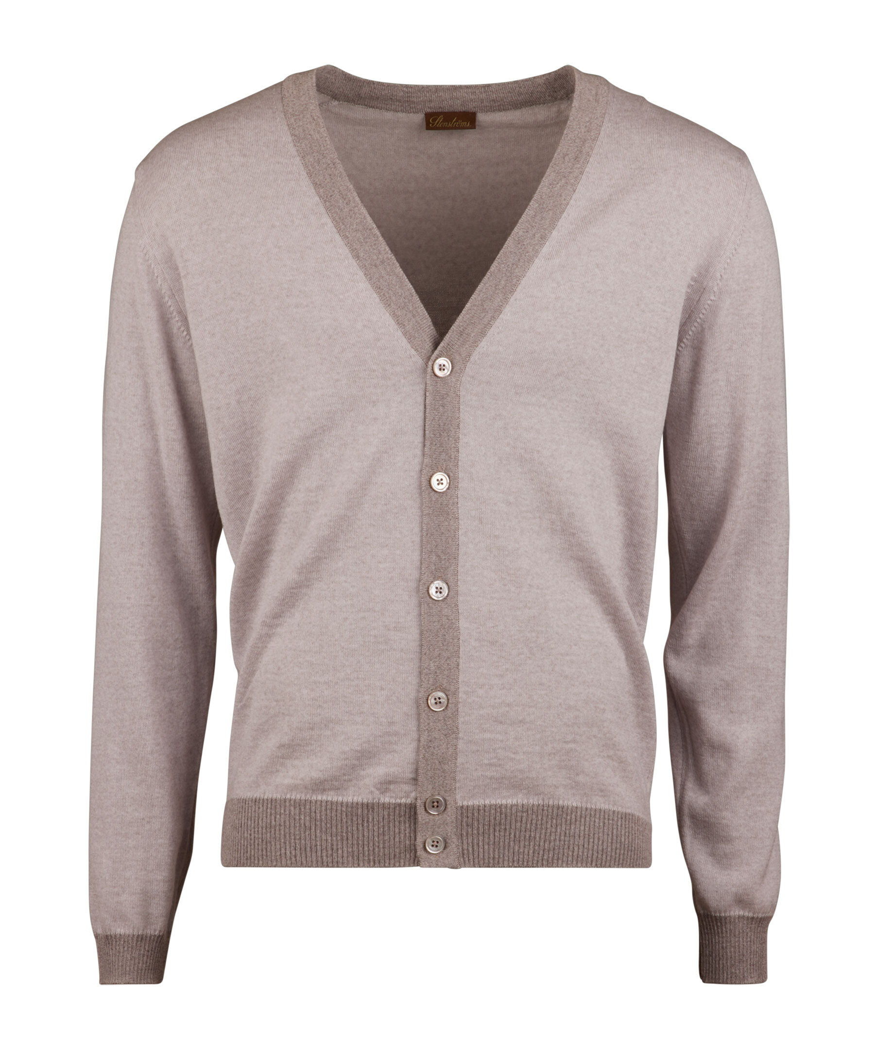 Denna kofta är tillverkad av merinoull och är detaljerad med en moulinékontrast. Koftan har pärlemorknappar och ribbstickade detaljer vid ärm, krage och plaggslut.
