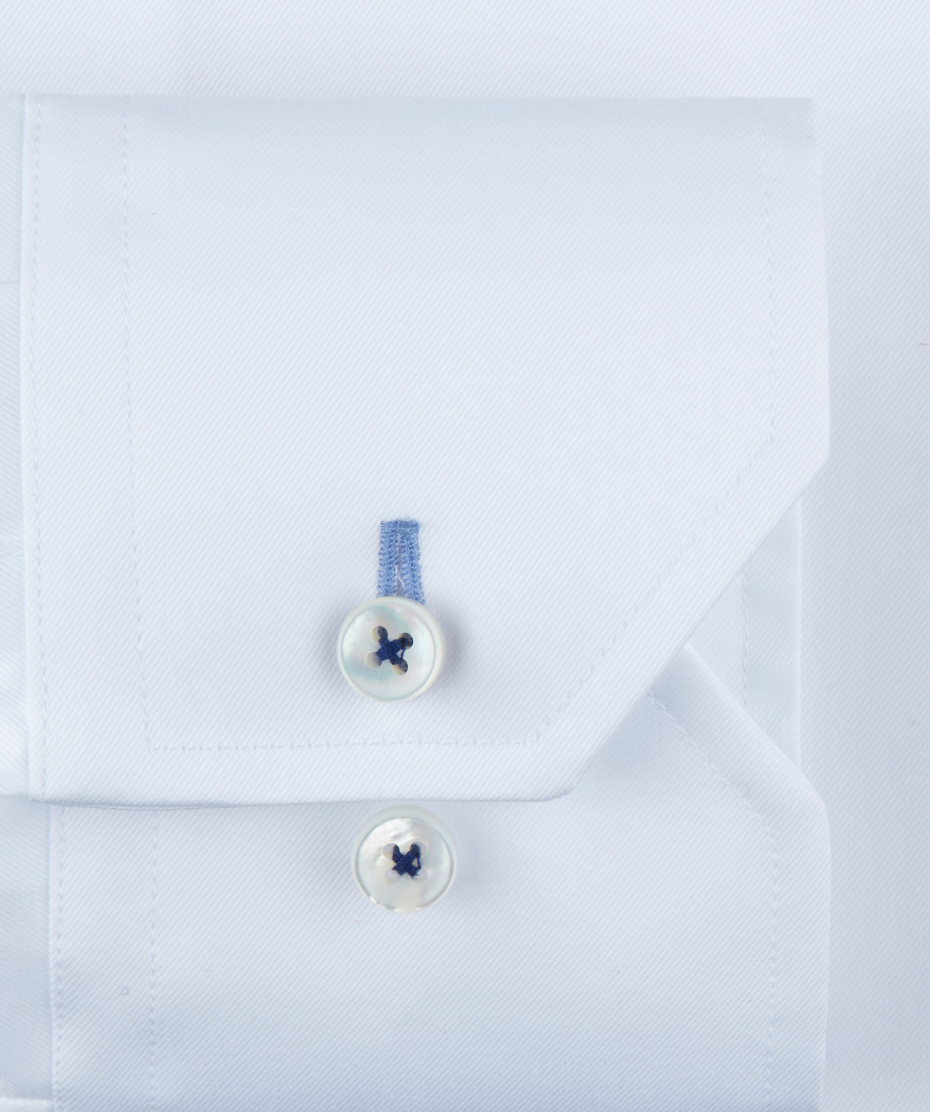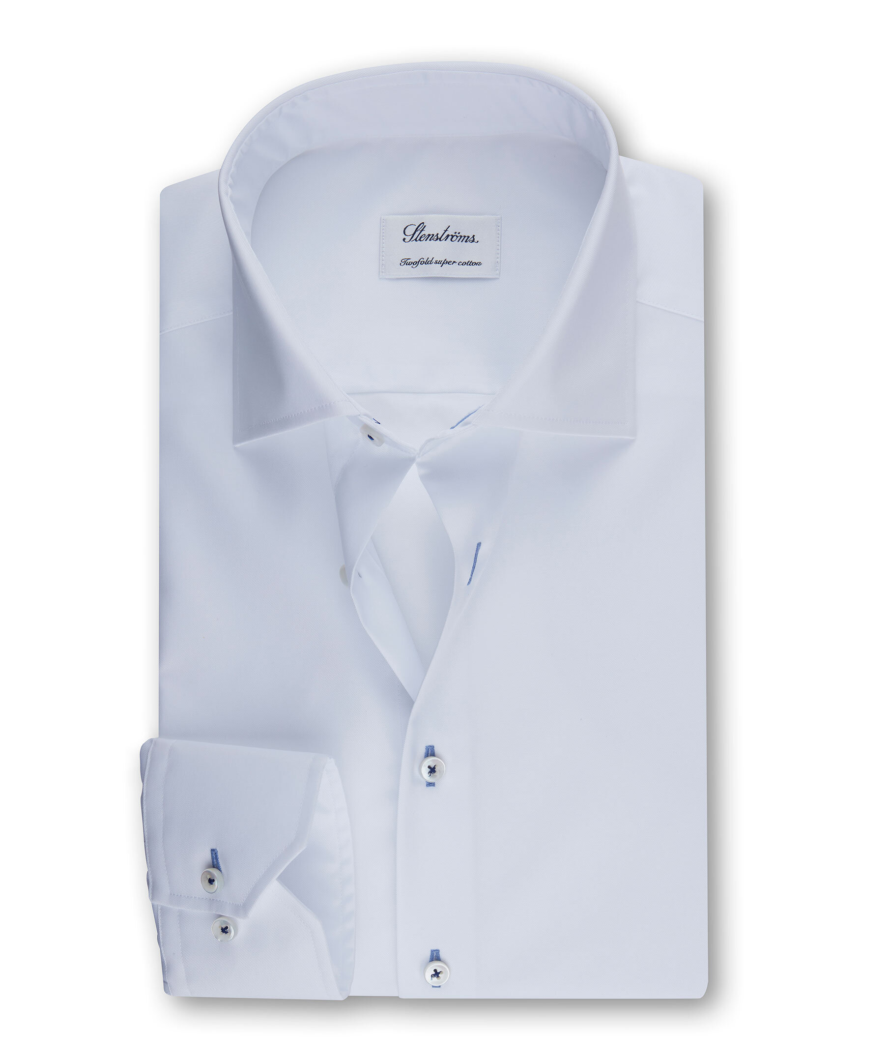 Vit skjorta i en slimline modell. Skjortan är tillverkad av (Twofold) bomull och skuren för en slimmad passform. Skjortan är detaljerad med kontrasterande blåa sömmar, dubbla manschetter, pärlemorknappar och en cut away krage.