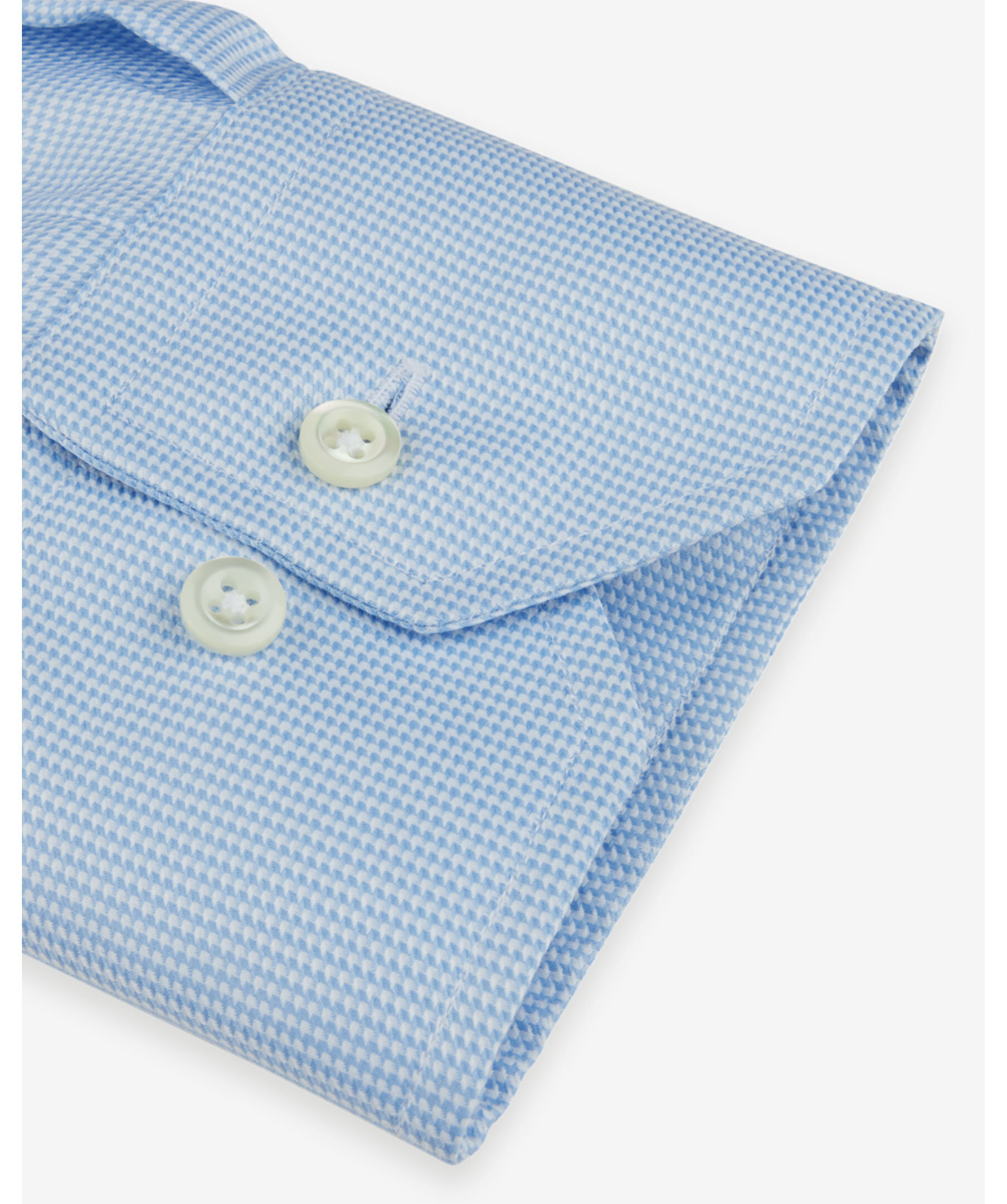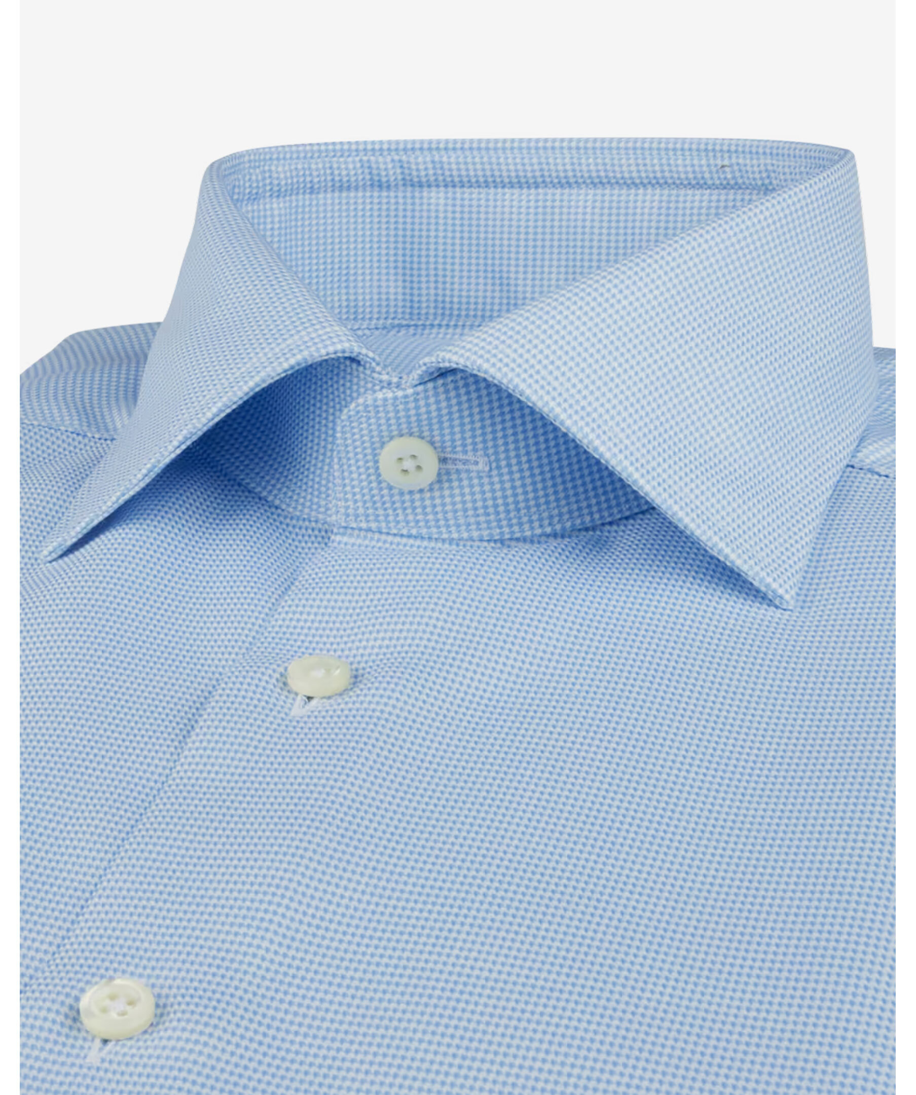 Ljusblå willskjorta är tillverkad av twofold bomull och har ett hundtandsmönster. Skjortan har pärlemorknappar, enkla manschetter och en cut away krage.