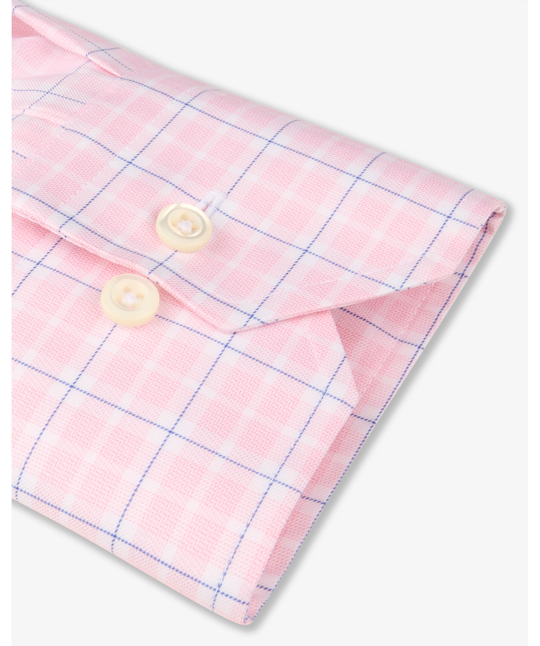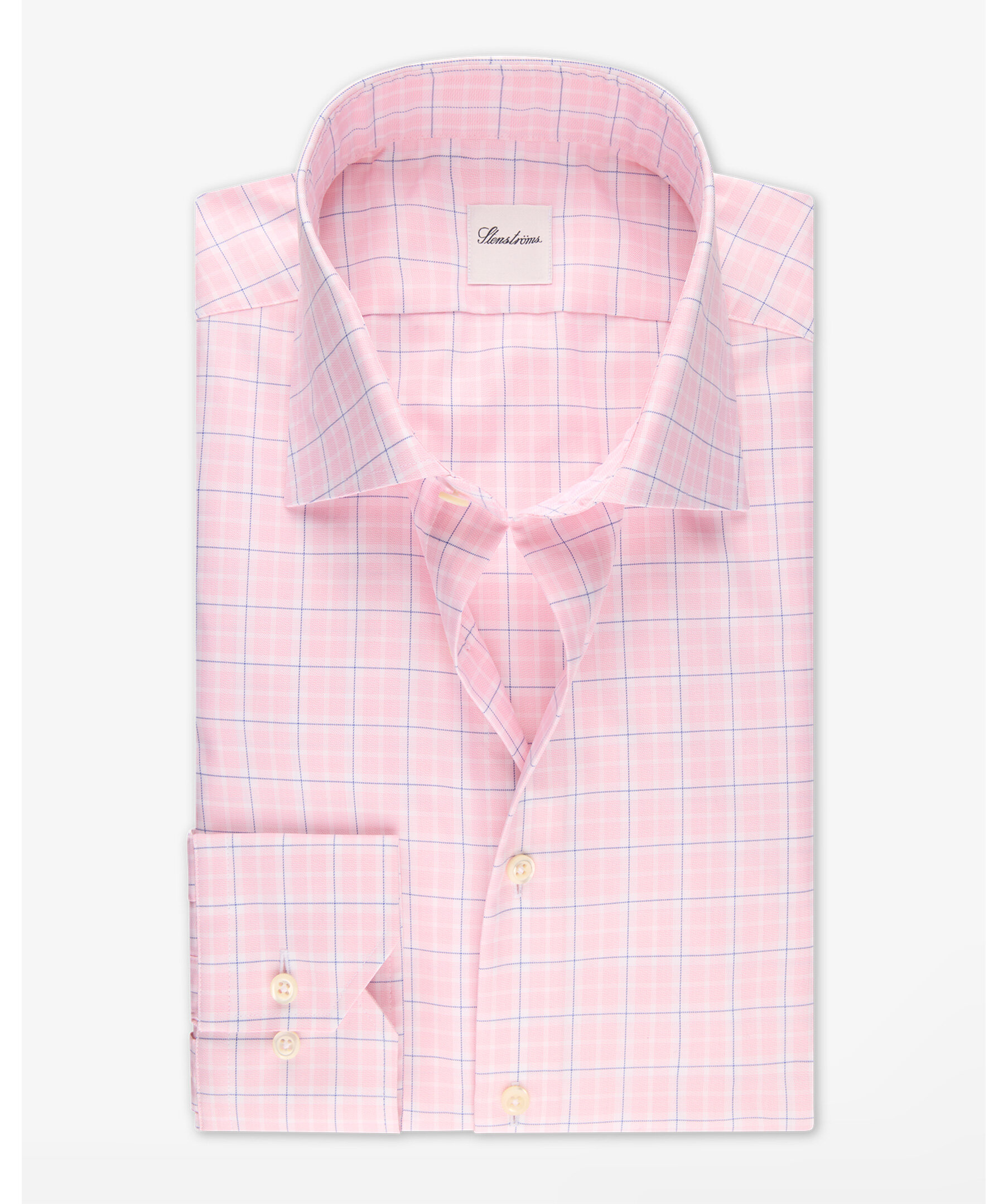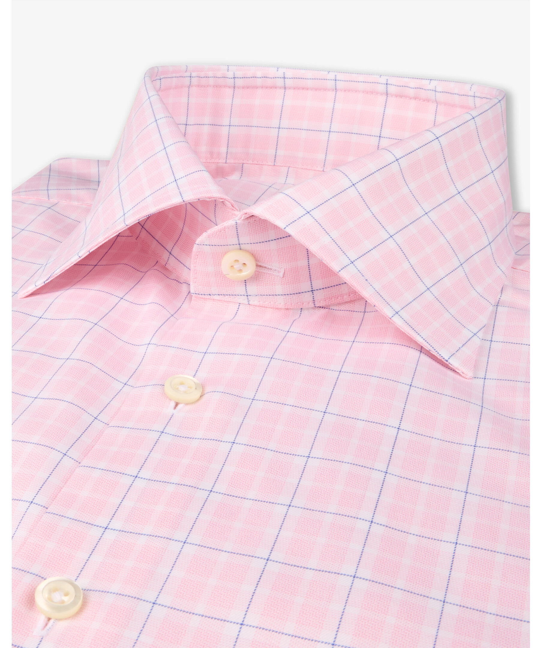 Ljusrosa rutig twillskjorta tillverkad av bomull och har pärlemorknappar, enkla manschetter och en cut away krage.