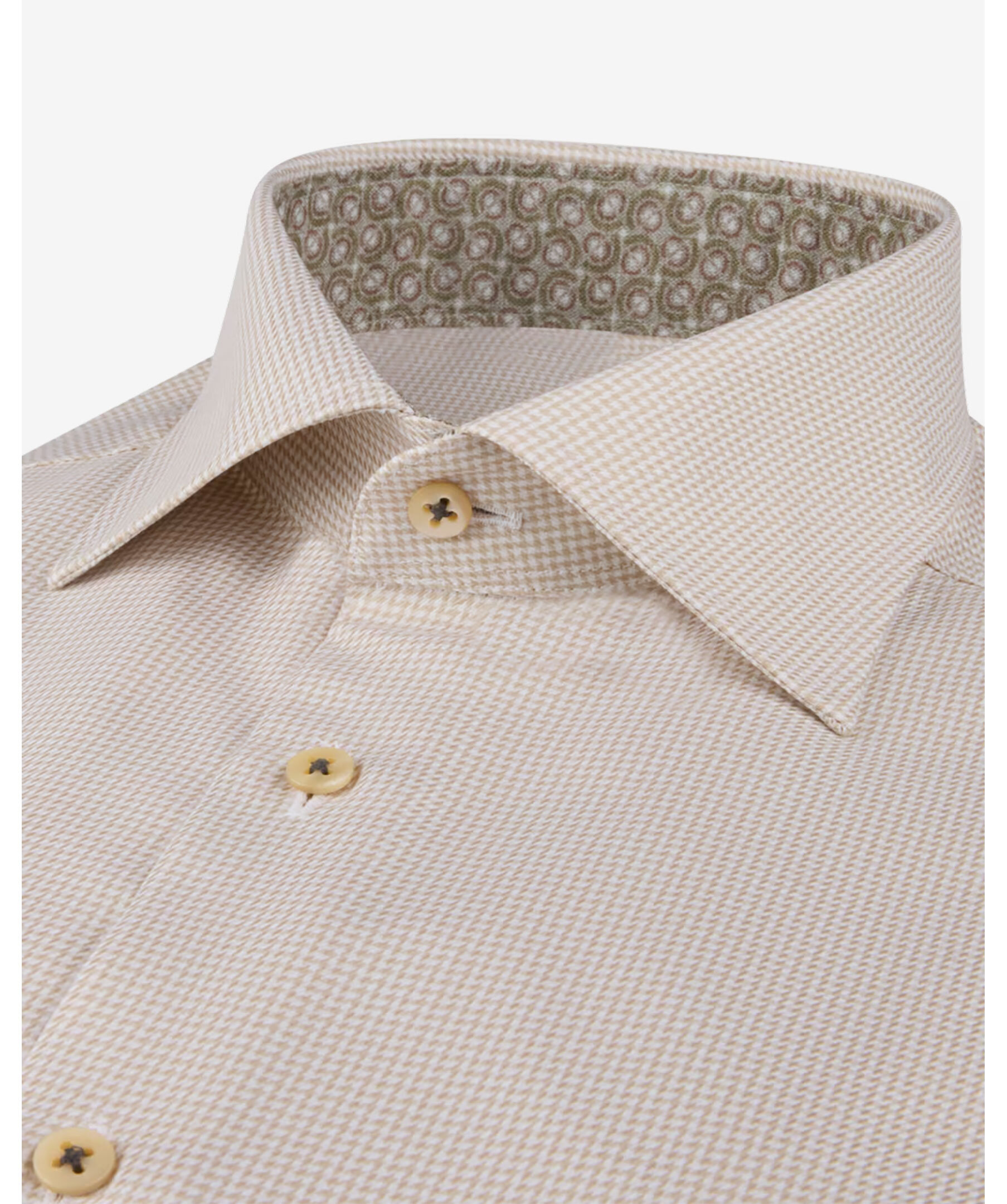 Ljusbeige twillskjorta med kontrast från Stenströms. Skjortan är tillverkad av högkvalitativ twofold bomull, vilket ger en mjuk och behaglig känsla mot huden. Den har en klassisk cut-away-krage och enkla manschetter, vilket gör den mångsidig för både formella och avslappnade tillfällen.