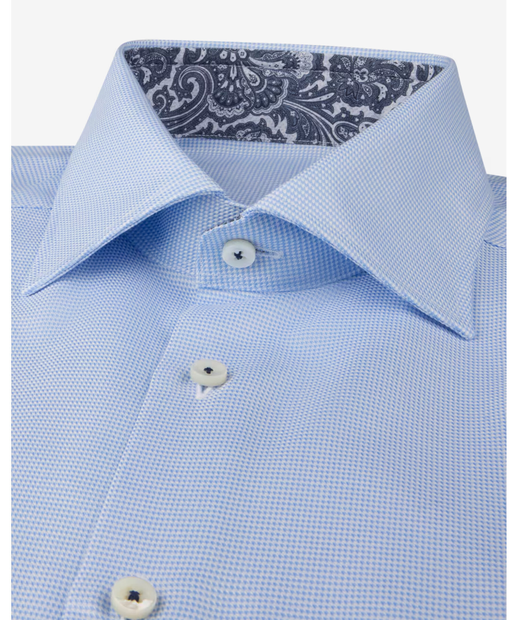 Skjortan har pärlemorknappar, enkla manchetter och en cut away krage.