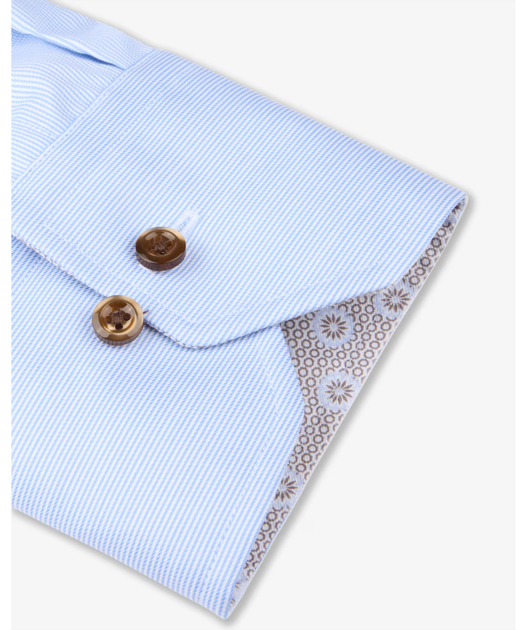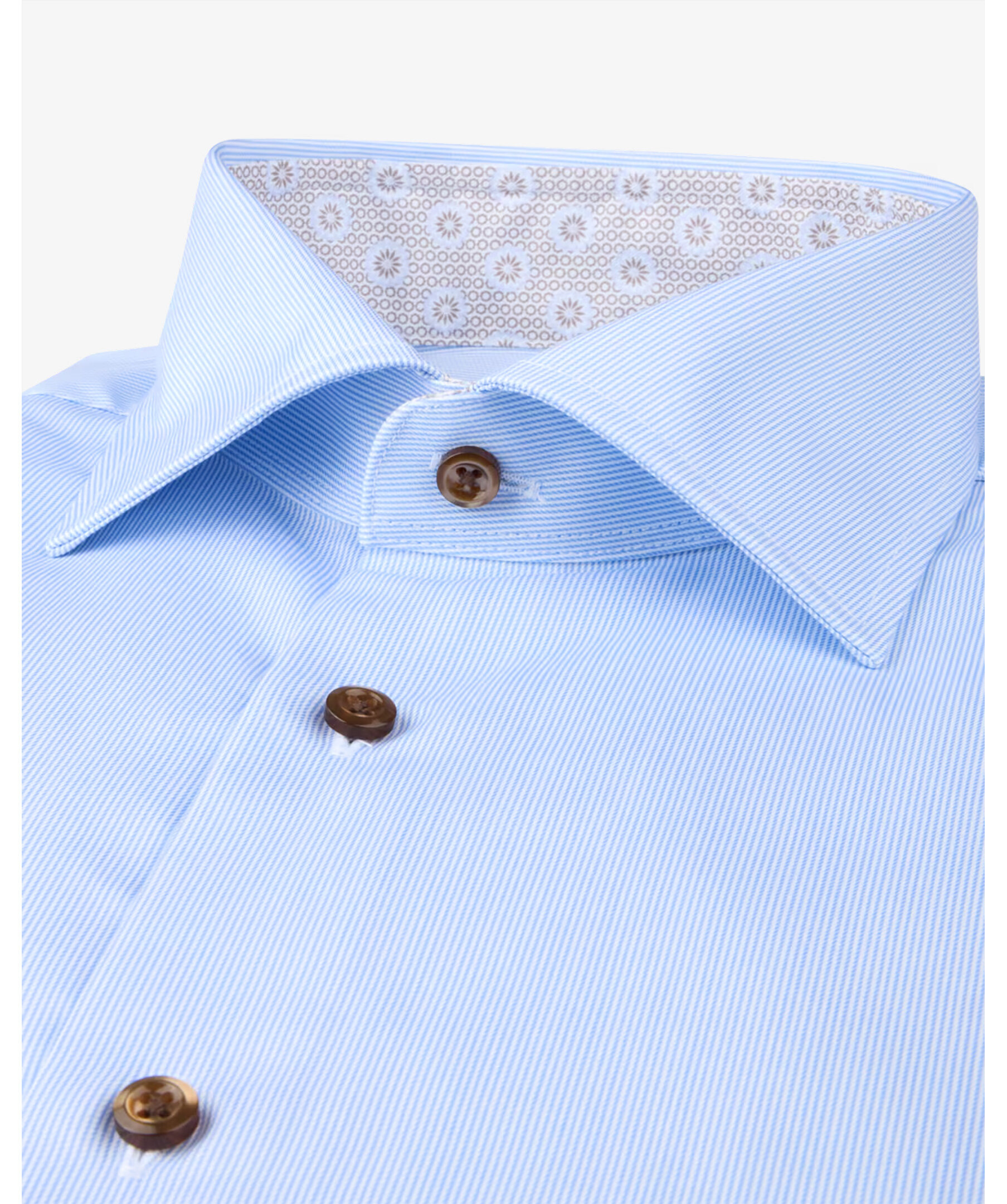 Ljusblå twillskjorta är tillverkad av twofold bomull och har kontrast i krage och manschett. Skjortan har pärlemorknappar, enkla manchetter och en cut away krage.