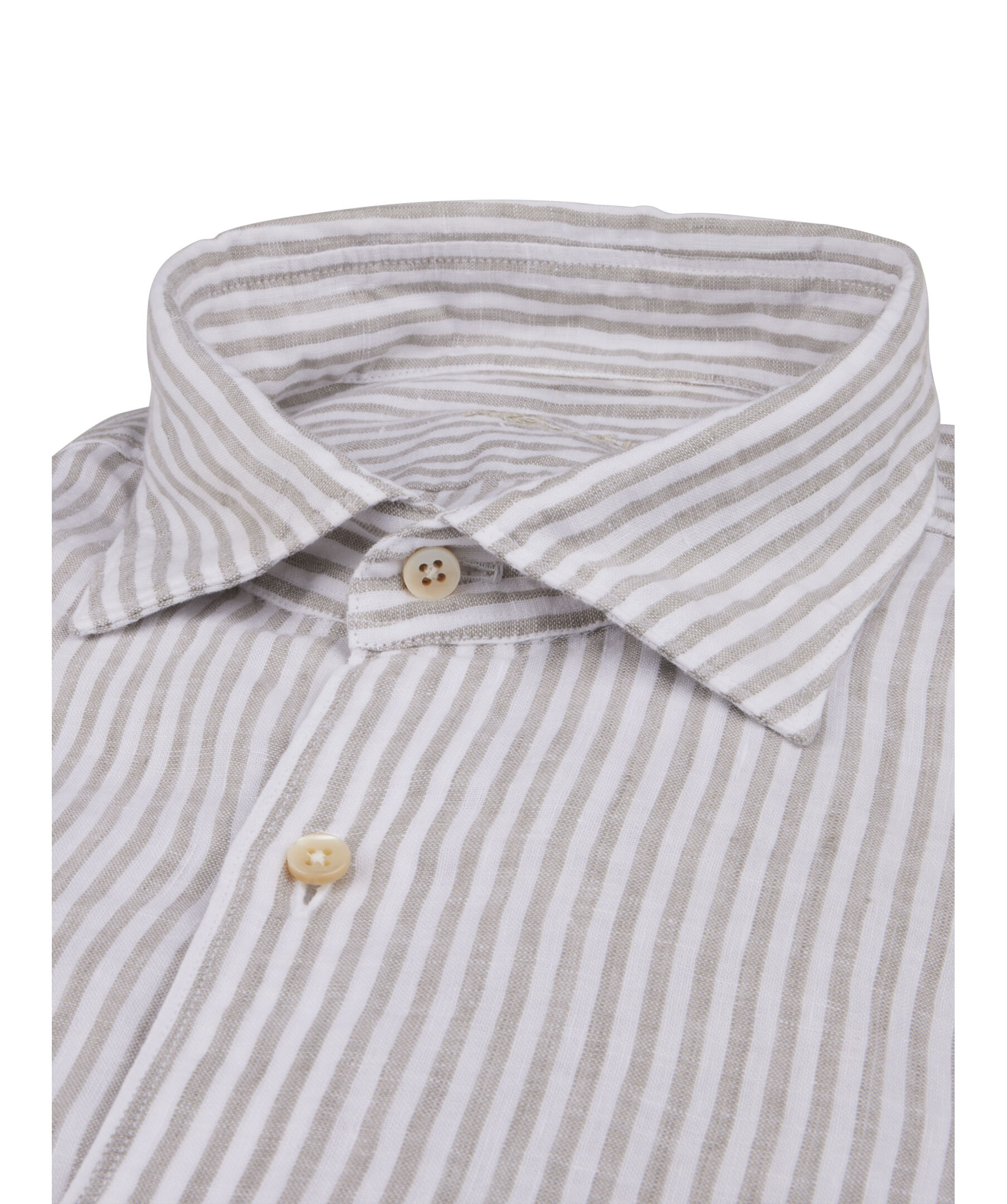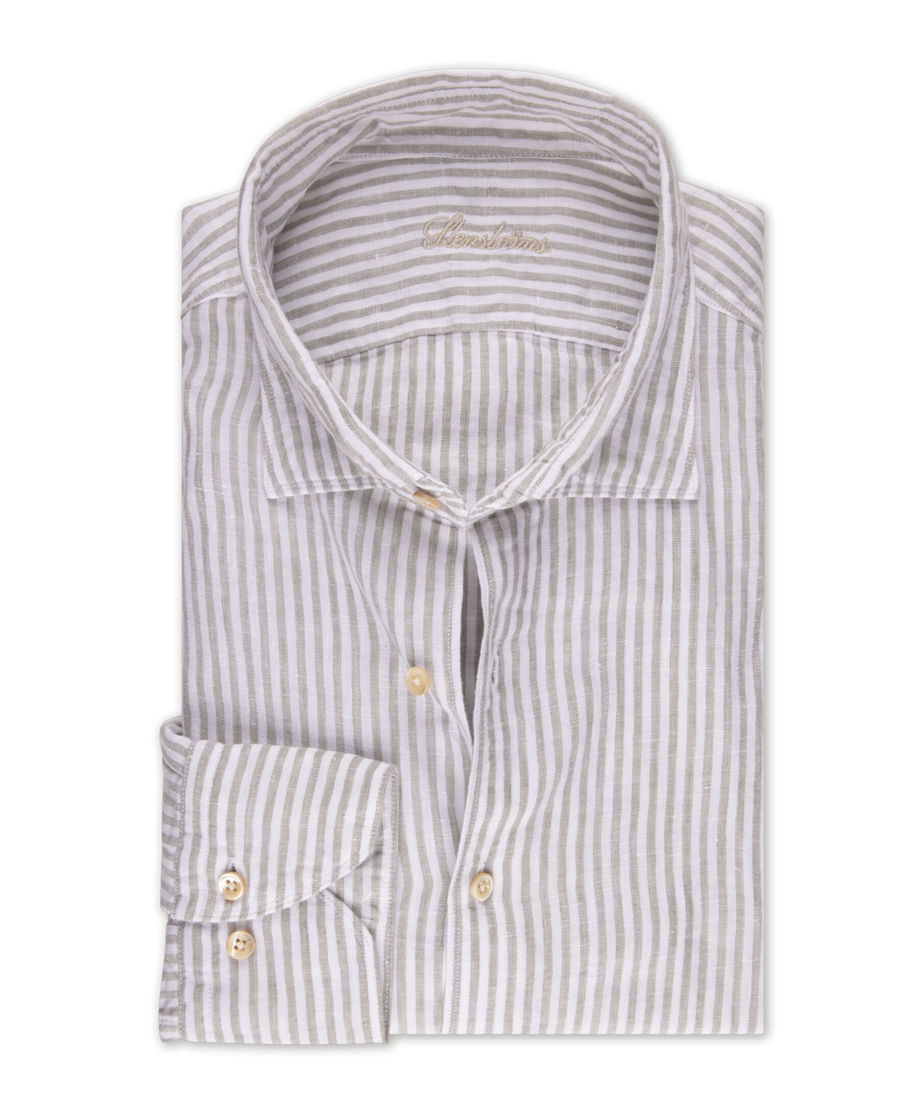 Denna randiga skjorta är tillverkad av linne och har pärlemorknappar, enkla manschetter och en cut away krage.