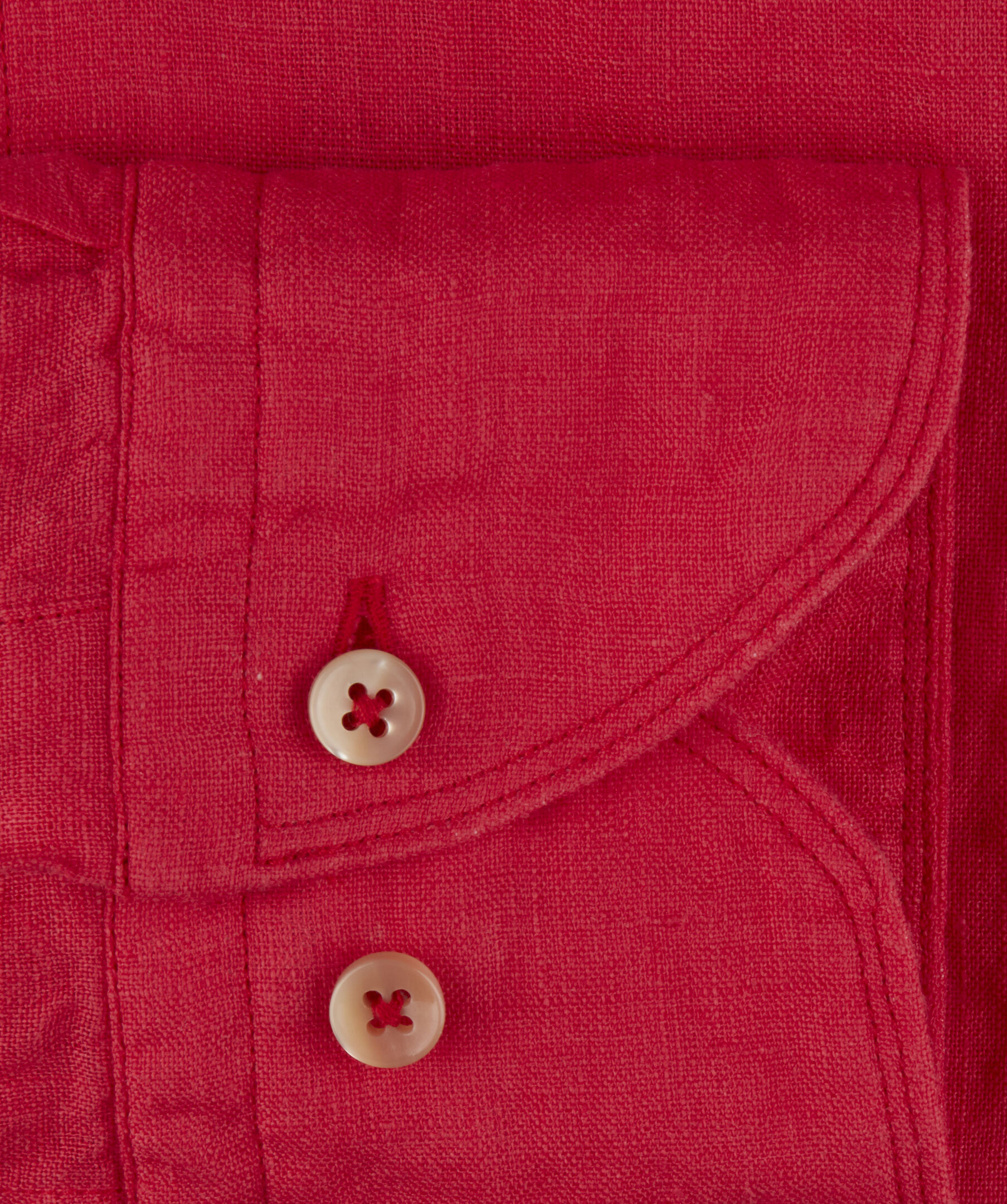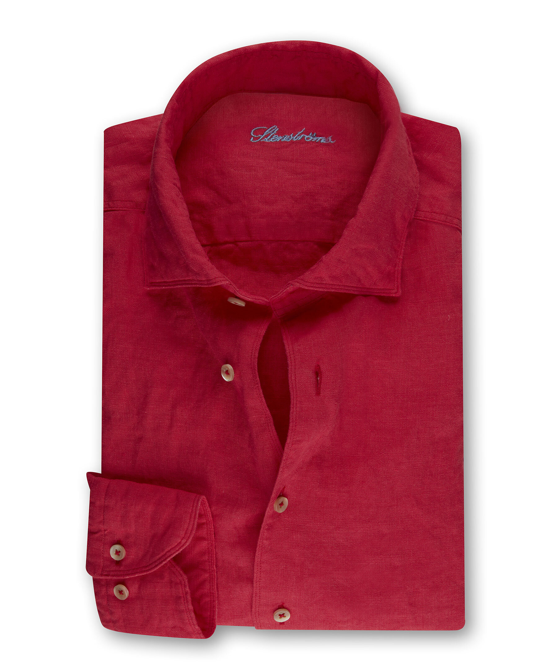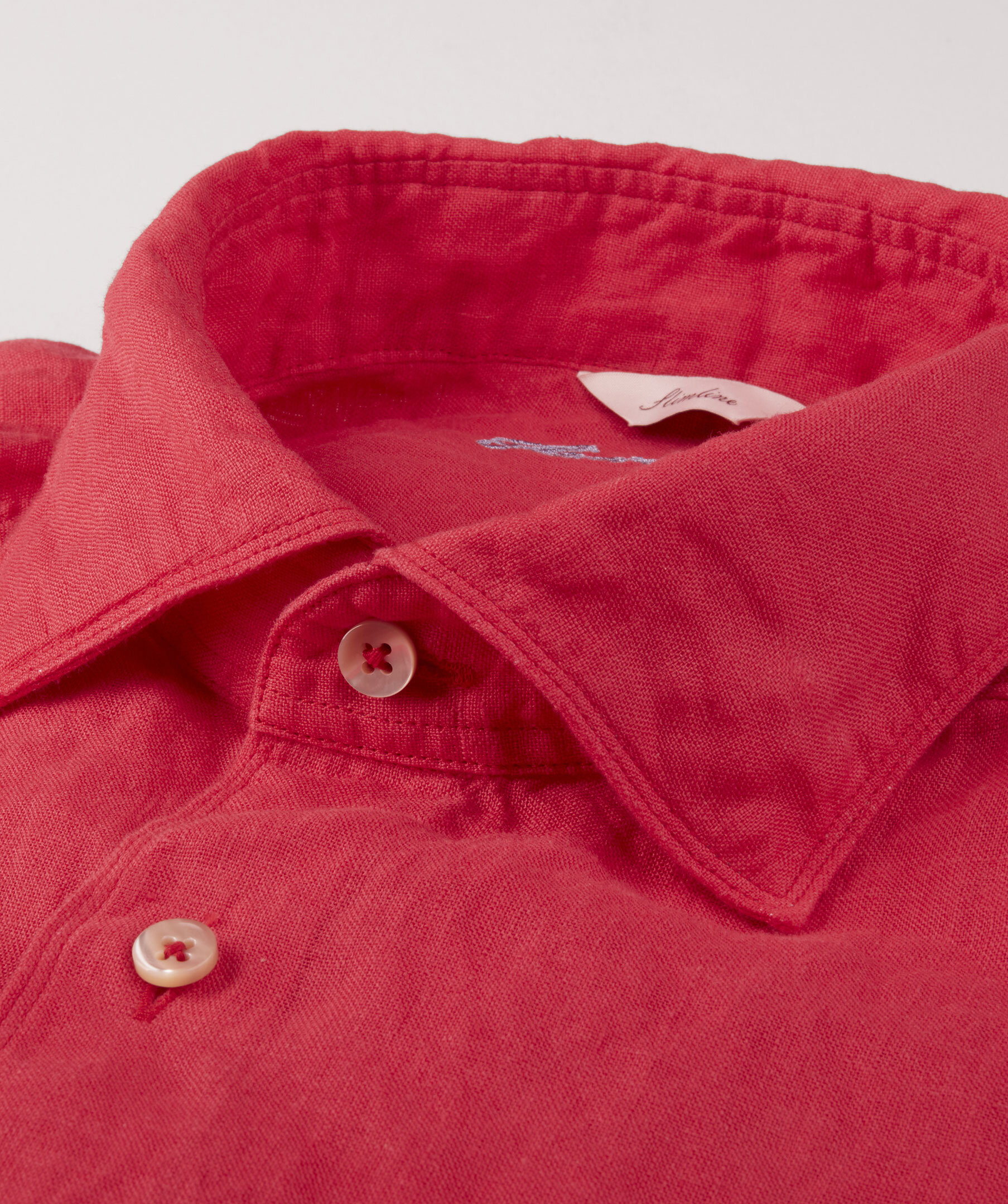 Röd skjorta, i slimline, tillverkad i linne. Detaljerad med pärlemorknappar, enkla manschetter och en cutaway krage.