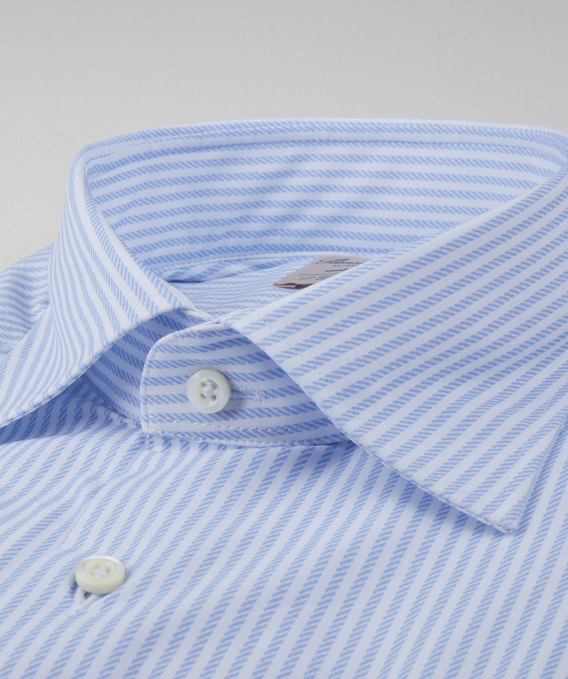 Casual ljusblå jerseyskjorta, med en slimline passform, tillverkad i polyamide och elastan. Skjortan är designad med ett randigt mönster, pärlemorknappar, enkla manschetter samt med en krage i modell cutaway.