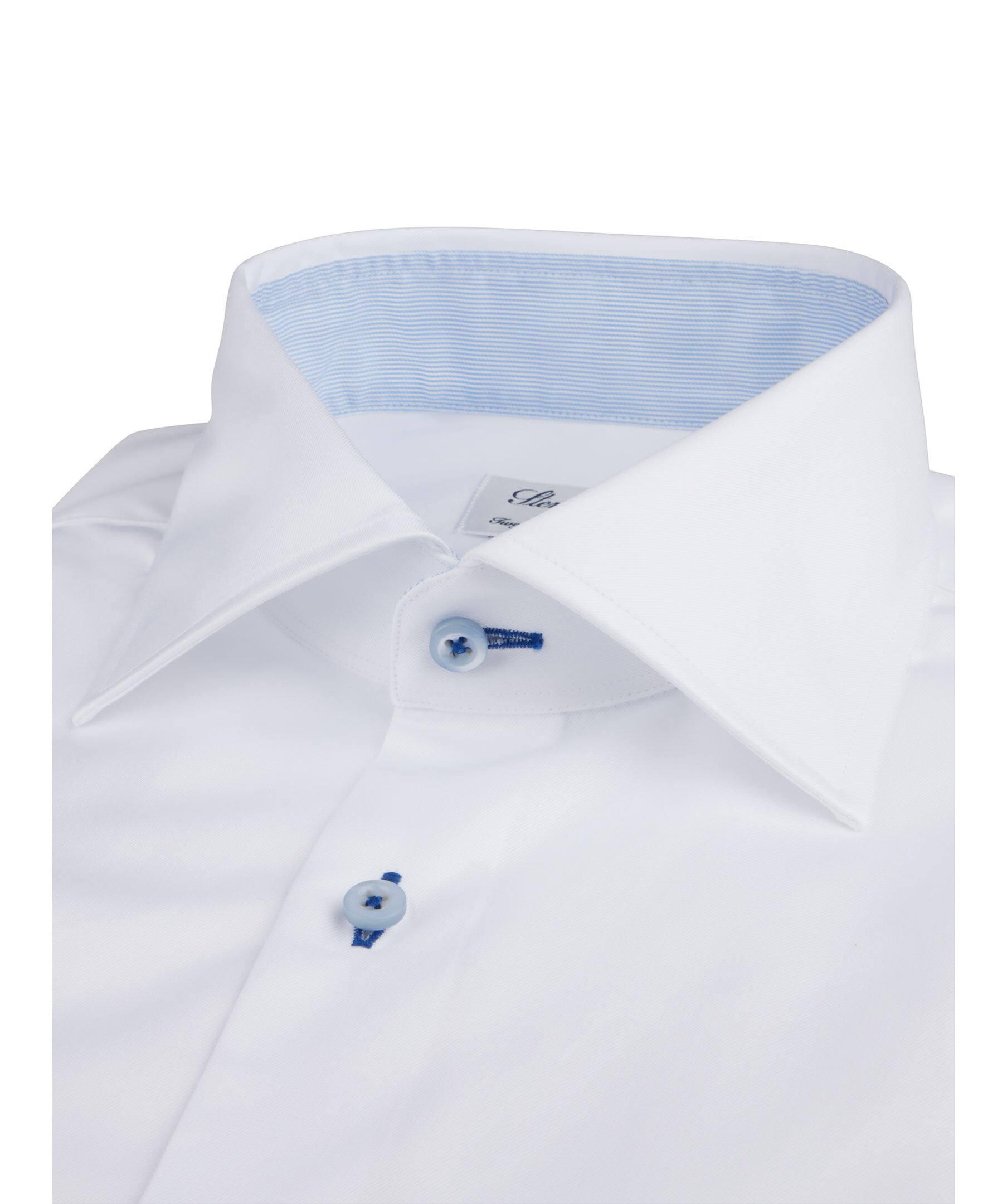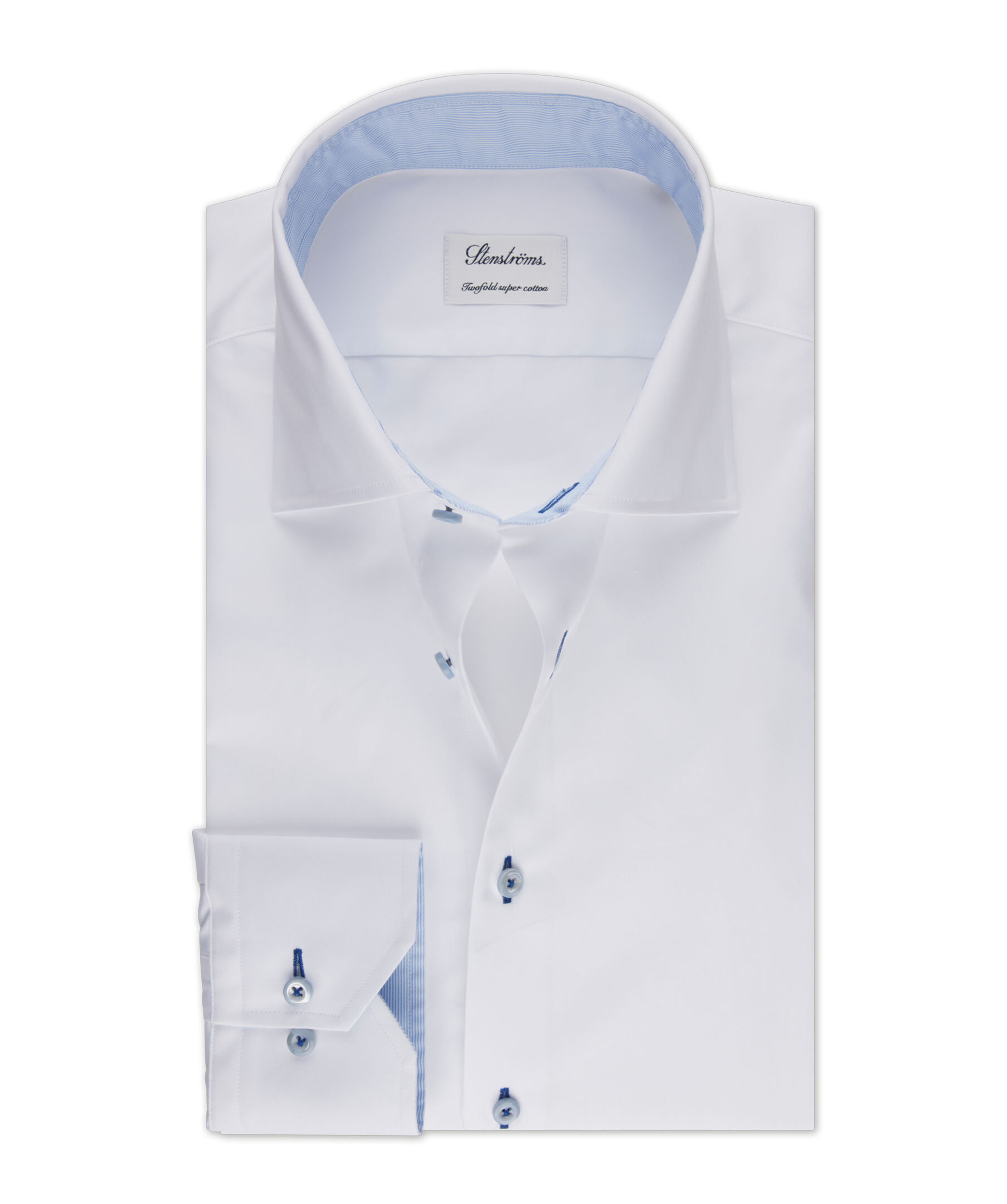 Denna Slimline twillskjorta är tillverkad av twofold bomull och har en kontrast i krage och manschett. Skjortan har marinblå knappshål, pärlemorknappar, enkla manschetter och en cut away krage.
