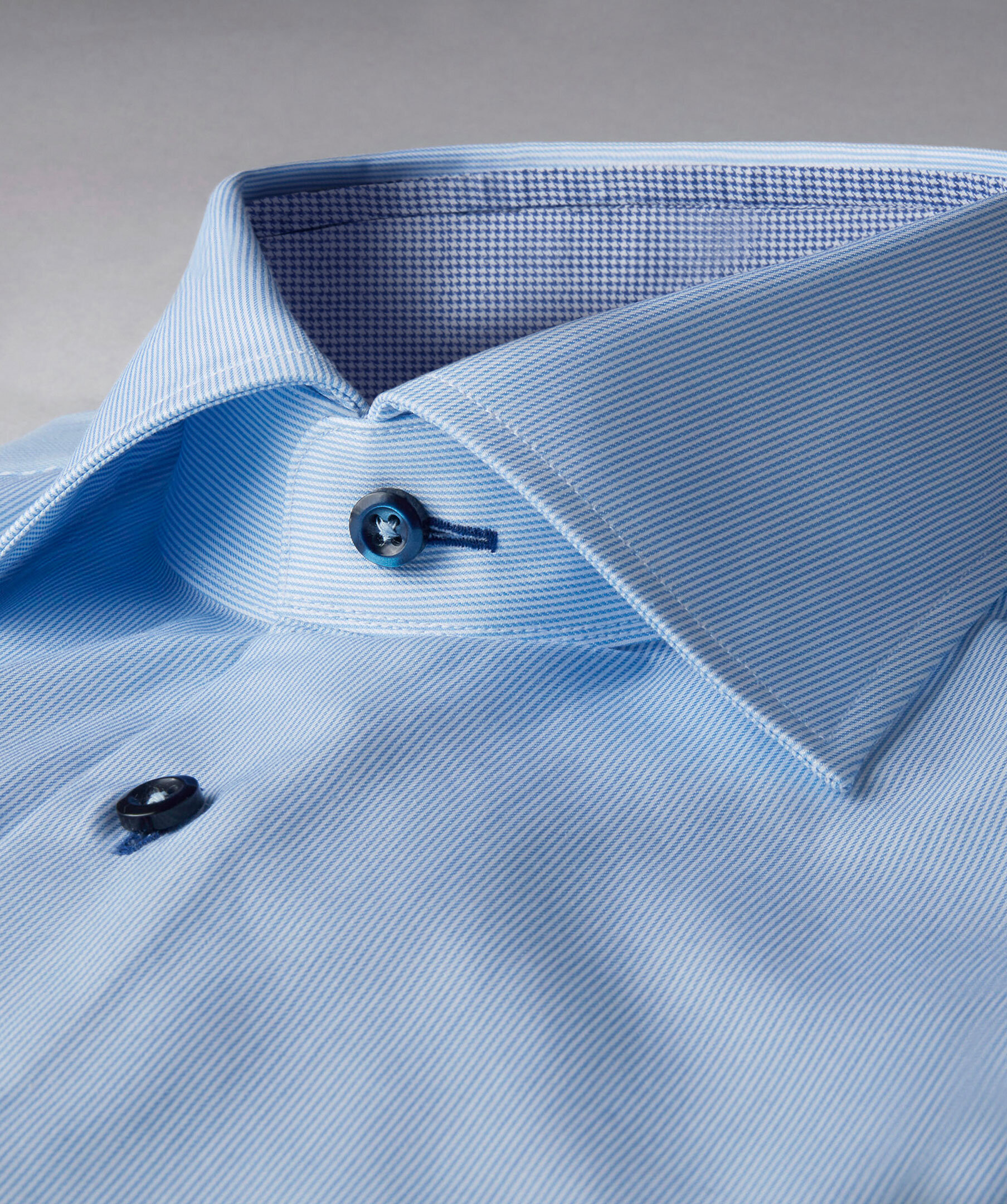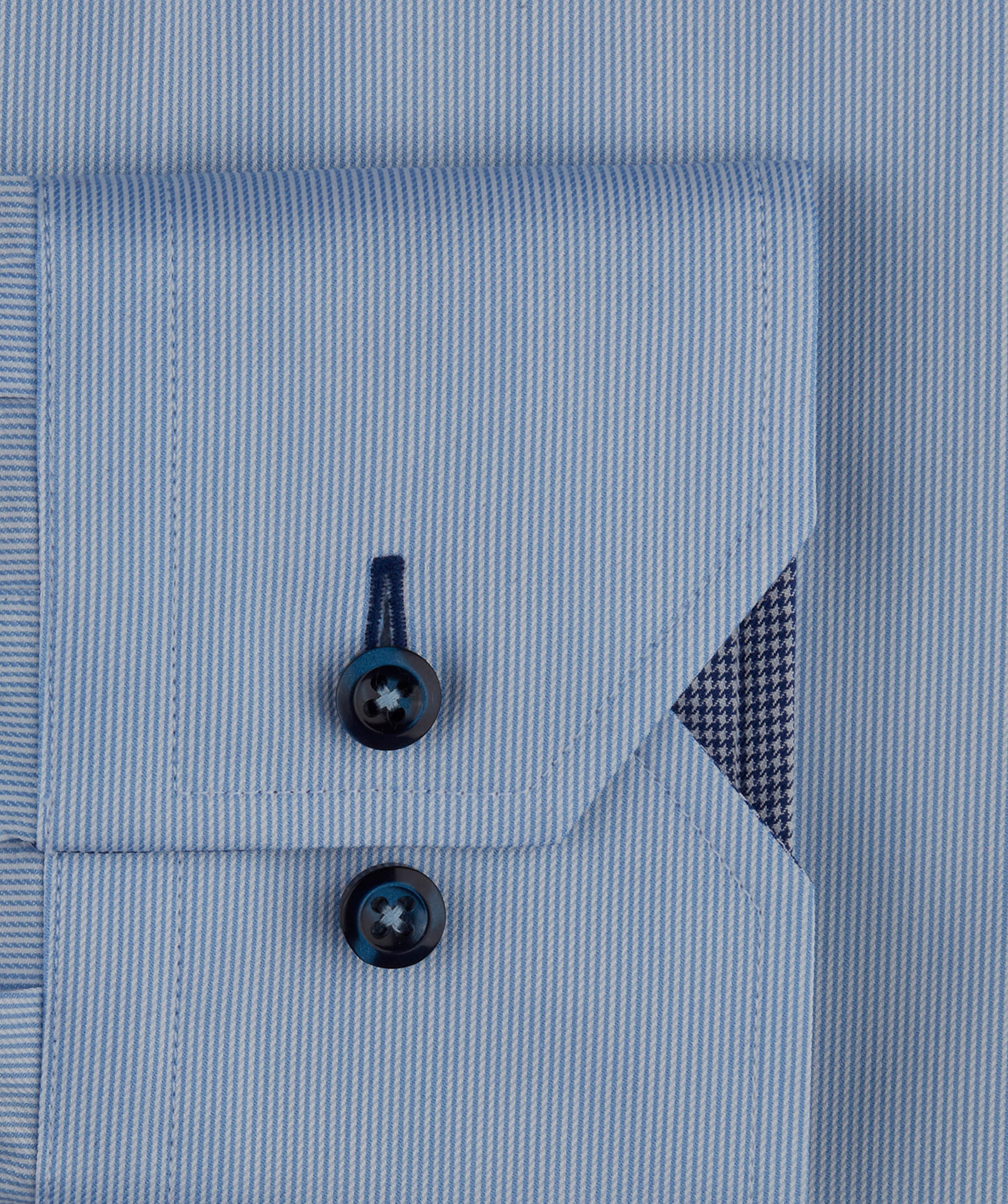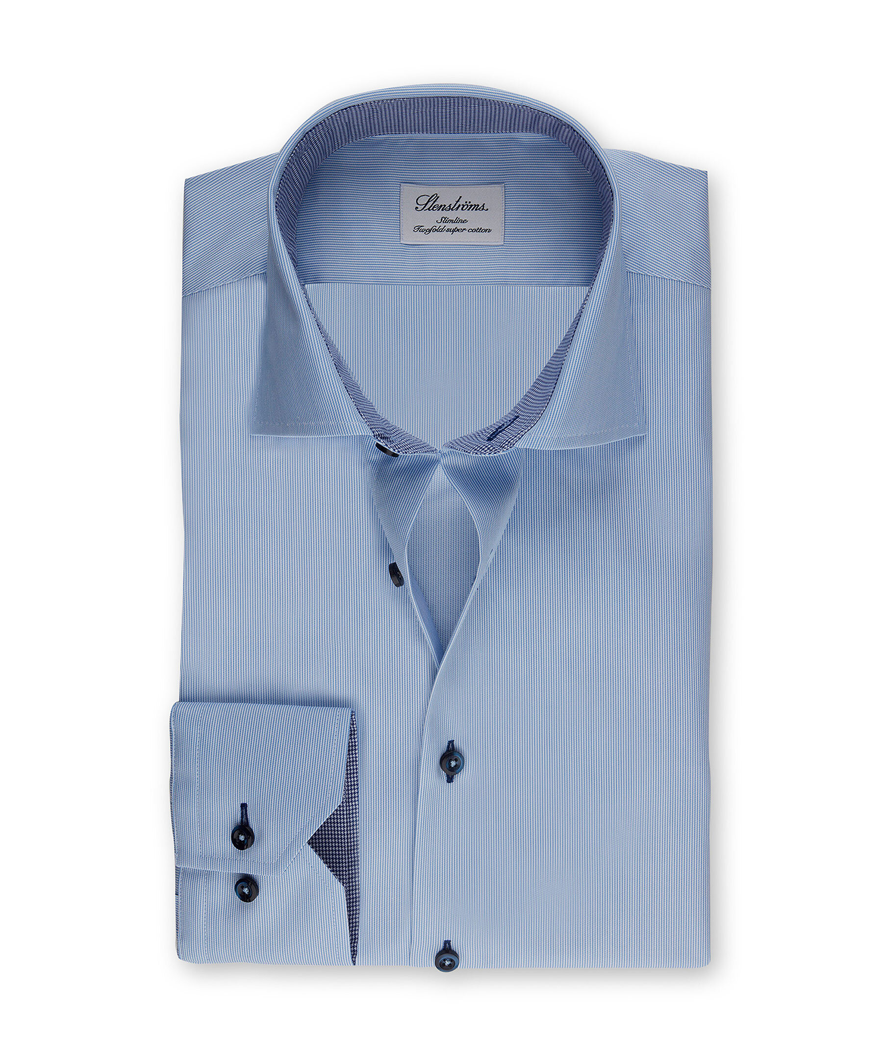 Denna ljusblåa randiga skjorta från Stenströms är i fitted body och gjord av twofold twill, med en något skräddarsydd modell. Den har kontrast i krage och manschett i ett blått hundtandsmönster, marinblåa sömmar runt knapphålen, enkla manschetter, marinblå pärlemoknappar och en cut away krage.