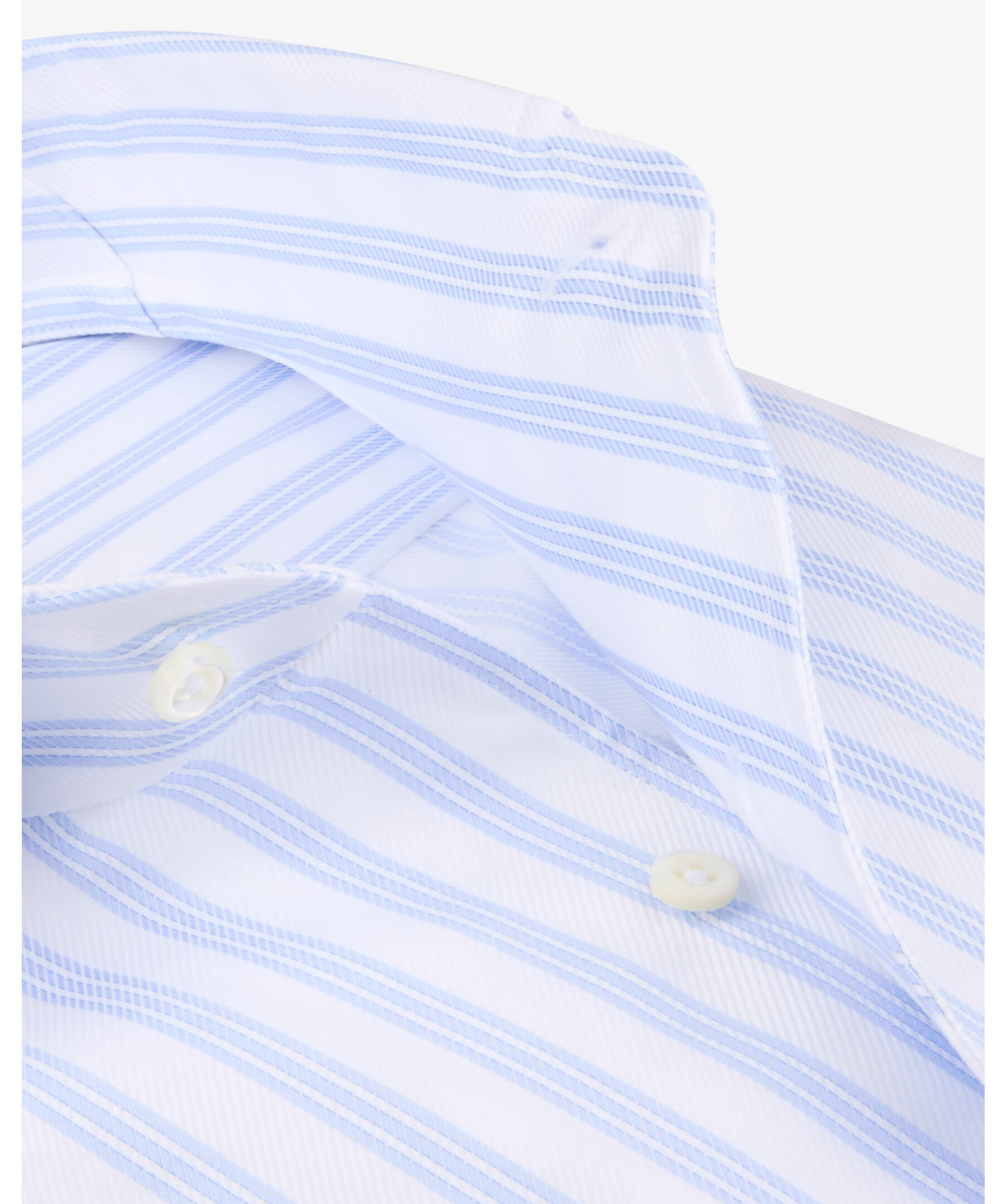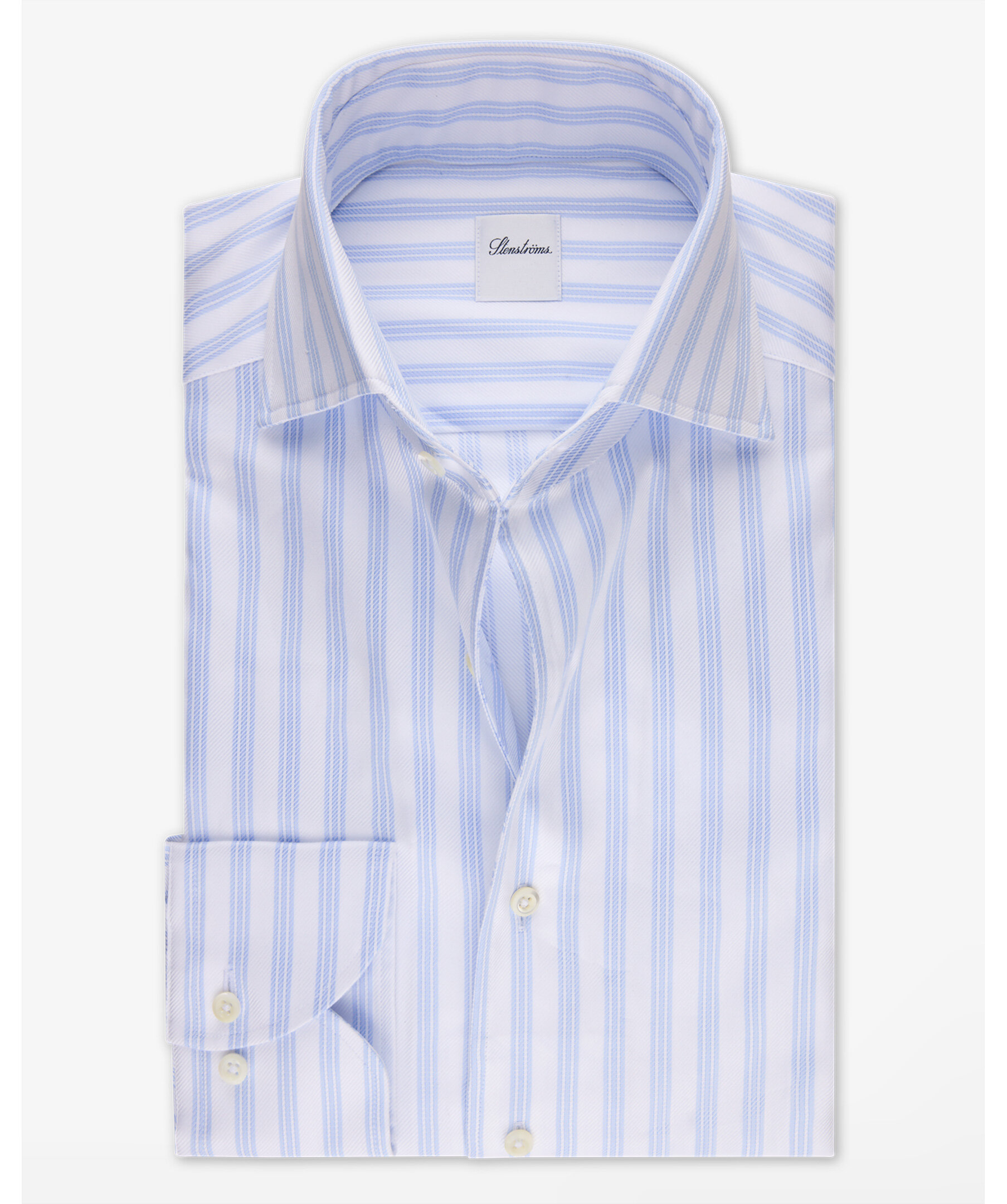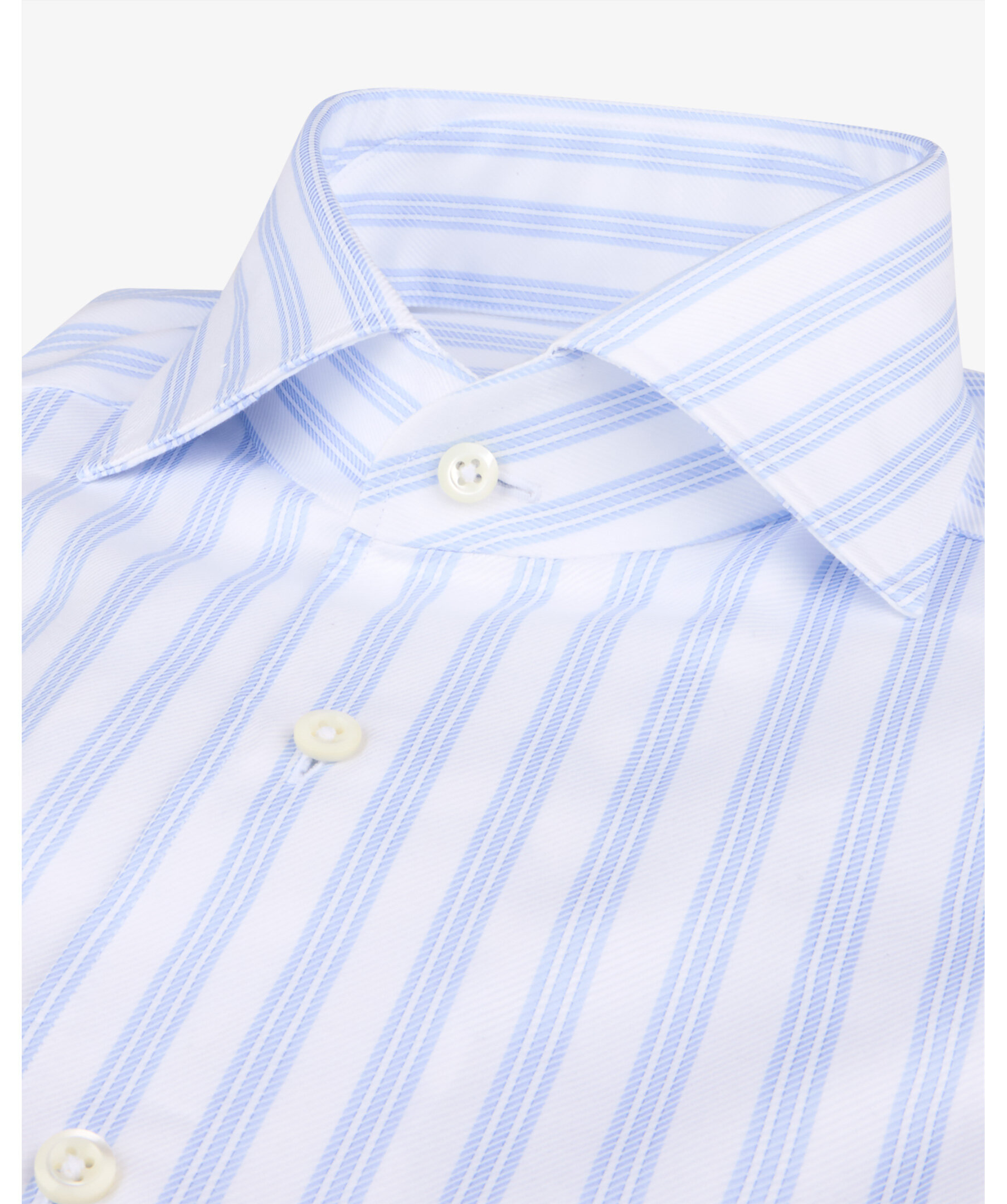 Randig twillskjorta är tillverkad av twofold bomull. Skjortan har pärlemorknappar, enkla manschetter och en helskuren krage.