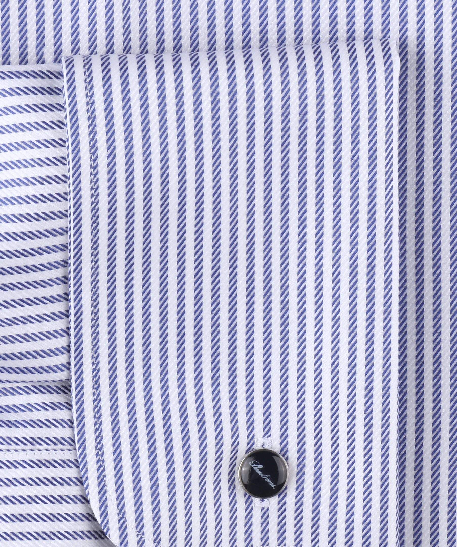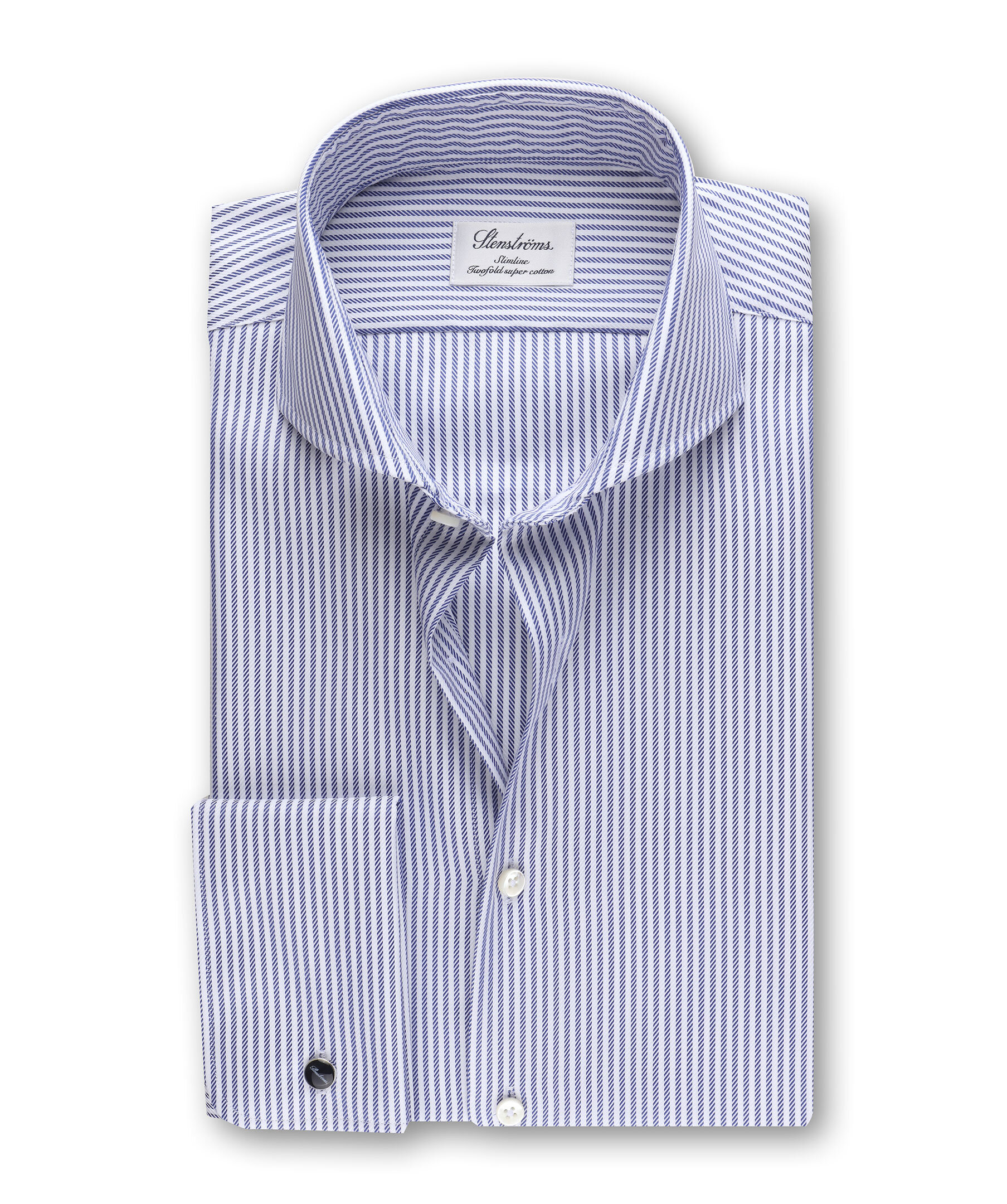 Skjorta i modell Slimline tillverkad i mjuk och följsam dubbeltvinnad (twofold) superior twill med textur och ett vävt randigt mönster i vitt och blått. Skjortan har en krage i modell cut away, dubbla manschetter och vita tjocka knappar i pärlemor. Bär den som den är eller under en finstickad tröja.