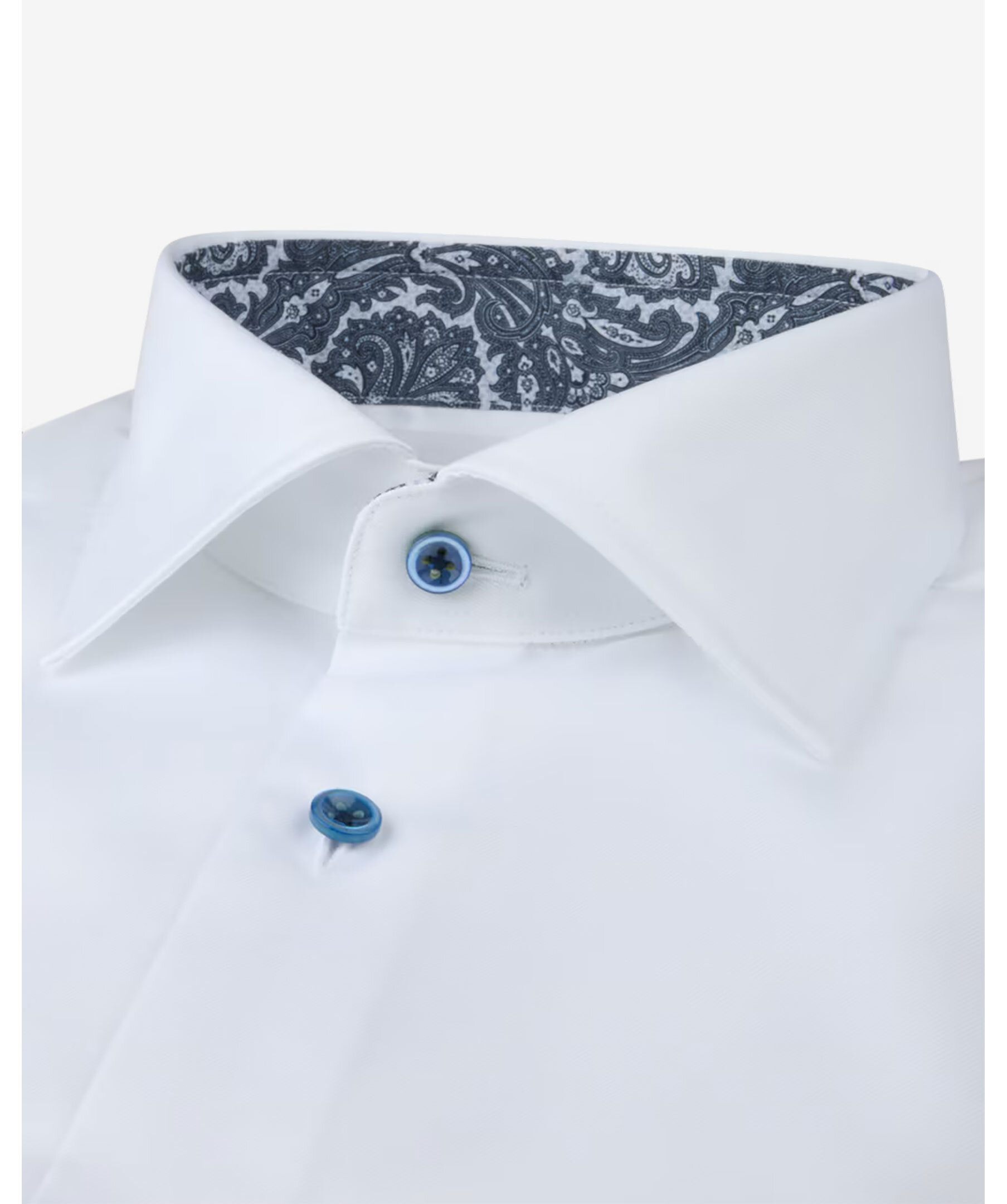 Skjortan har pärlemorknappar, enkla manchetter och en cut away krage.