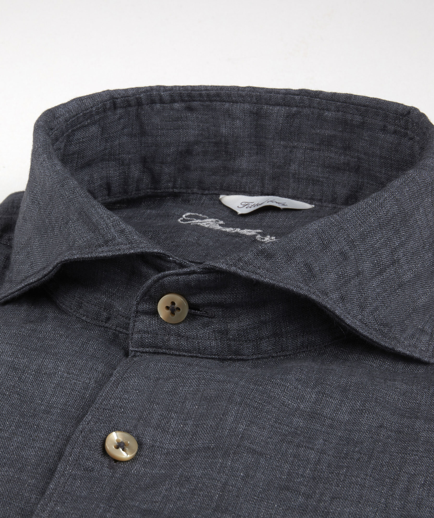 Grå casual linneskjorta med smal passform. Tillverkad i linne med beige pärlemorknappar, enkla manschetter och krage i modell cutaway.