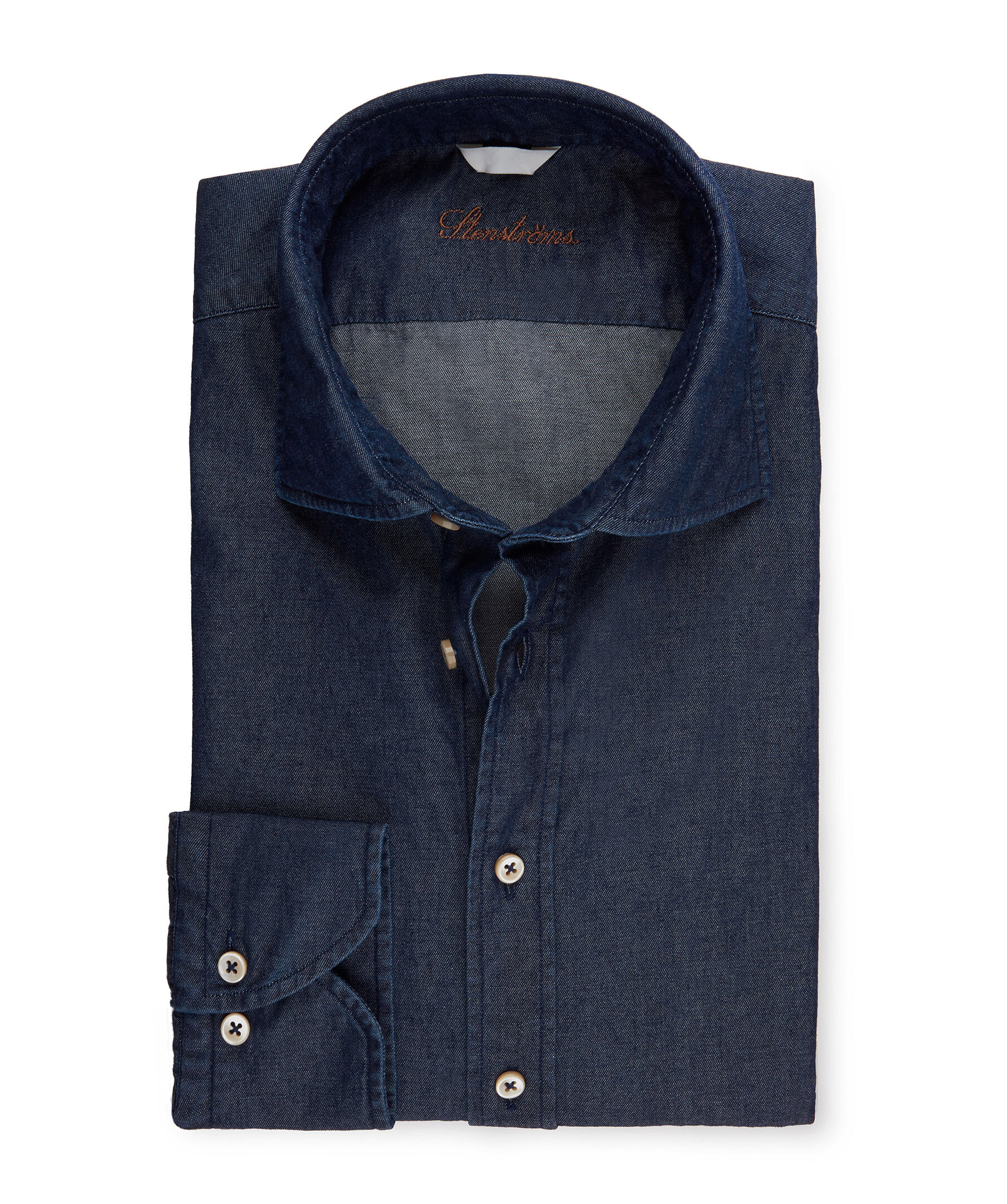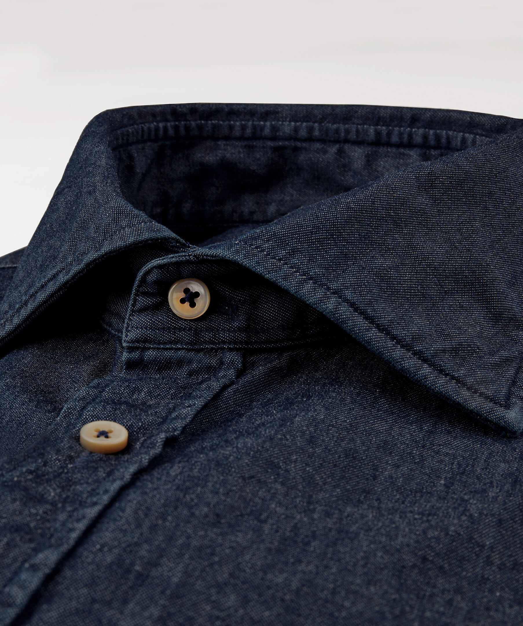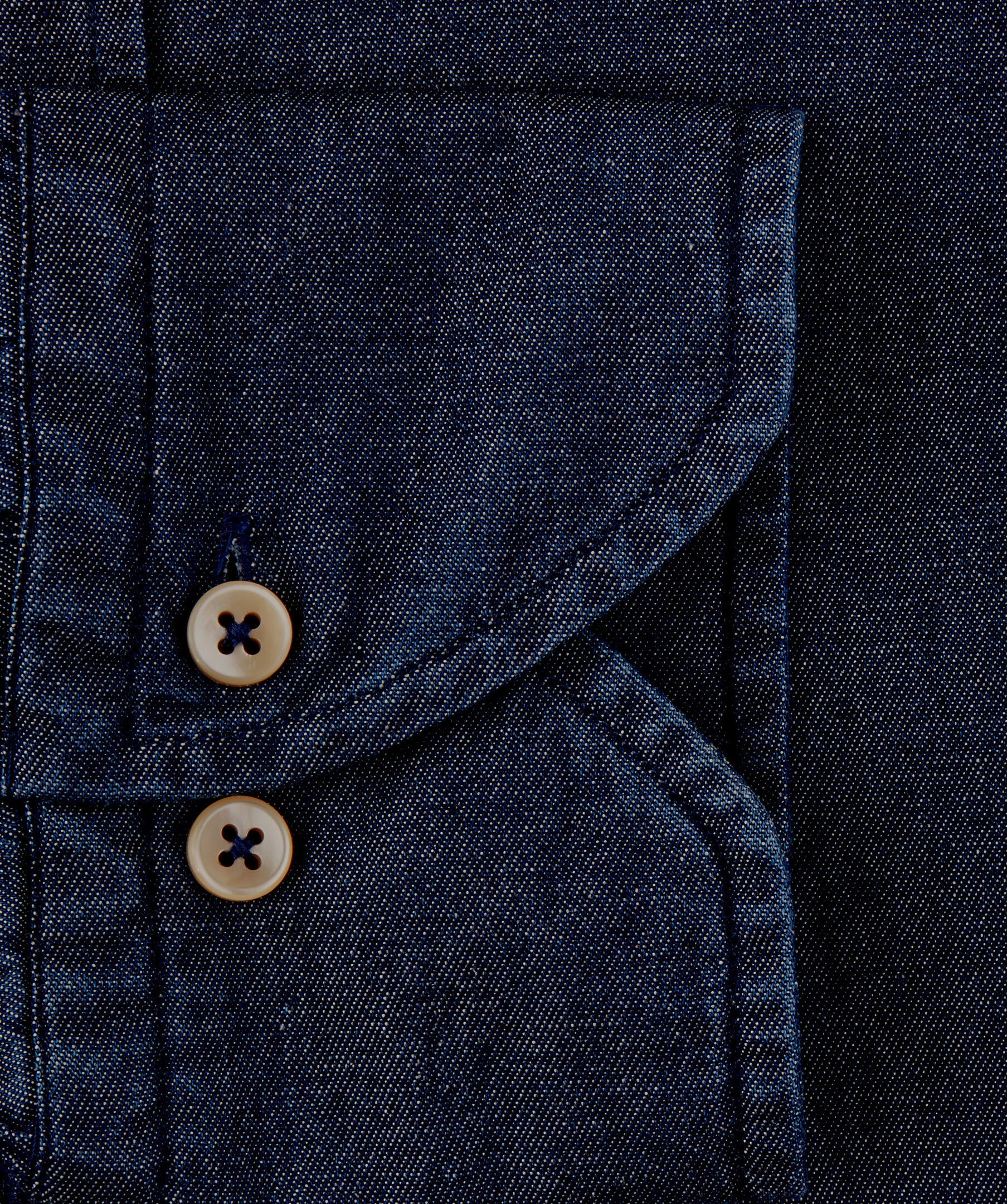 Denimblå skjorta med smal och bekväm passform. Detaljerad med beige knappar och något rundad fåll vilket gör den perfekt att ha både istoppad i ett par byxor eller utanför för en mer avslappnad stil. Bär till ett par beigea eller olivgröna chinos för en avslappnad kontorslook.