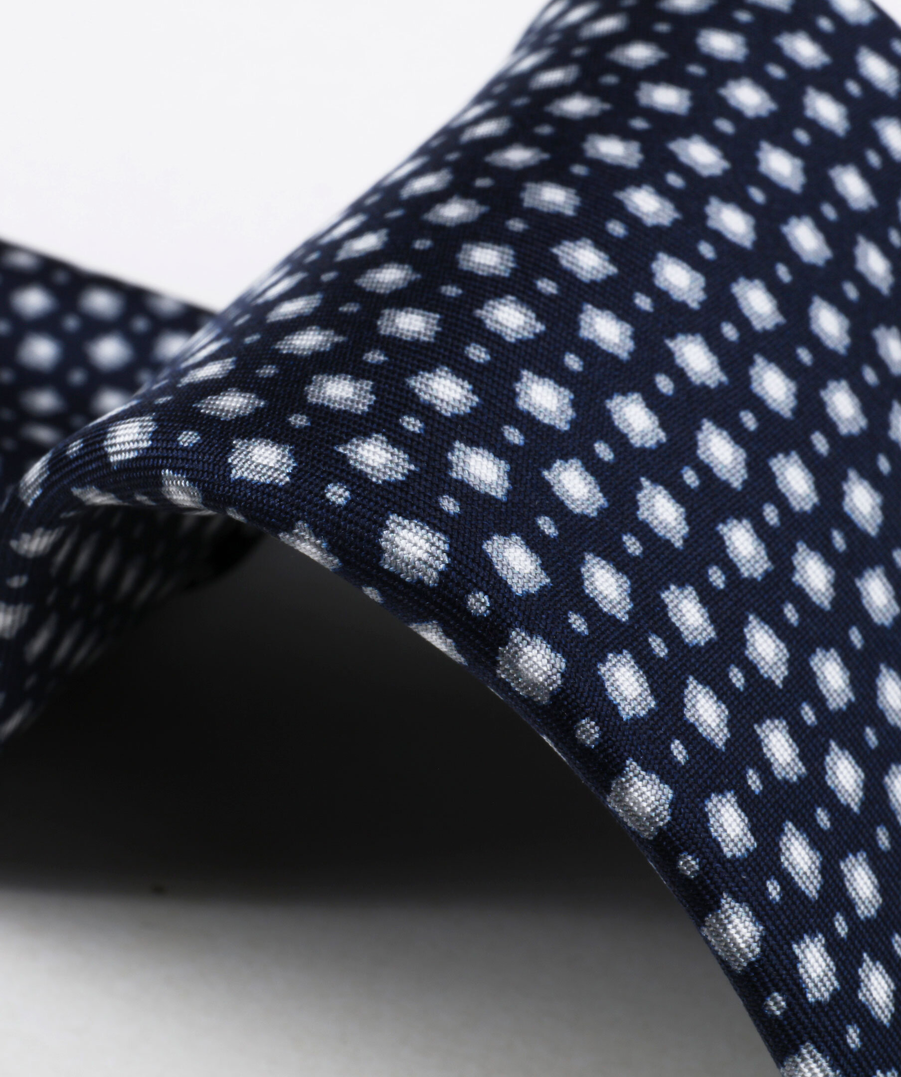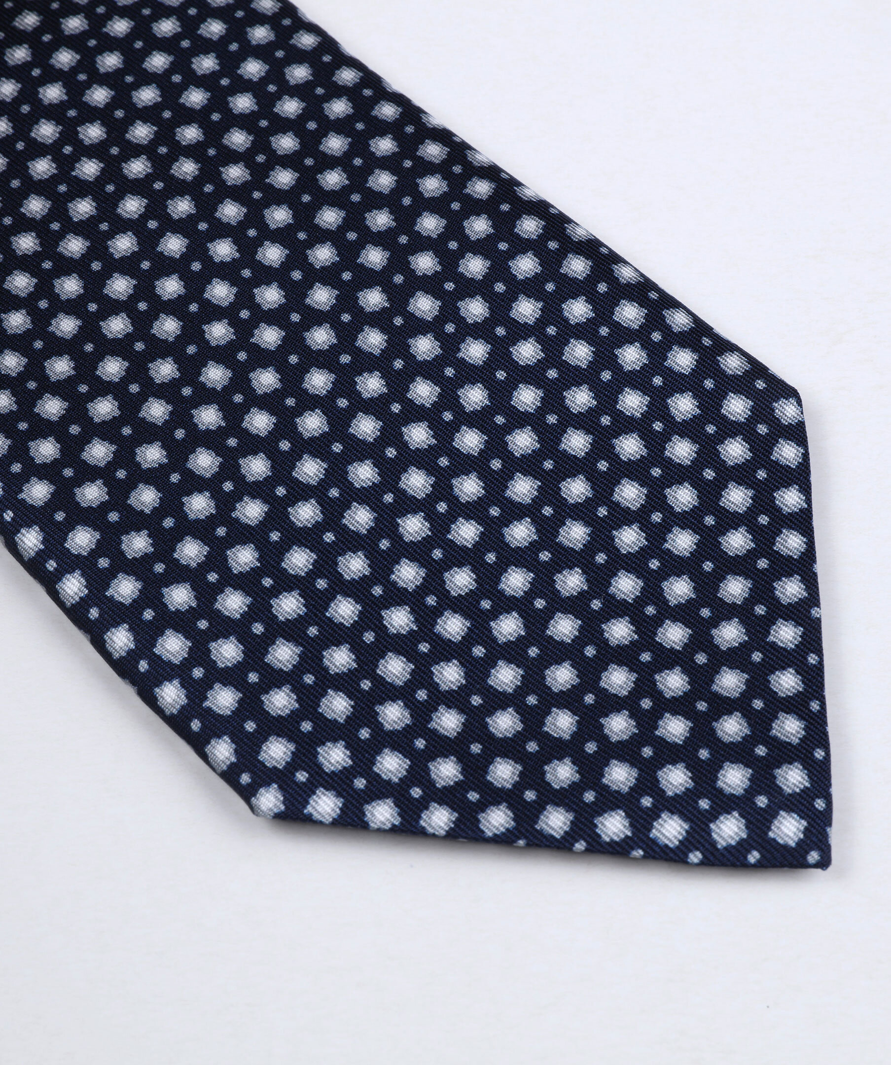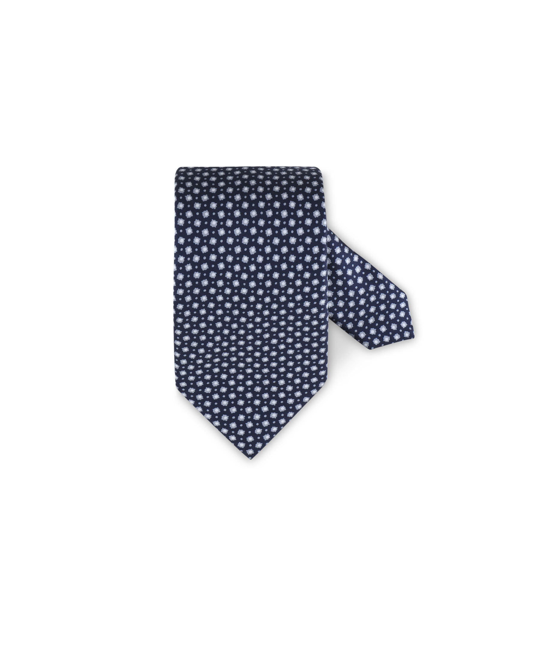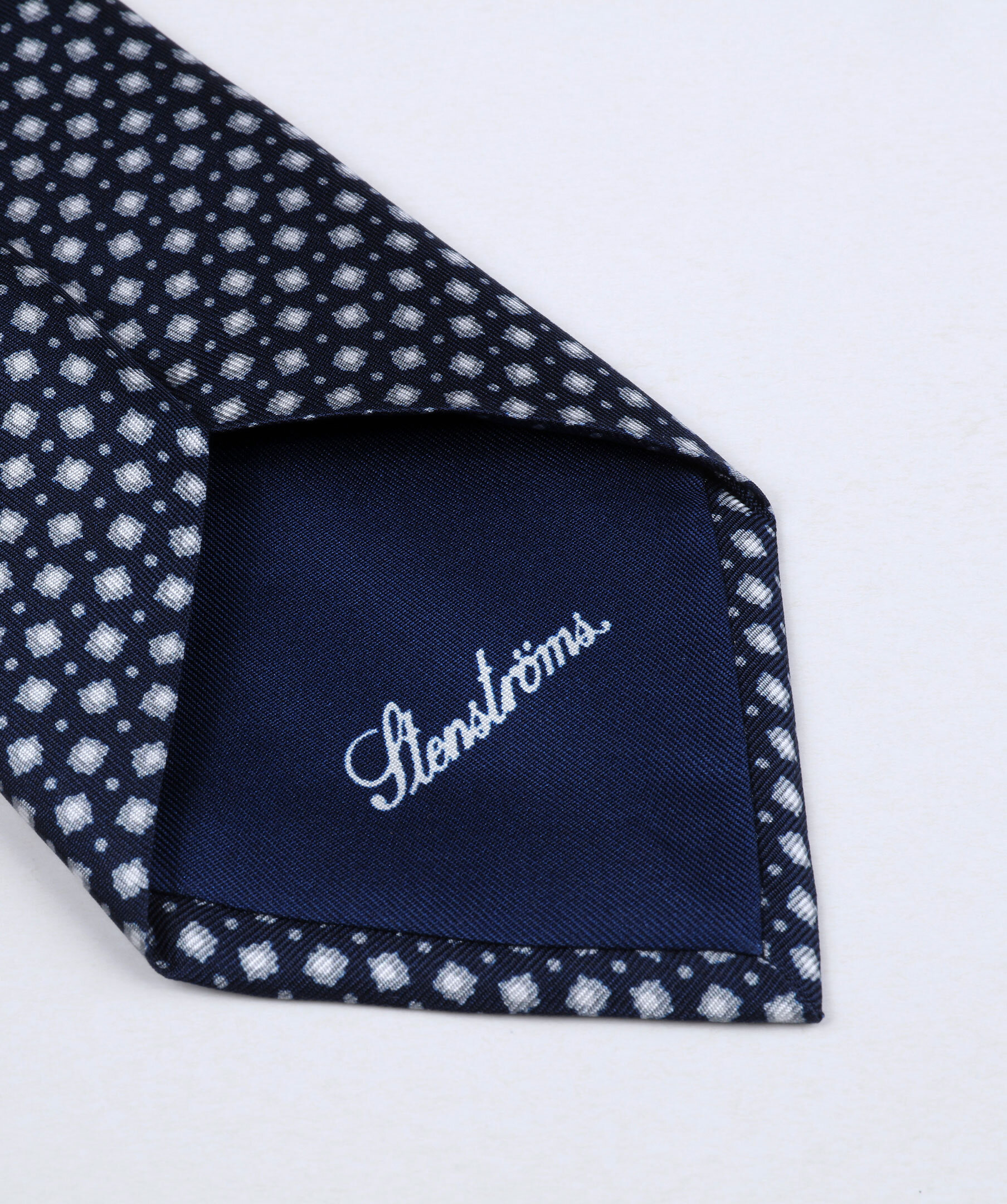 Den här slipsen från Stenströms har en litet medaljongmönster i ljusgrått och vitt på en marinblå bakgrund. Den är tillverkad i Italien av siden med en matt och len yta med precis lagom mycket lyster. Matcha med en blazer och en tunn stickad tröja som är i en av slipsens färger.