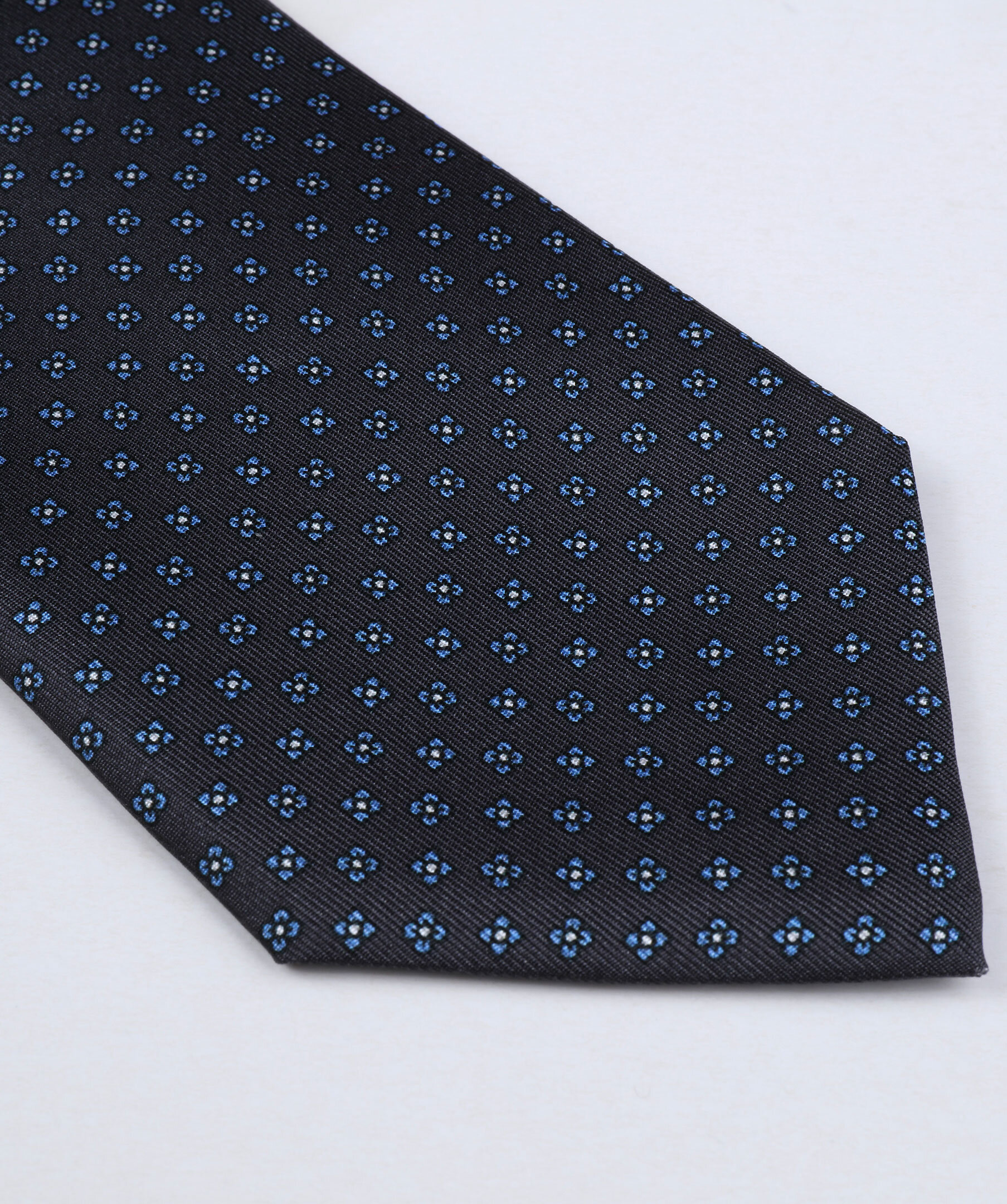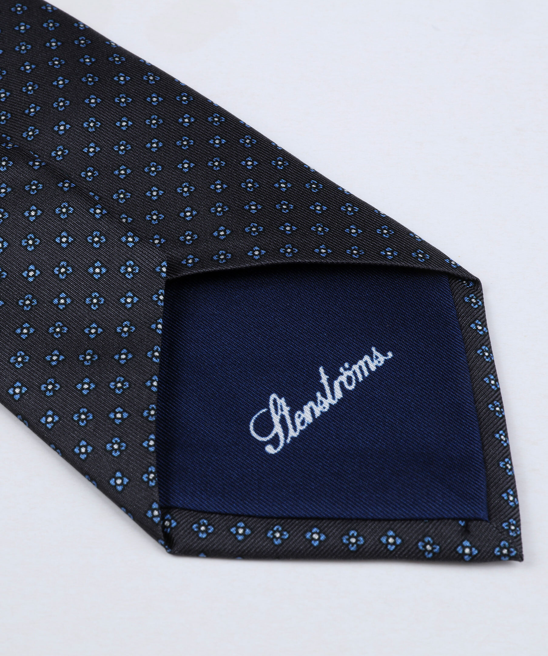 Den här slipsen från Stenströms har en litet blommönster i blått och vitt på en grå bakgrund. Den är tillverkad i Italien av siden med en matt och len yta med precis lagom mycket lyster. Matcha med en blazer och en tunn stickad tröja som är i en av slipsens färger.