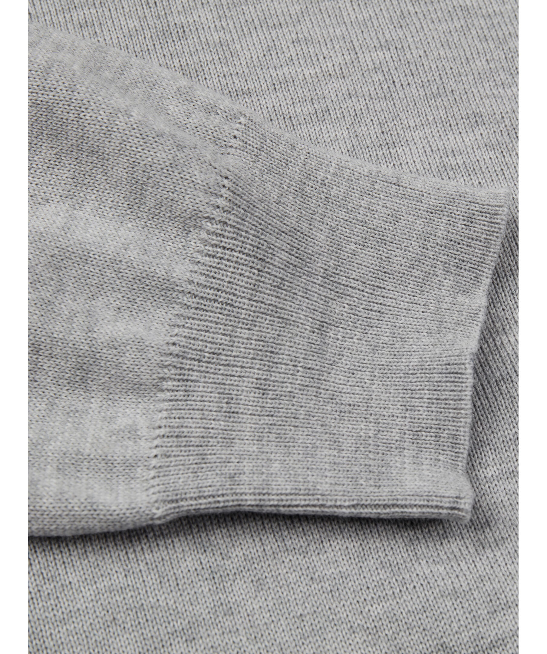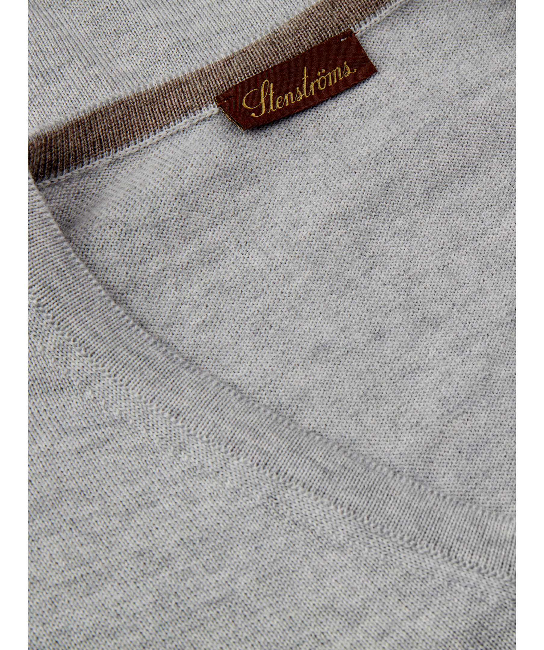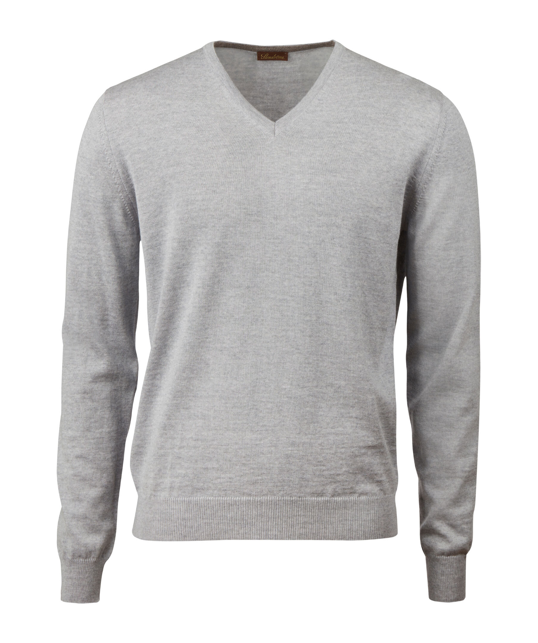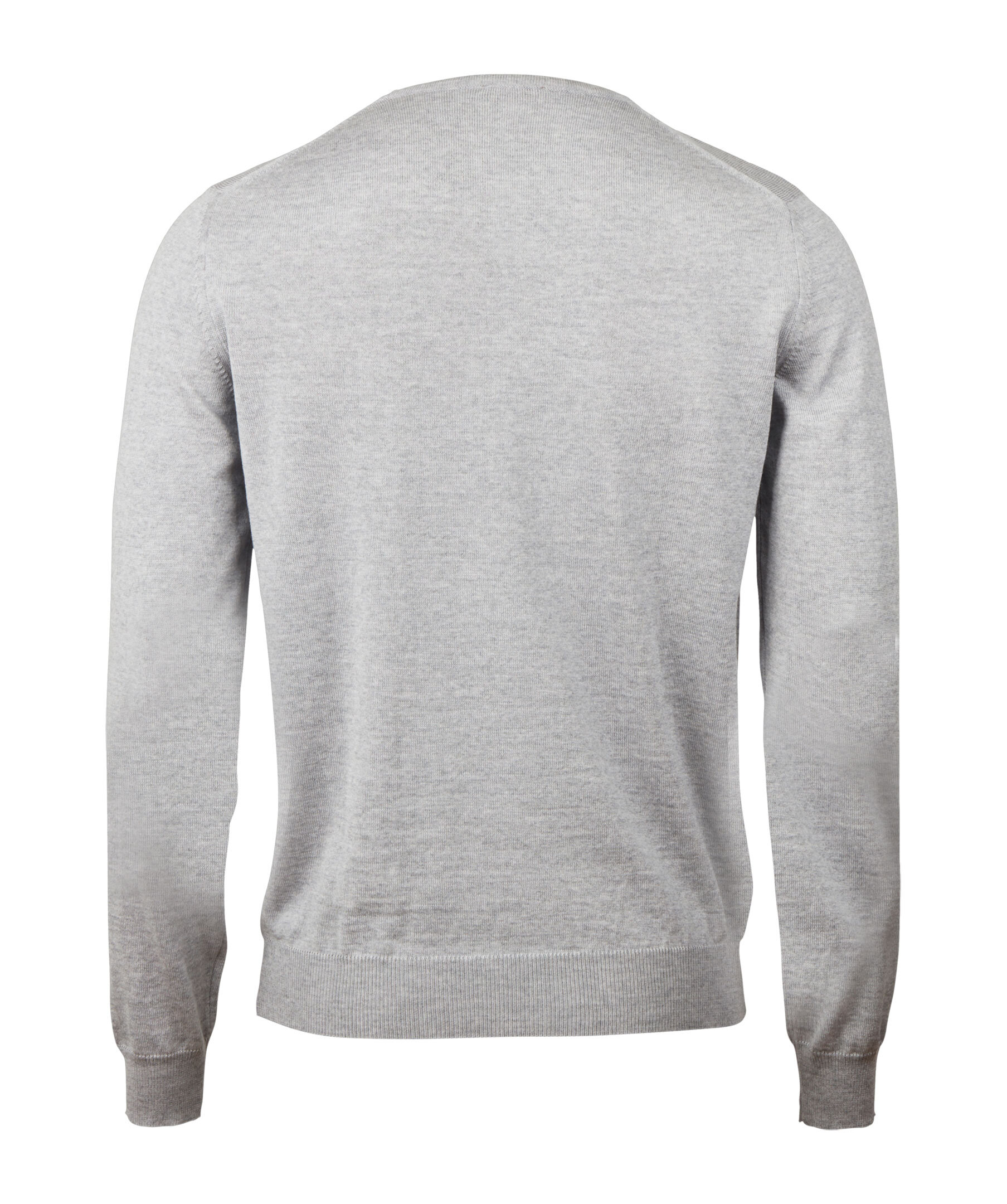 Denna melerade v-ringade tröja är tillverkad av merinoull och har ribbstickade detaljer vid krage, ärm- och plaggslut