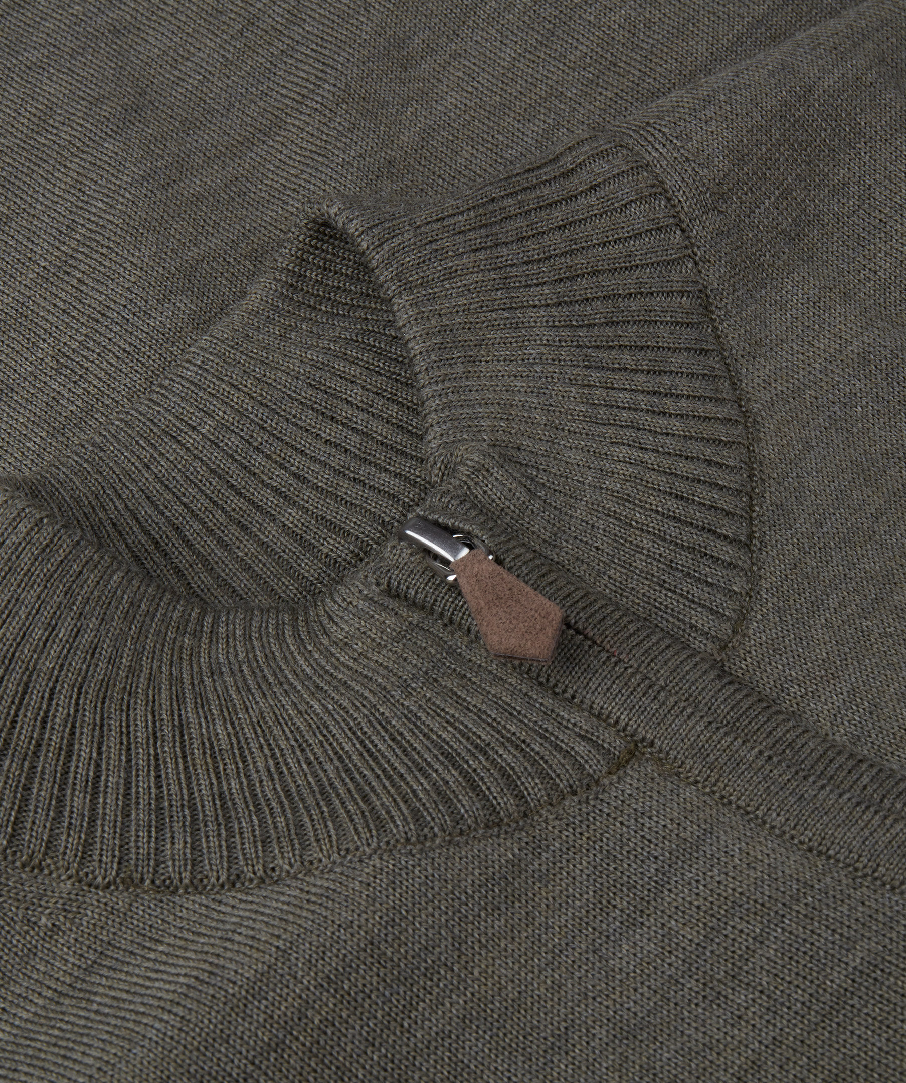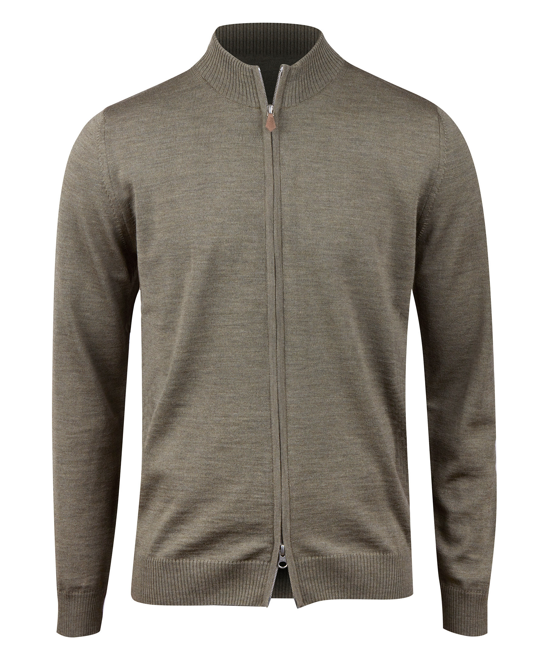 Mossgrön, klassisk cardigan i merinoull från Stenströms. Stängs med en tvåvägsdragkedja framtill, ribbstickad krage och ribbade muddar i ärmslut och plaggslut.