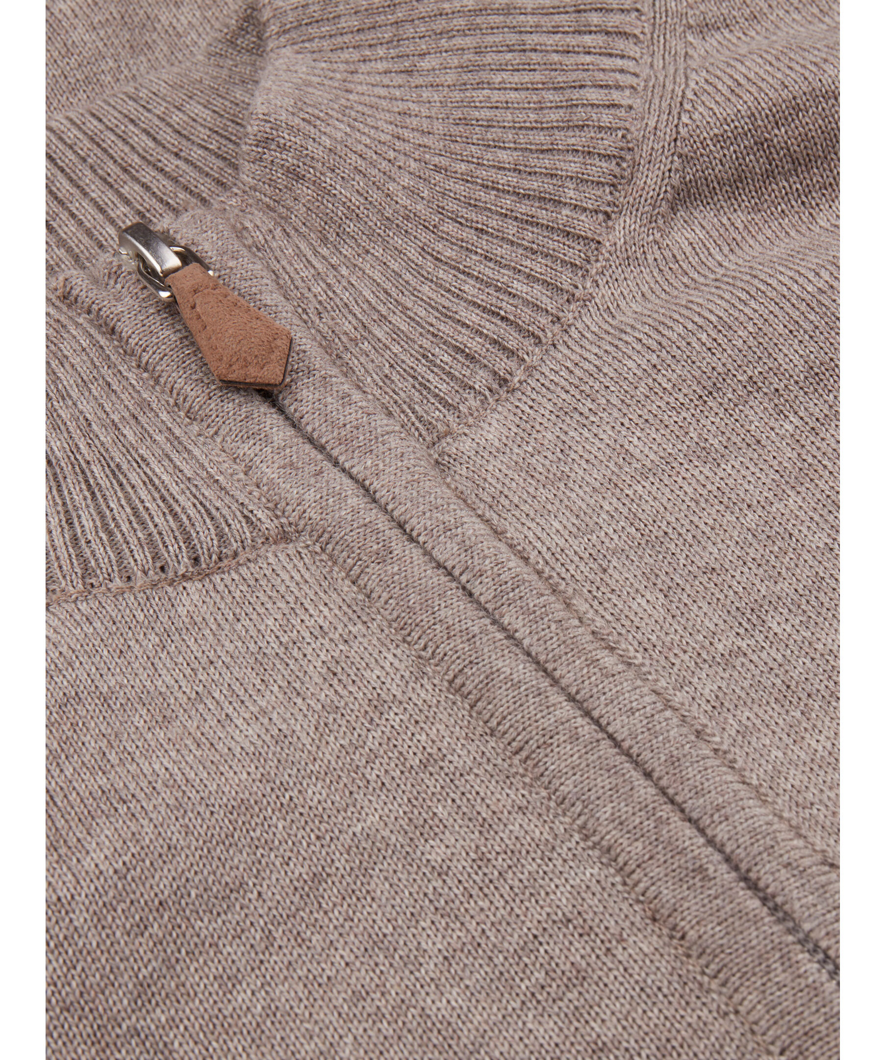 Denna zip cardigan är tillverkad av merinoull och har ribbstickade detaljer vid krage, ärm- och plaggslut.
