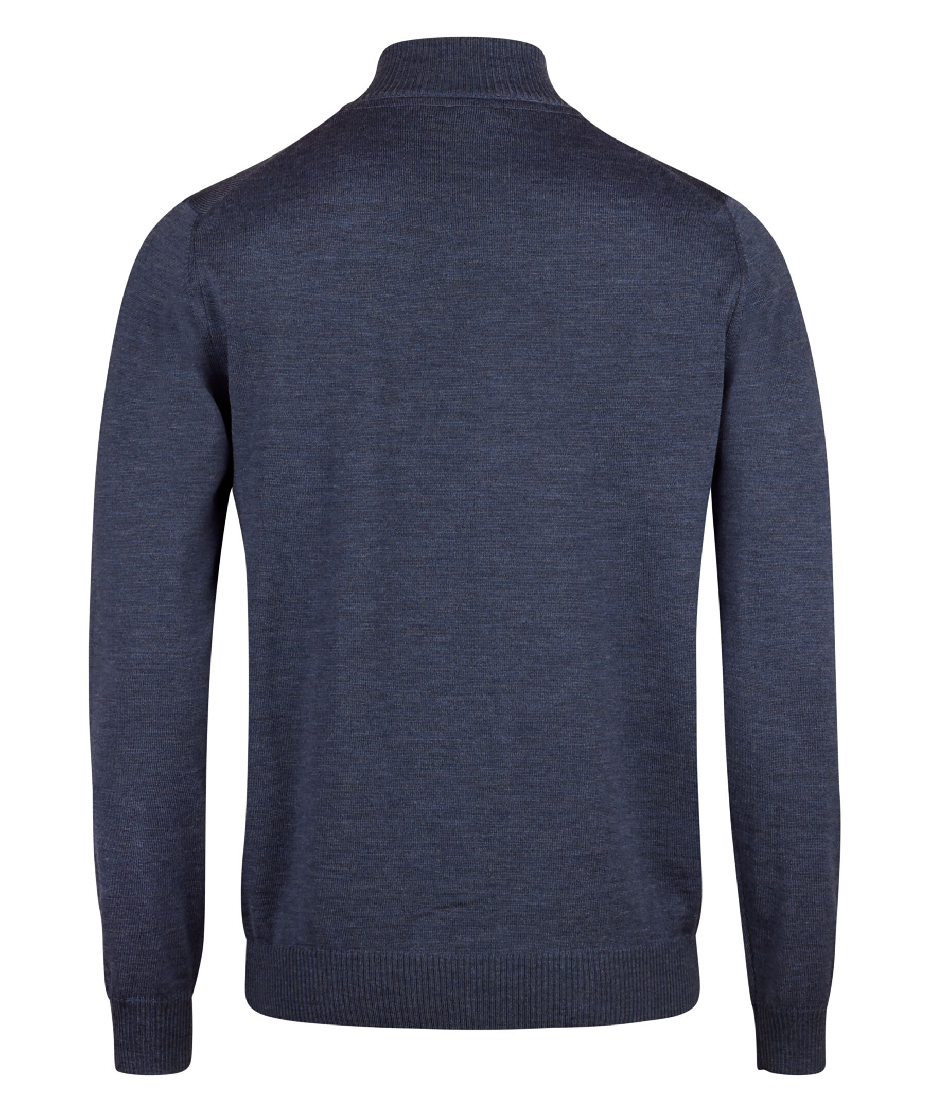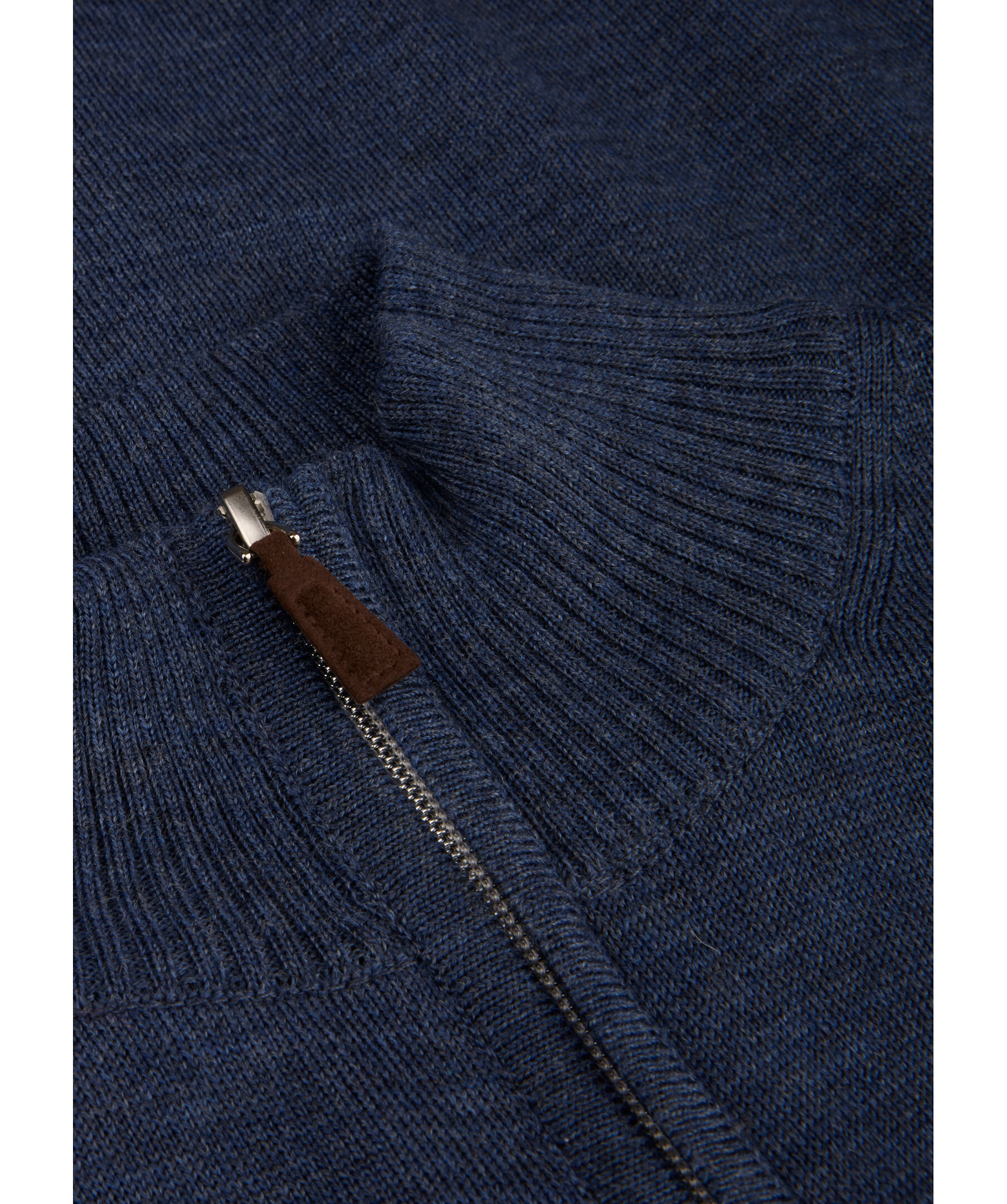 Blå finstickad tröja från Stenströms. Ståkrage, dragkedja framtill, ribbstickade detaljer. Tillverkad i 100% merinoull.