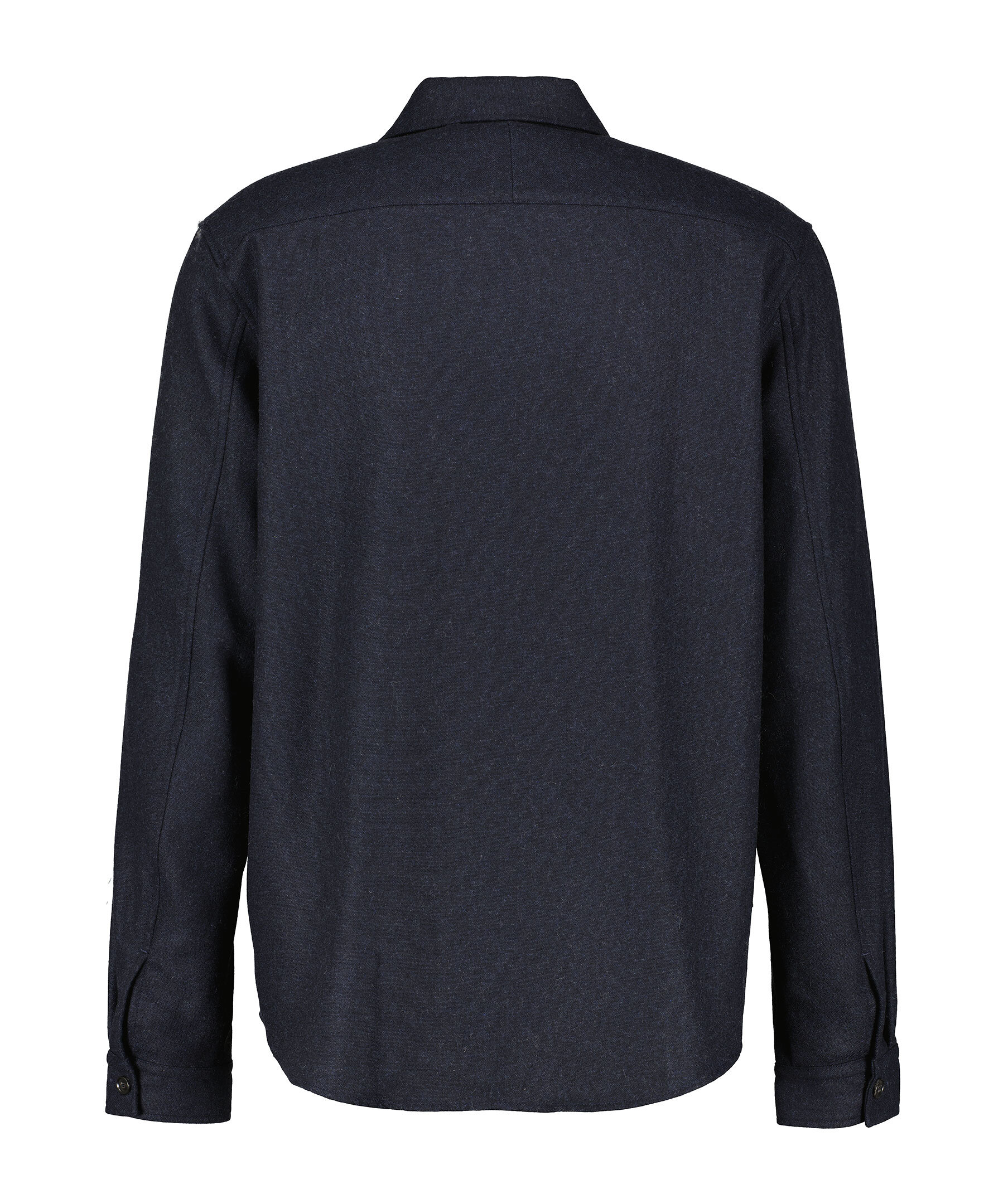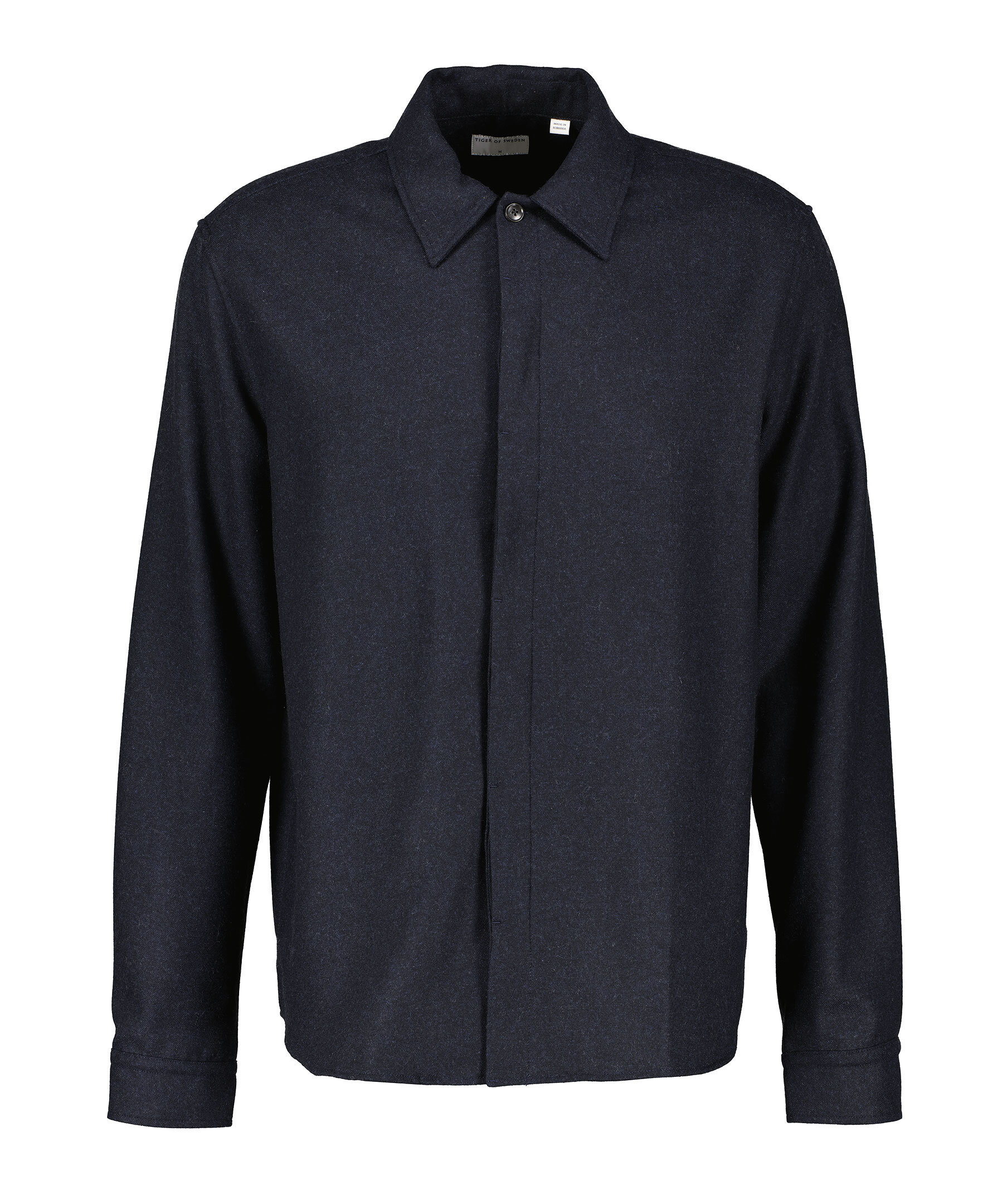 Mörkblå overshirt från Tiger of Sweden. Overshirten har en synlig knapp i kragen, i övrigt dold knappstängning fram. Tillverkad av en ullblandning.