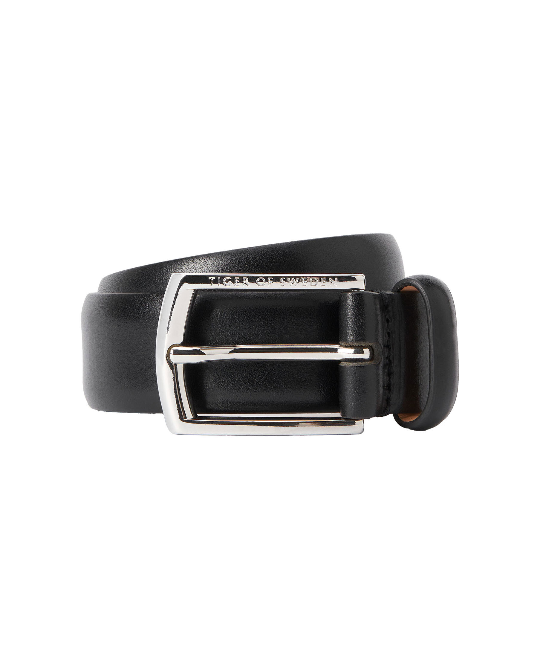 Svart läderbälte från Tiger of Sweden. Bältet har ett metallspänne med logotyp och är 3 cm brett. Tillverkat i koläder.