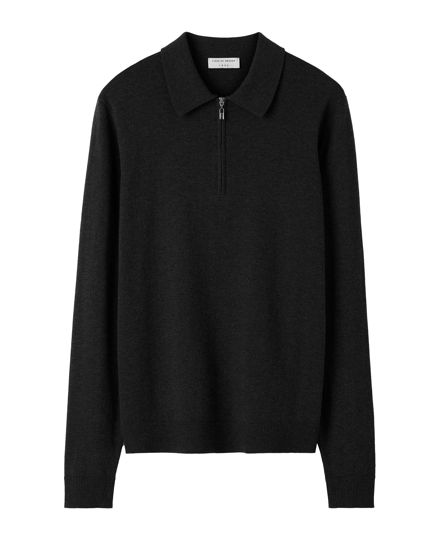 Svart finstickad och långärmad pikétröja med dragkedja från Tiger of Sweden. Tröjan har ribbstickade muddar vid ärm- och plaggslut samt korta slitsar i sidorna. Tillverkad i en ullblandning.