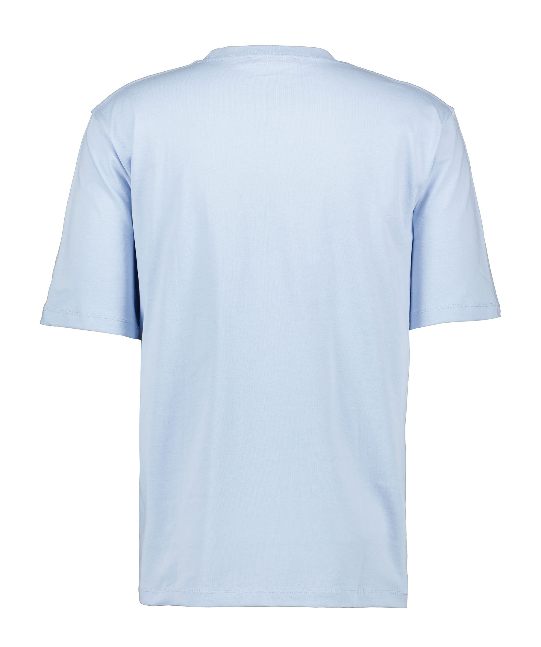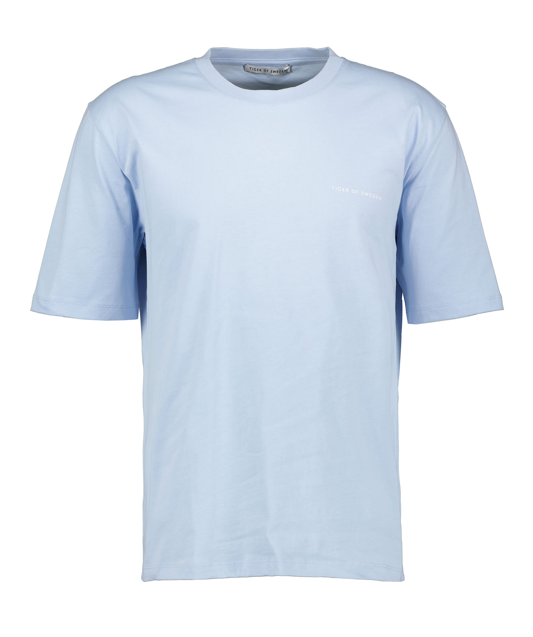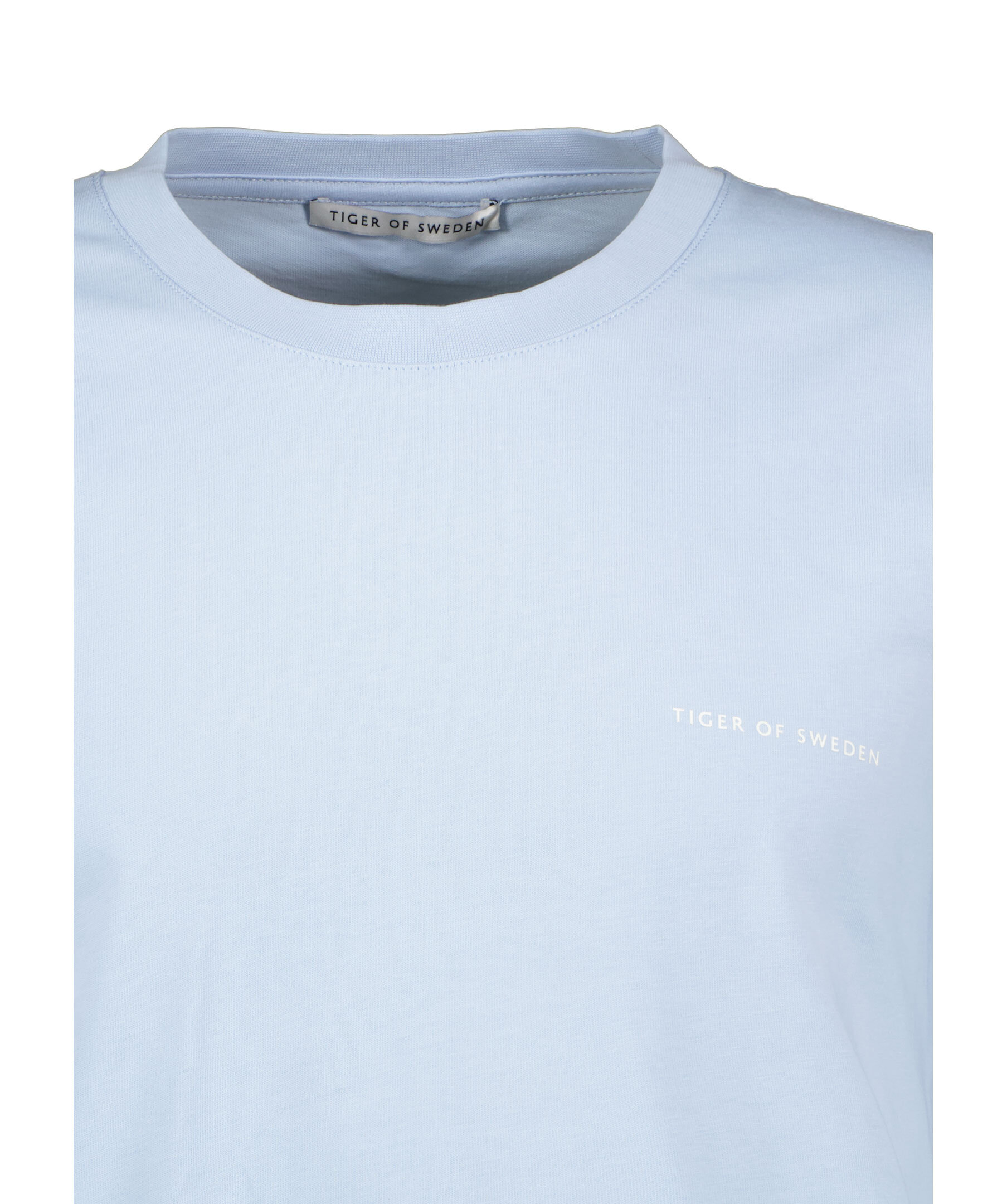Ljusblå t-shirt från Tiger of Sweden. Tröjan har ribbstickad halsringning och liten logotyp på bröstet. Tillverkad av 100% bomull.