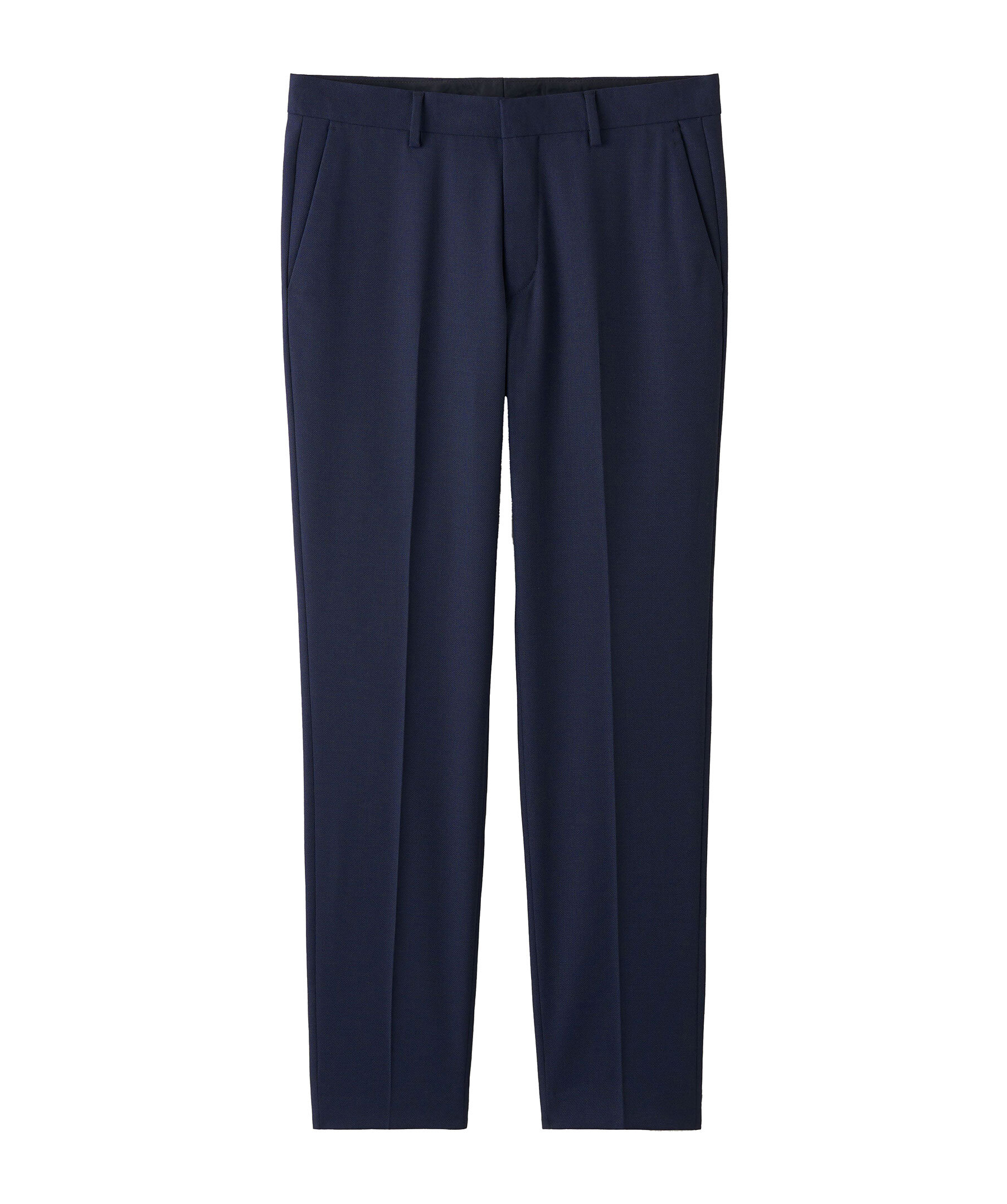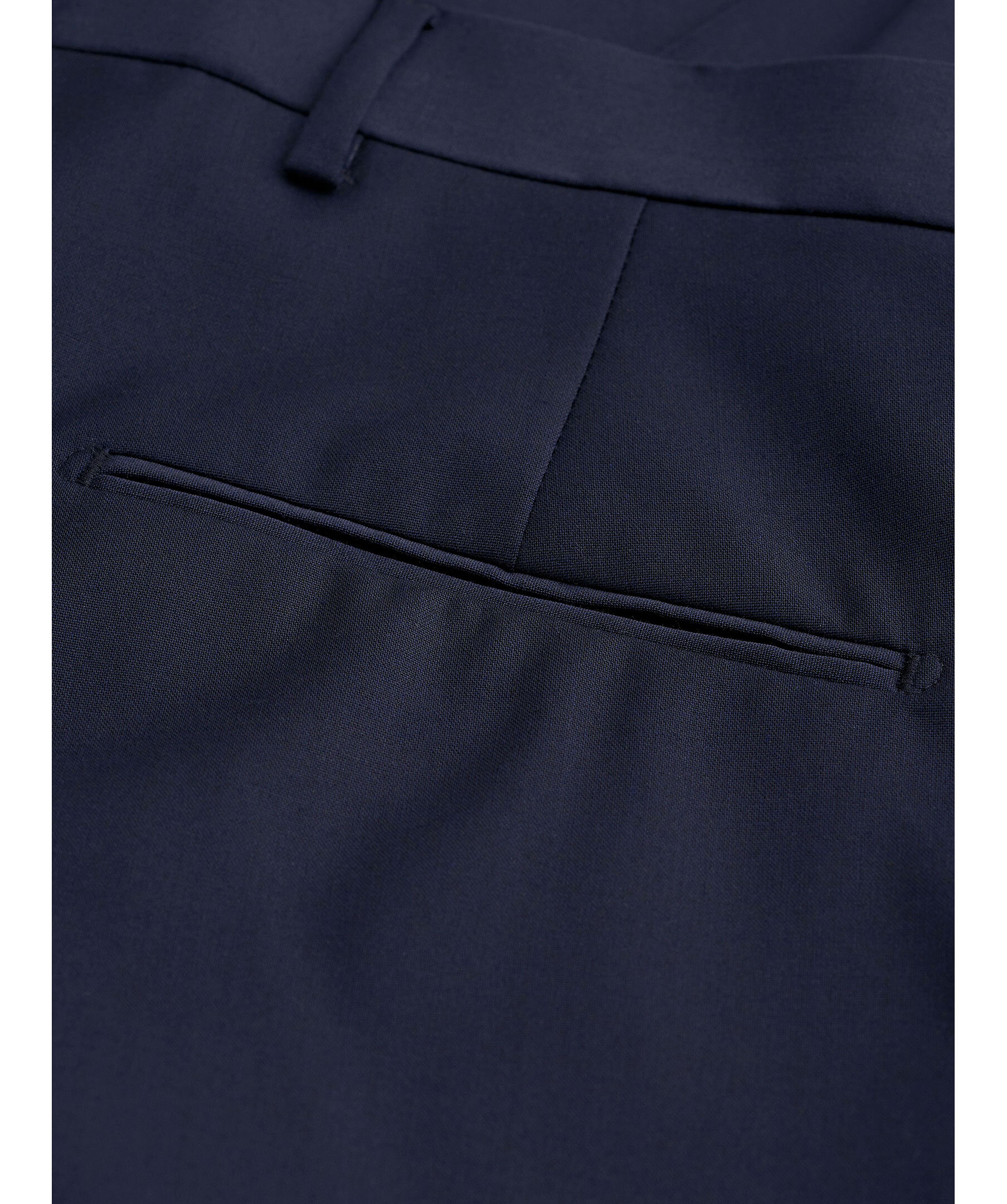 Mörkblå kostymbyxor från Tiger of Sweden. Tillverkade i återvunnen slätvävd polyester- och ullblandning. Bälteshällor i midjan och två sidfickor. Smal passform och smala ben.