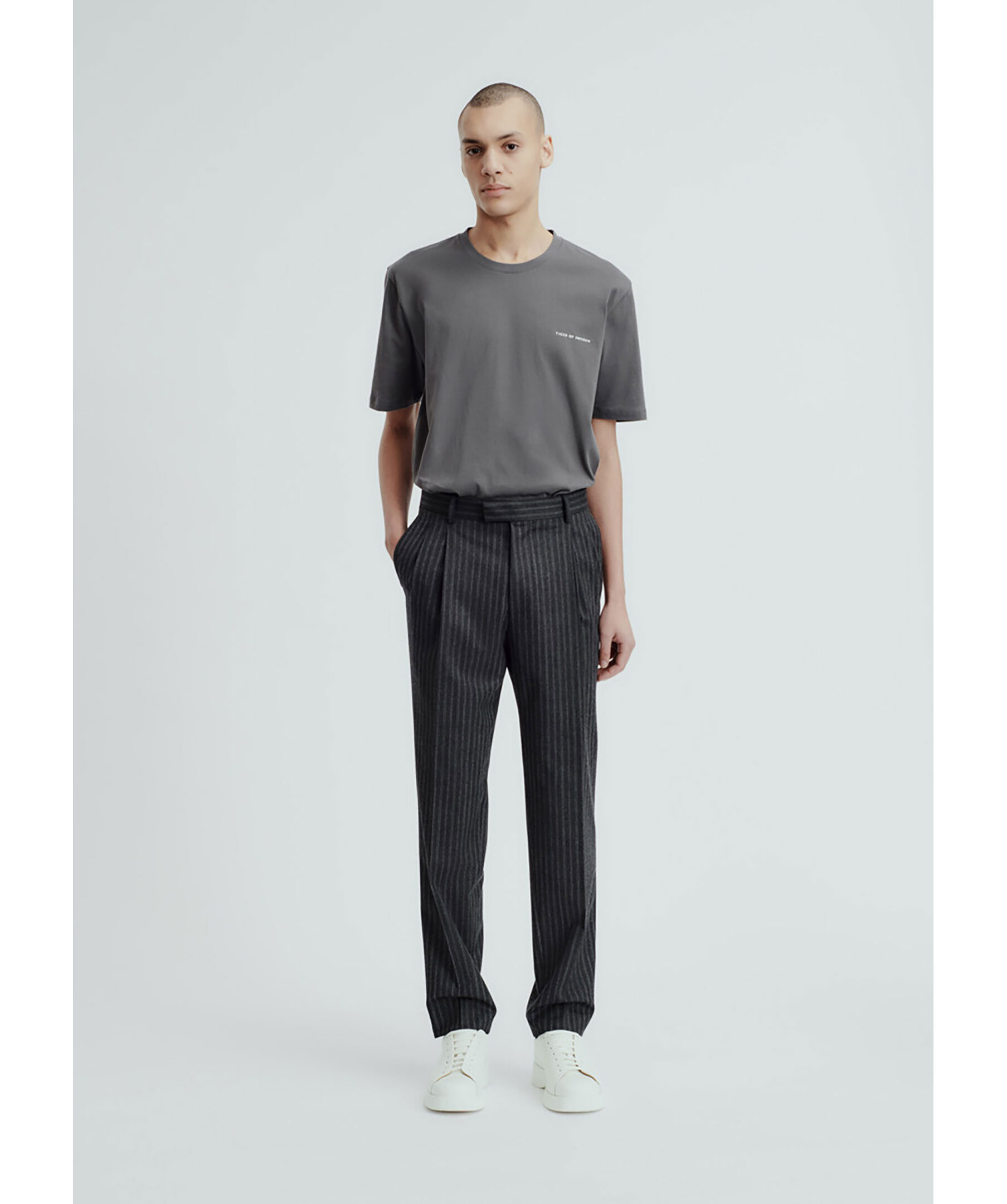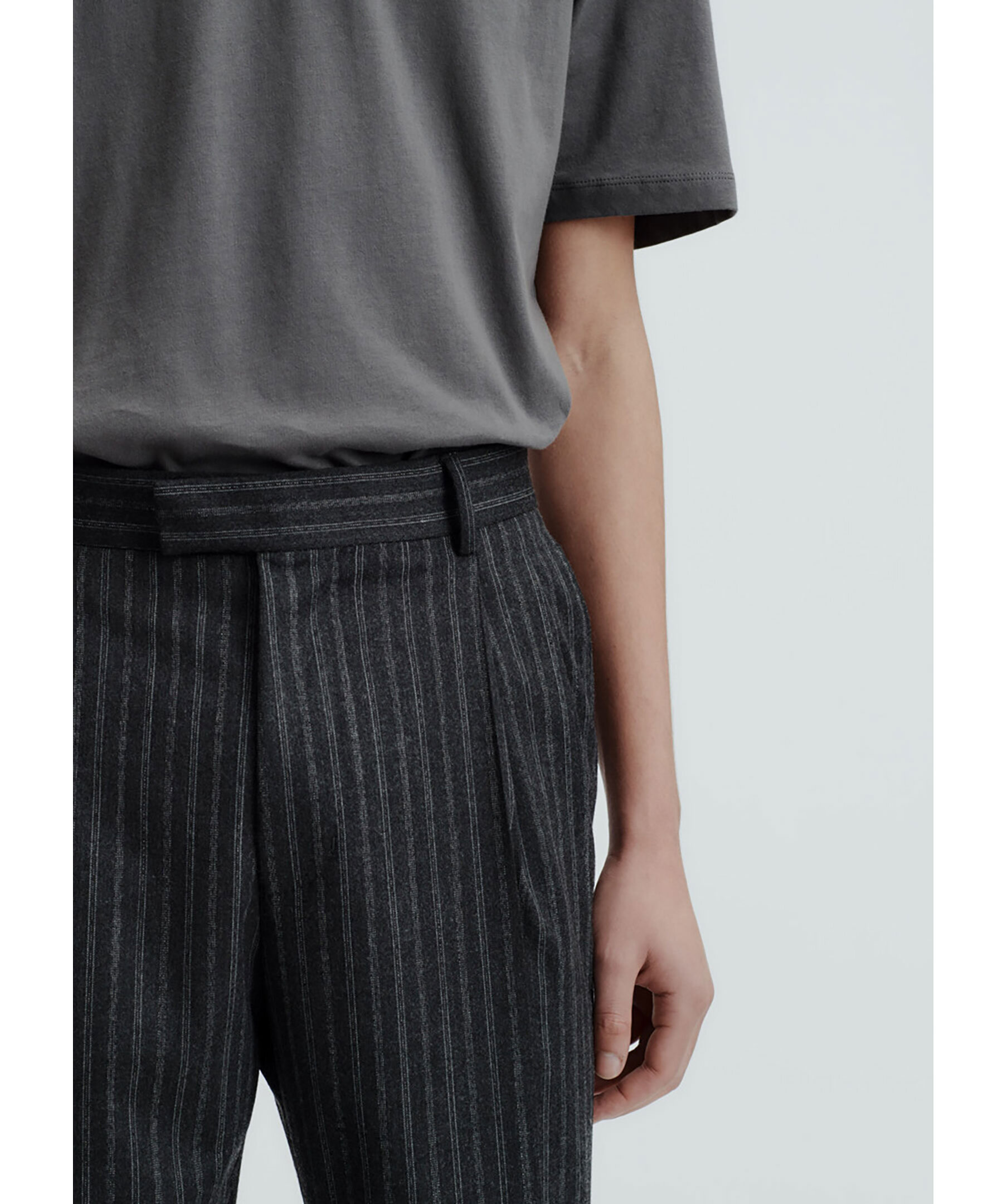 Grårandiga kostymbyxor från Tiger of Sweden. Byxorna har öppna sidofickor, bälteshällor och passpoalfickor bak med knapp. Tillverkade av en polyester blandning.