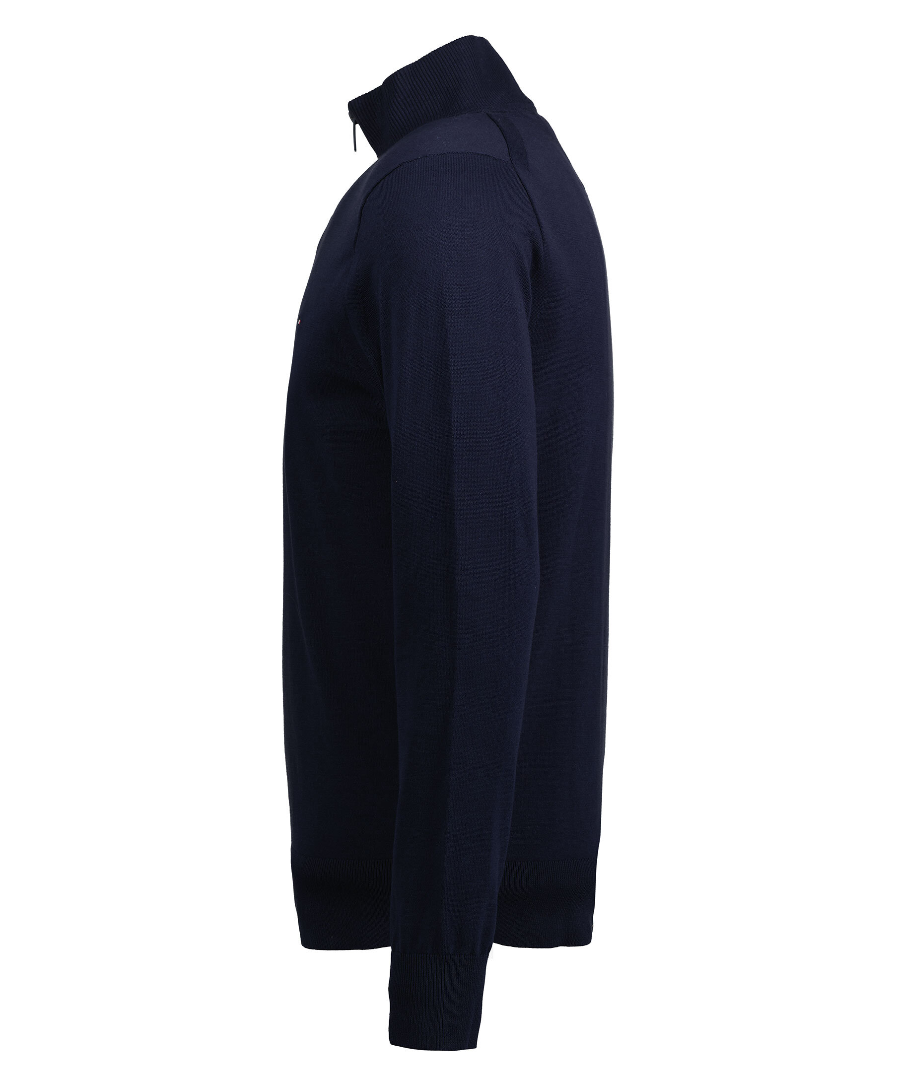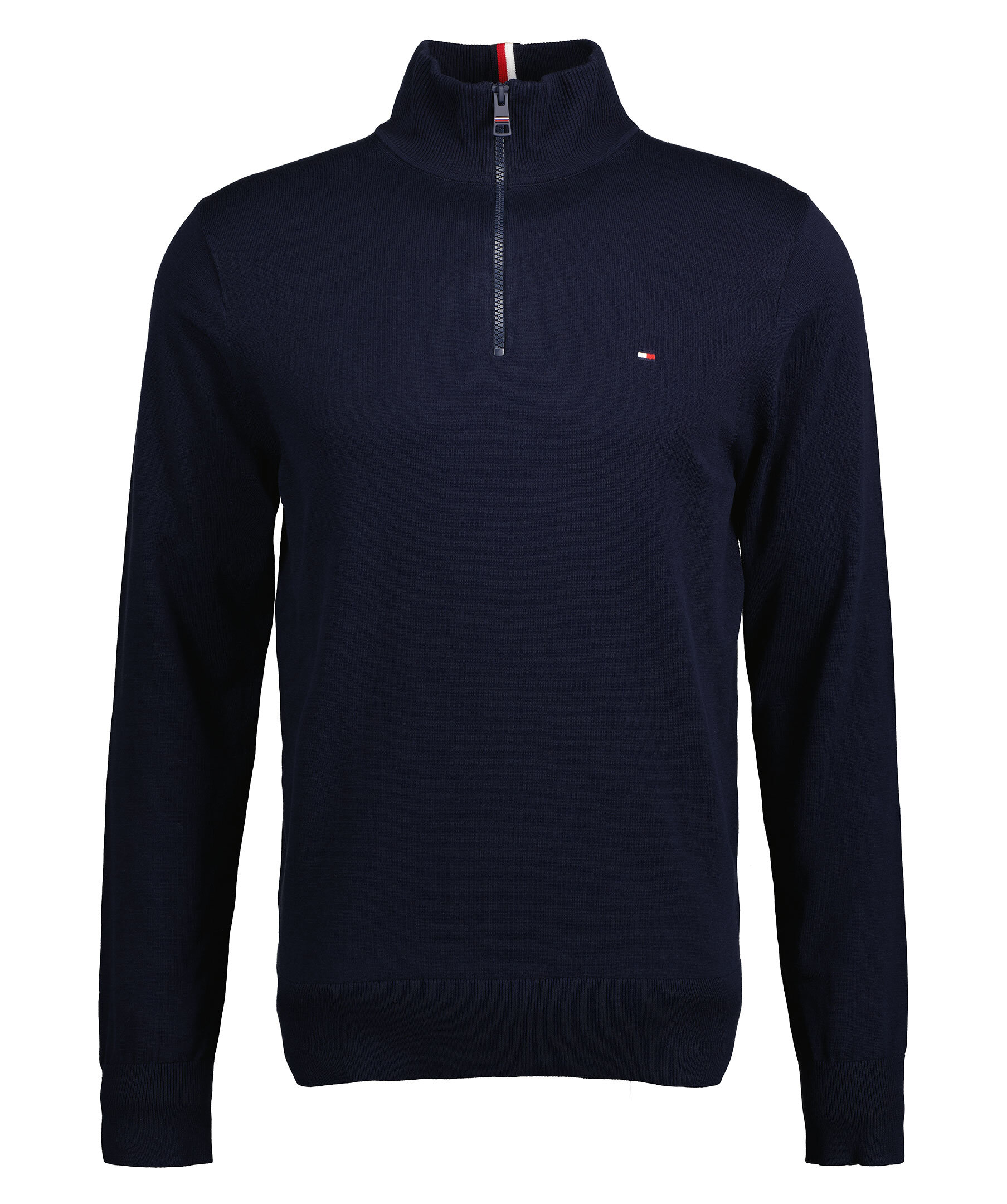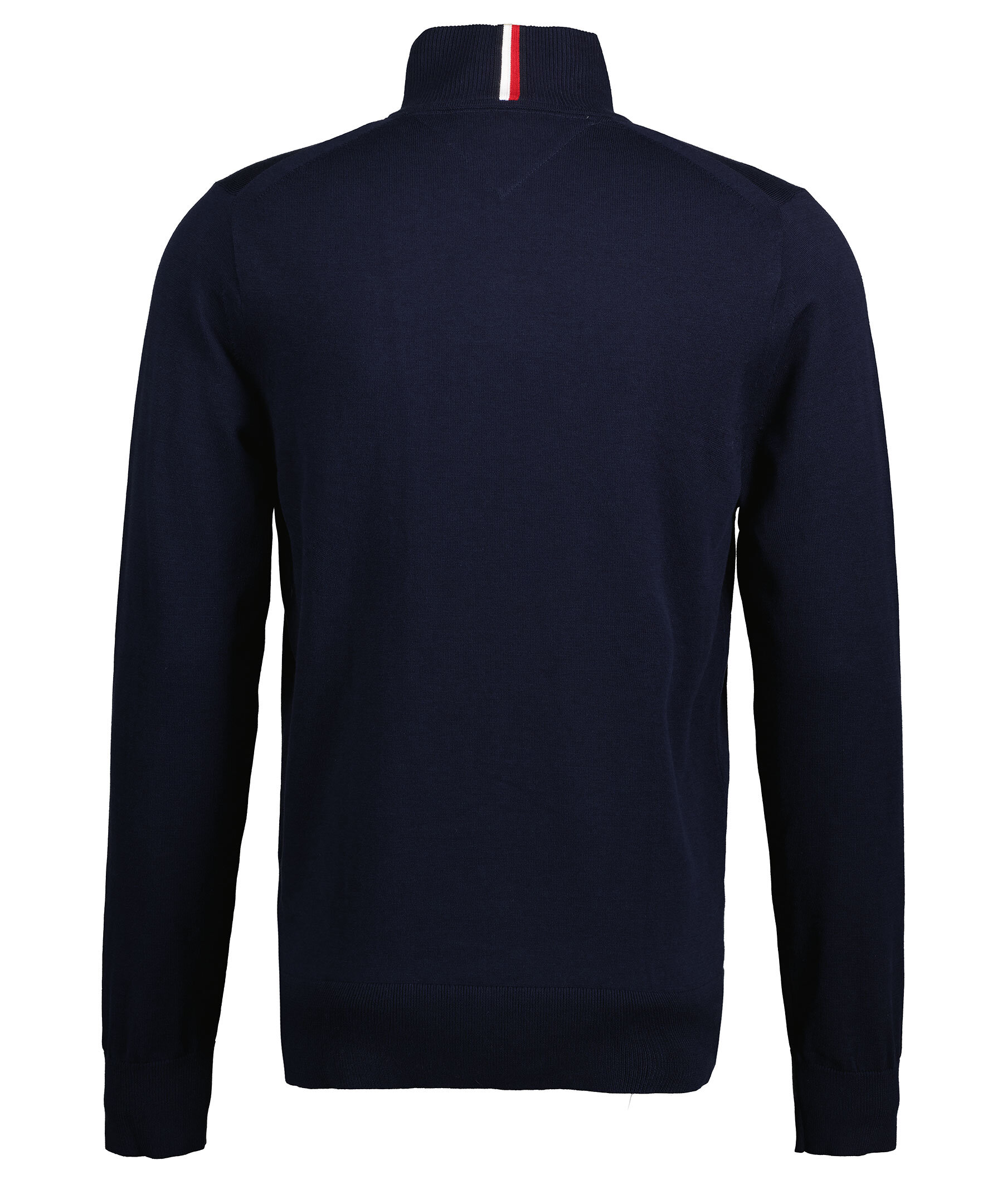 Mörkblå finstickad half-zip från Tommy Hilfiger. Broderad logotyp på vänster bröst. Ribbstickad krage, ärm- och plaggslut. Broderad logotyp på vänster bröst. Tillverkad i 100% bomull. Röd, vit och blå stickad detalj i nacken.