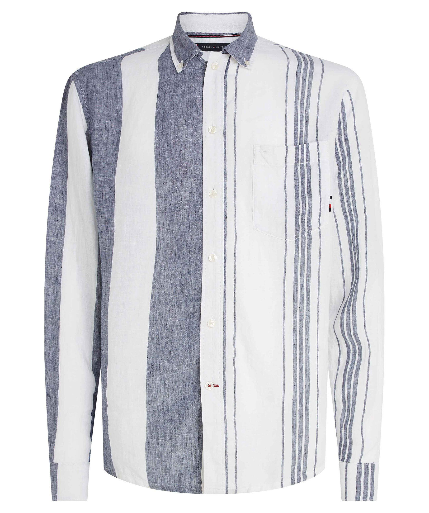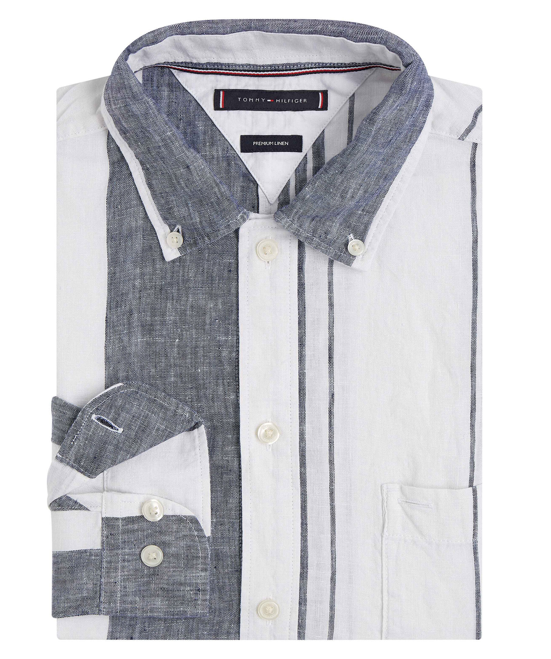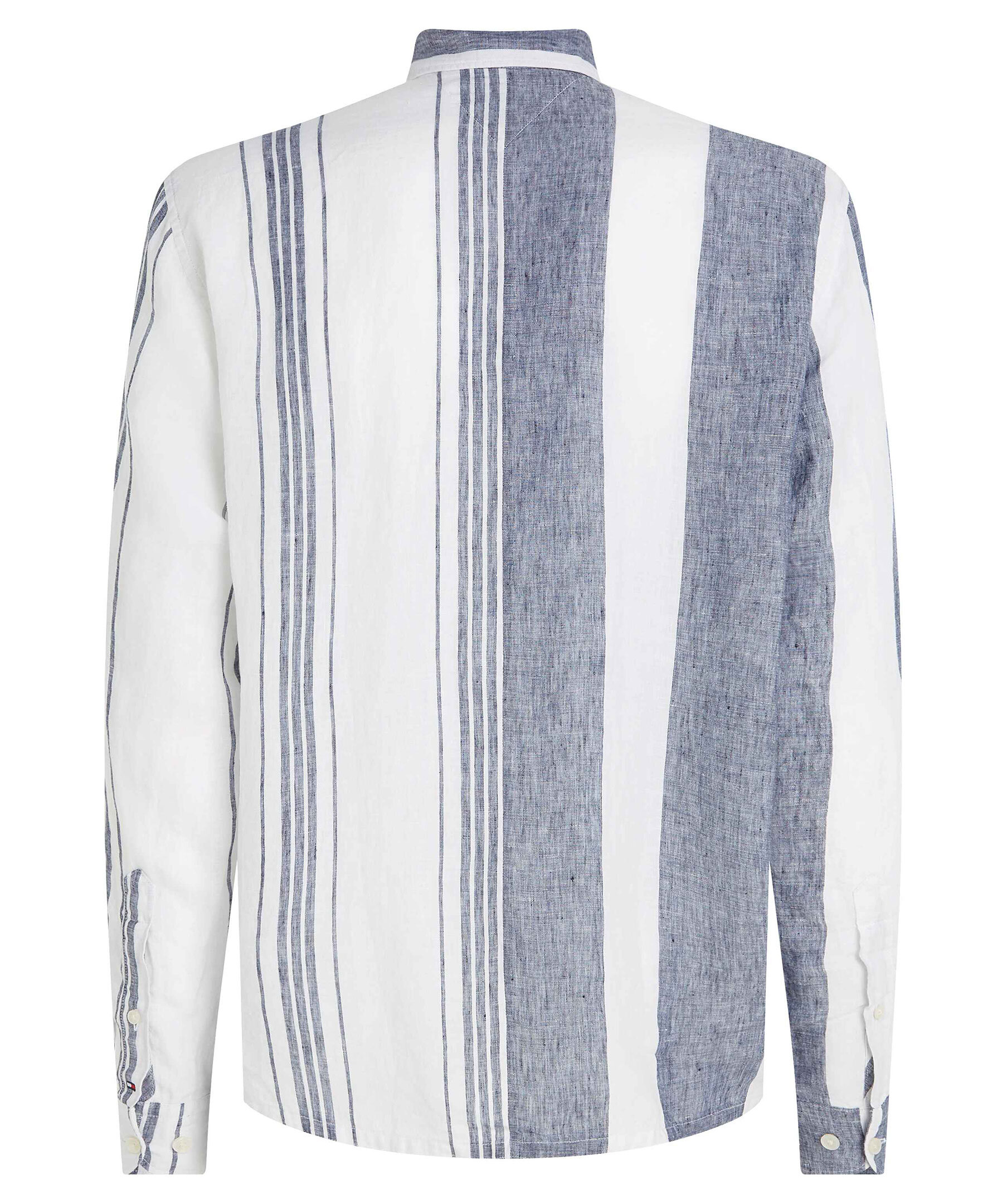 Vit- och blårandig skjorta i Regular fit från Tommy Hilfiger. Tillverkad i 100% linnetyg. Har vita knappar hela vägen fram, button down krage och dubbla manschetter. Liten broderad logotyp på vänster bröst. Små slitsar i sidorna.