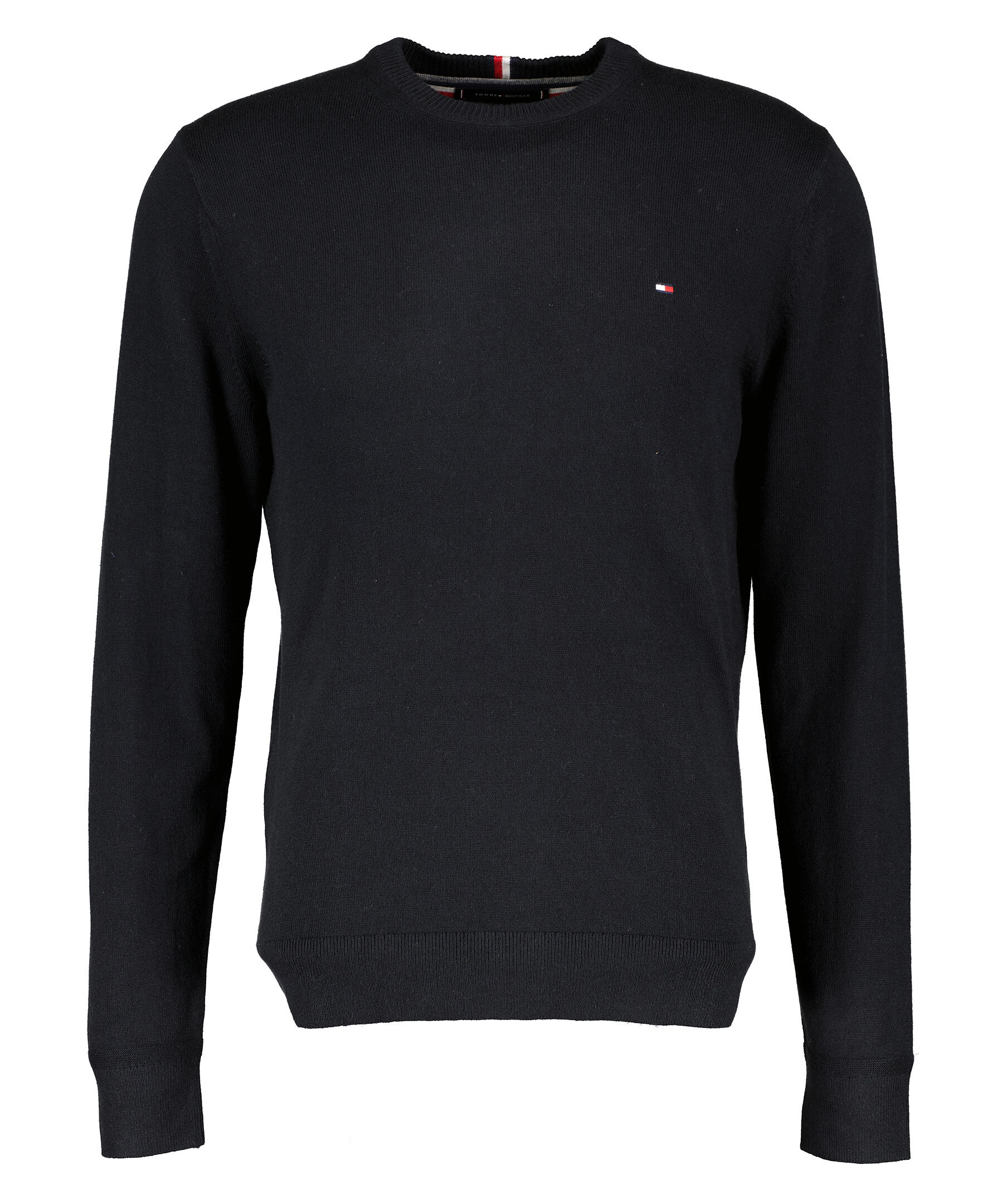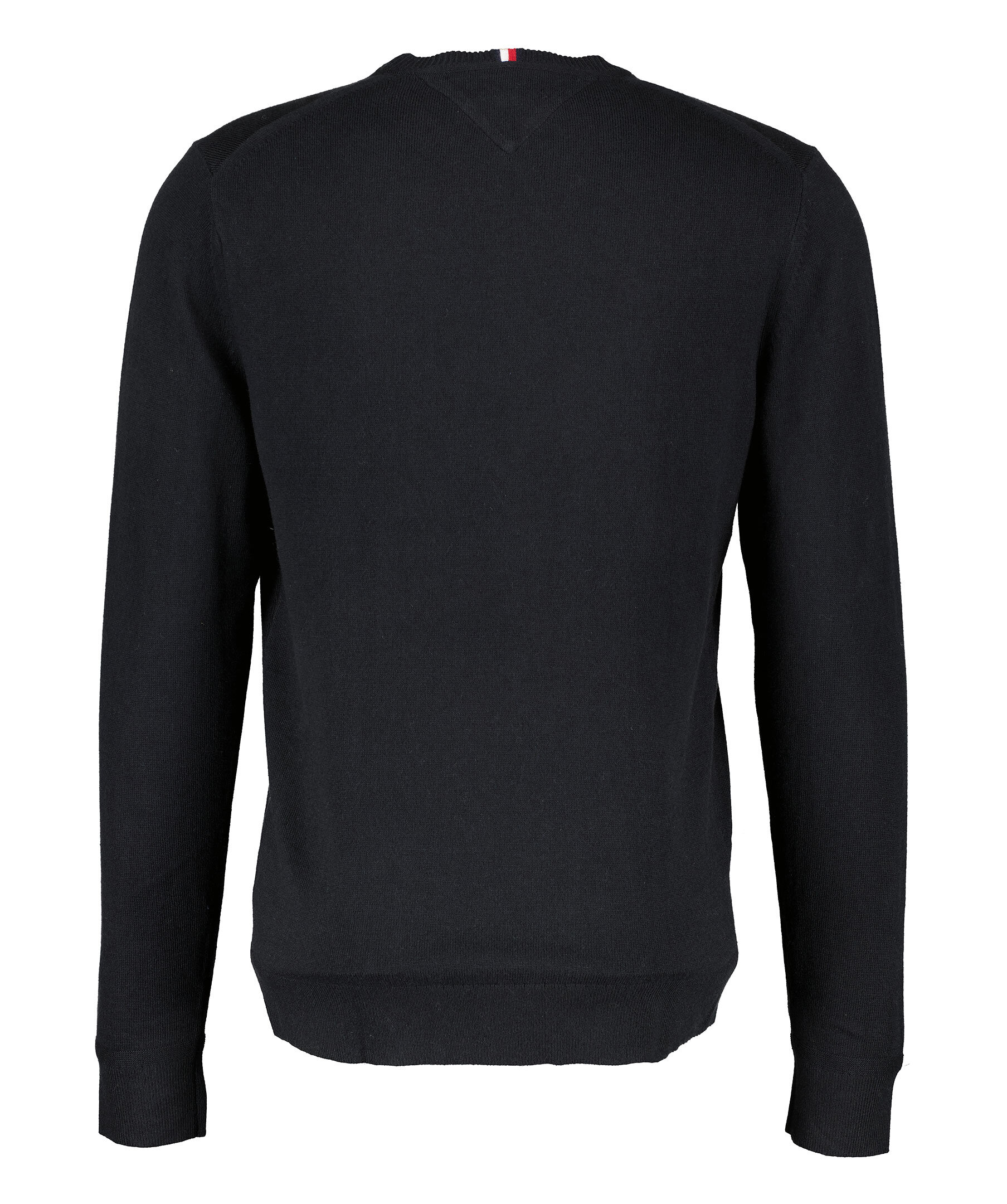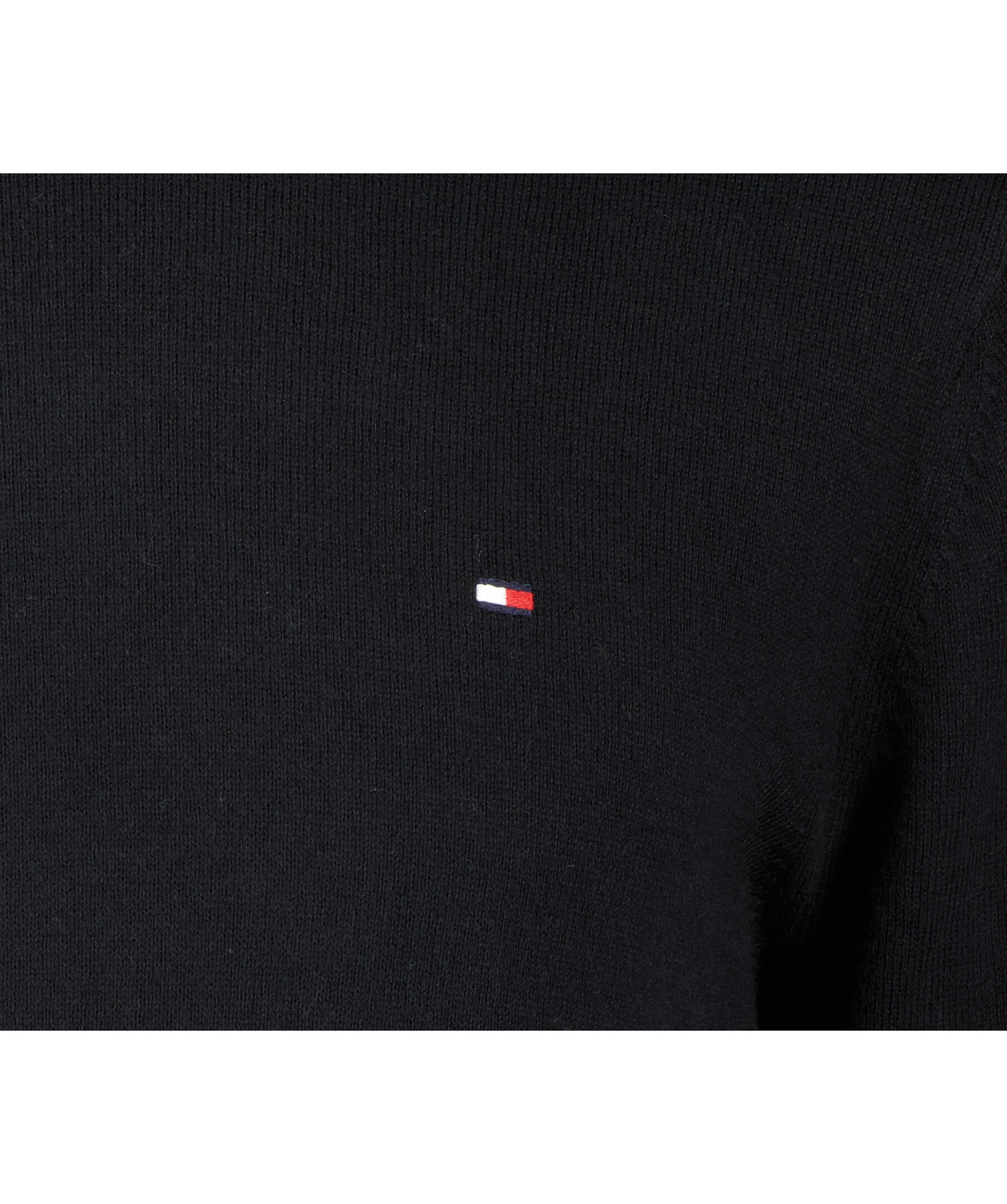 Svart stickad tröja från Tommy Hilfiger i en kashmir och bomullsblandning. Ljungad stickning, rundad halsringning och ribbstickade krage, ärm- och plaggslut. Broderad Tommy Hilfiger flagga på bröstet. Normal passform.
