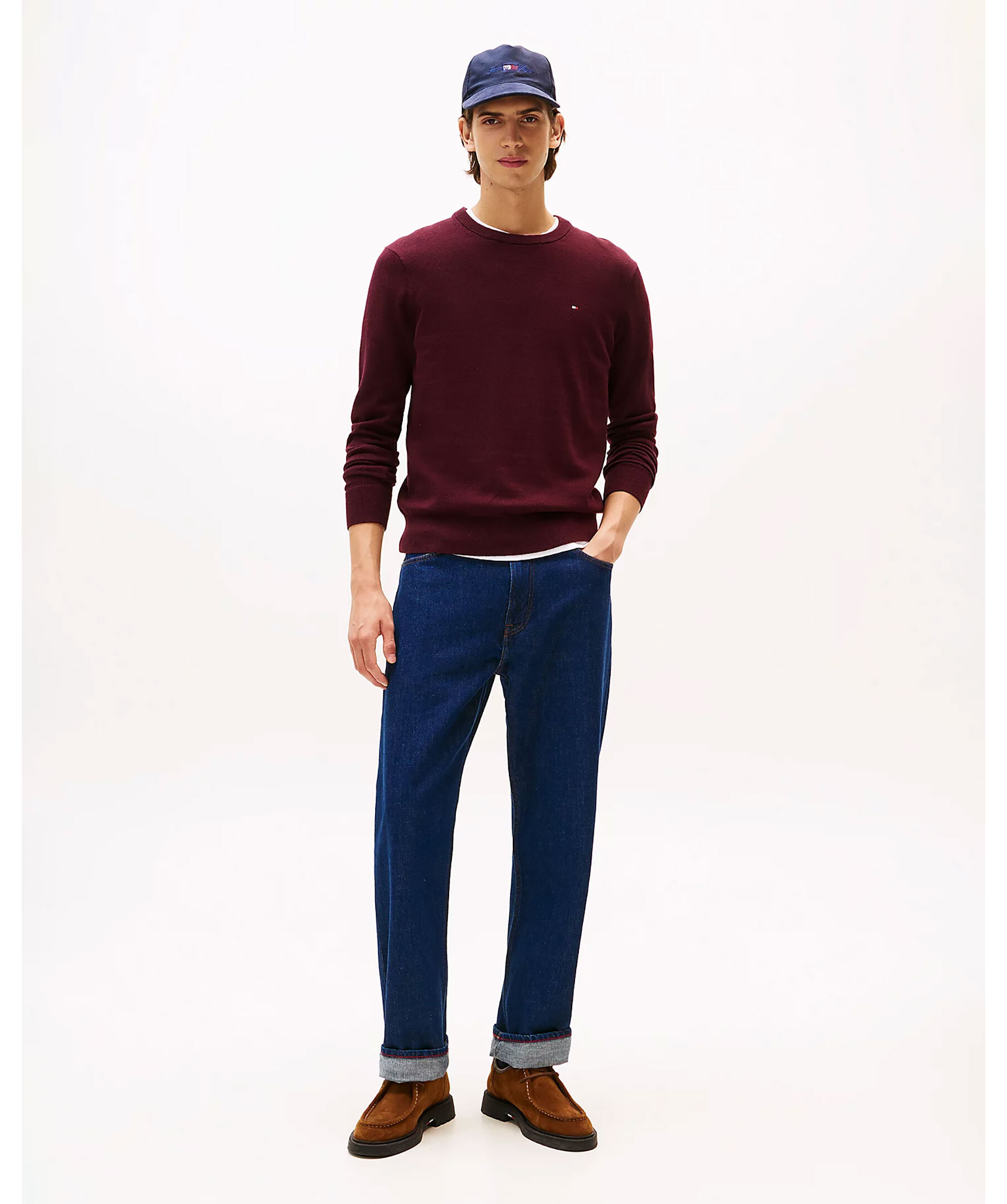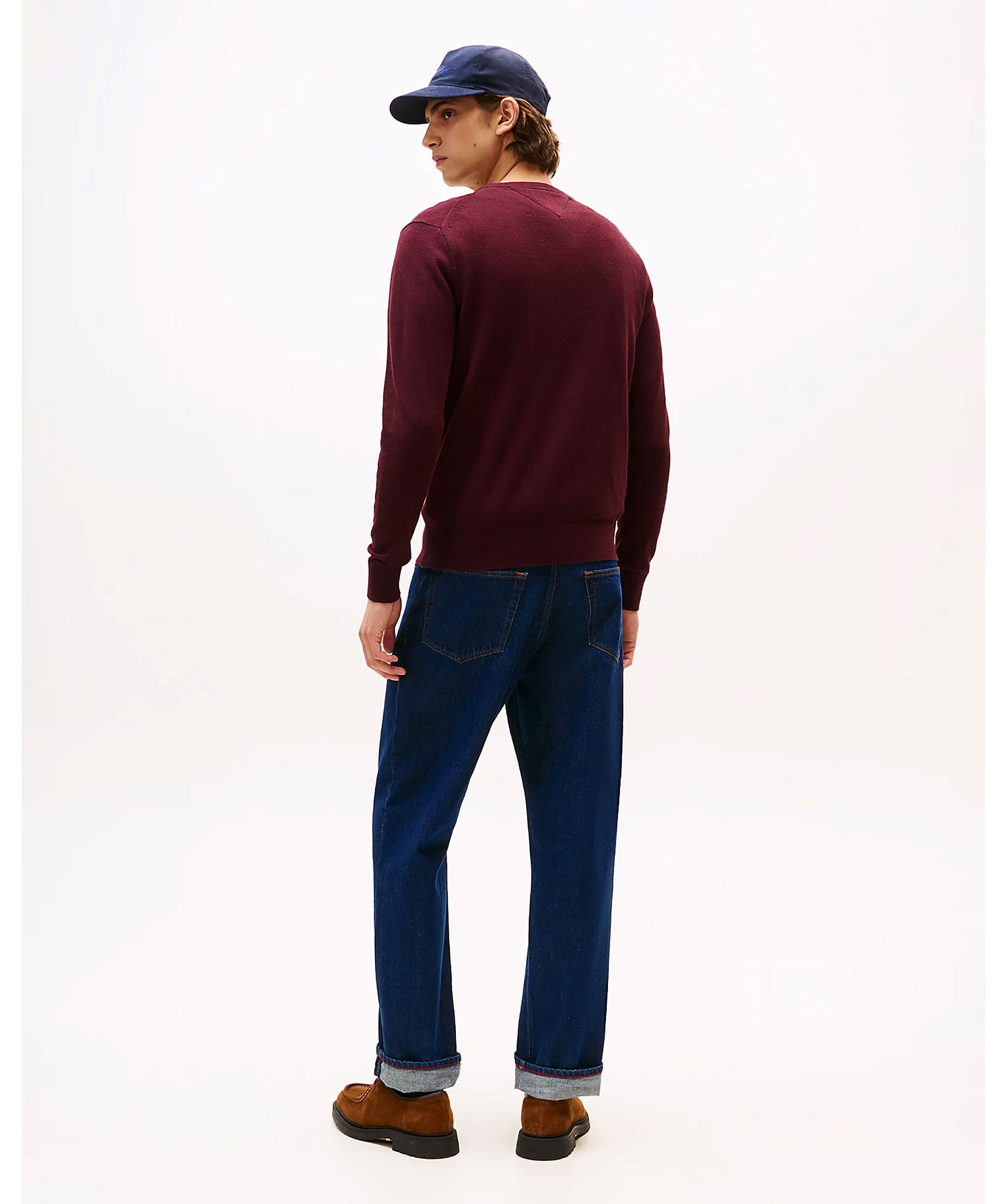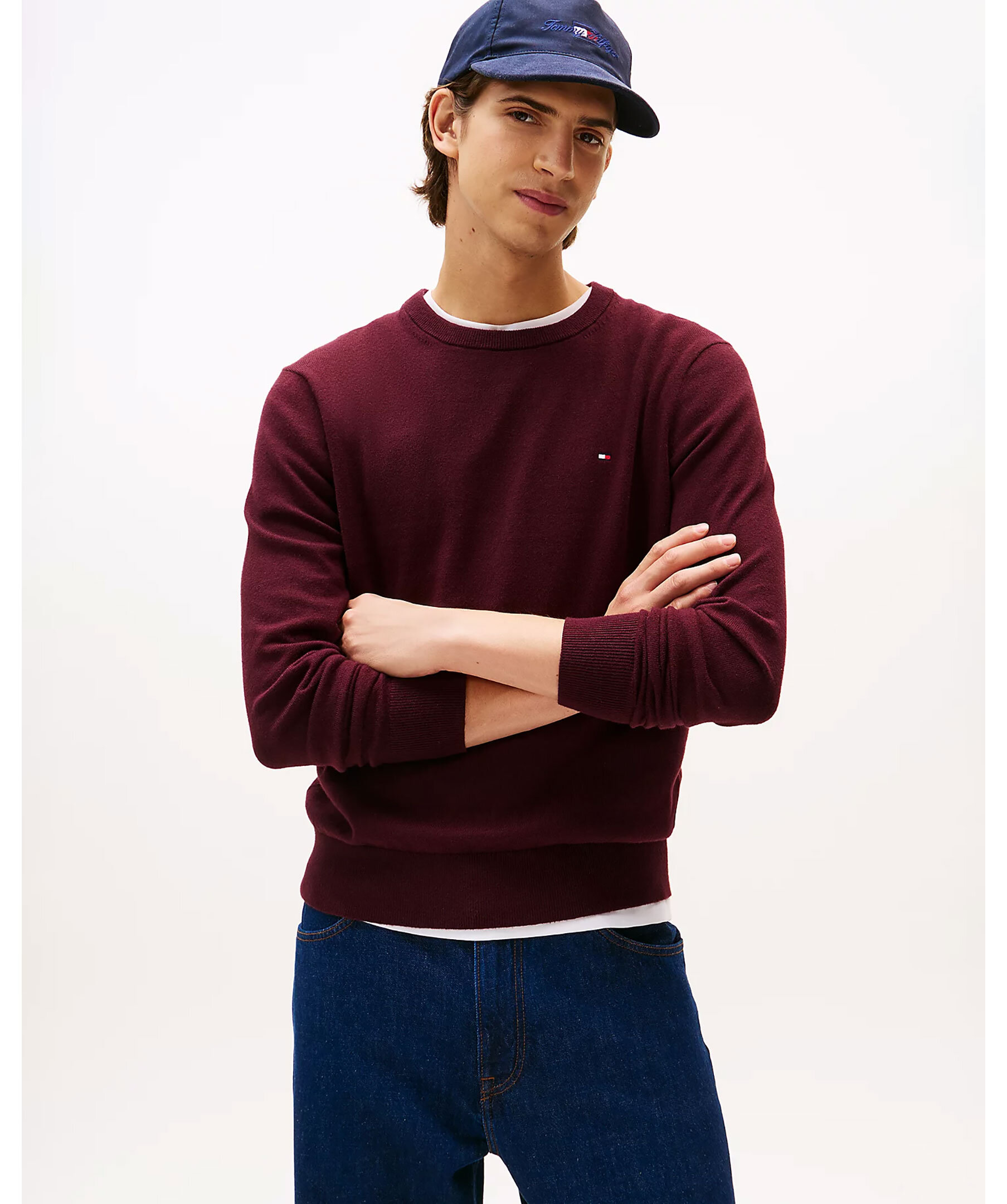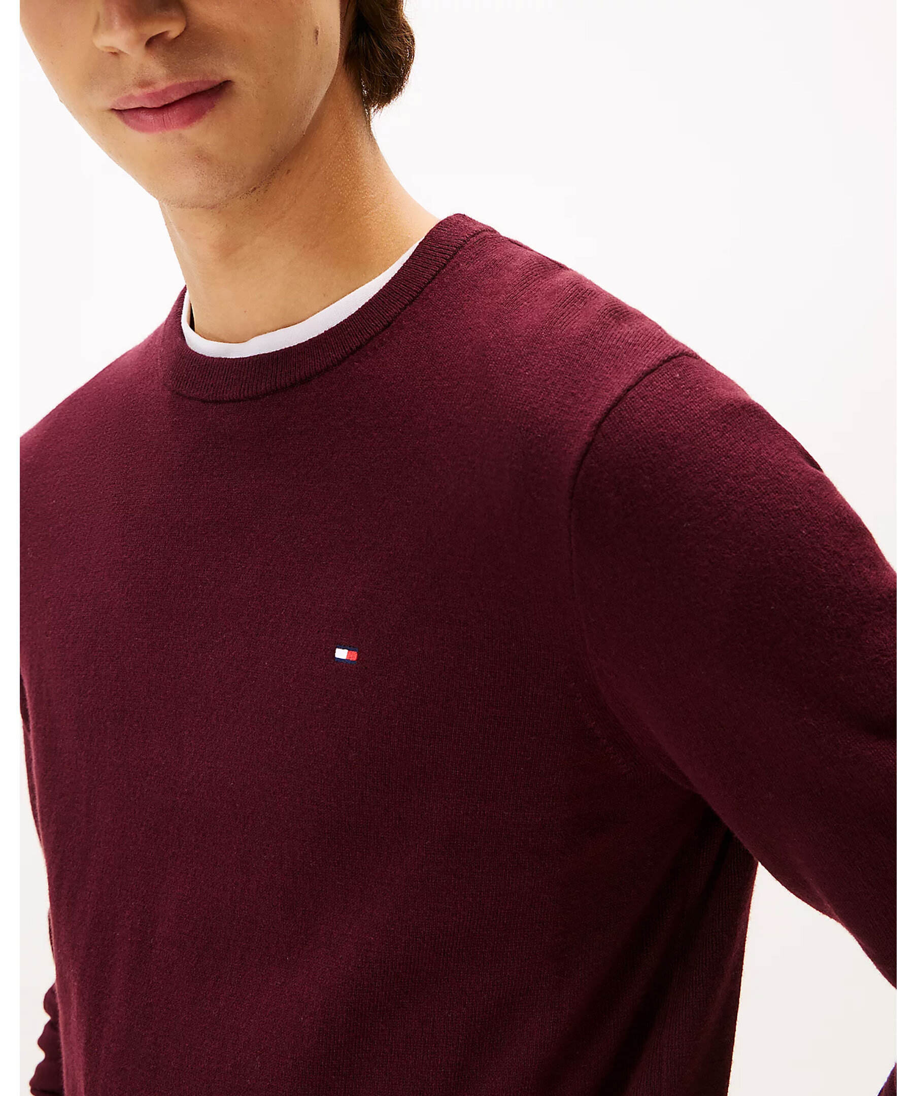 Vinröd stickad tröja från Tommy Hilfiger i en kashmir och bomullsblandning. Ljungad stickning, rundad halsringning och ribbstickade krage, ärm- och plaggslut. Broderad Tommy Hilfiger flagga på bröstet. Normal passform.
