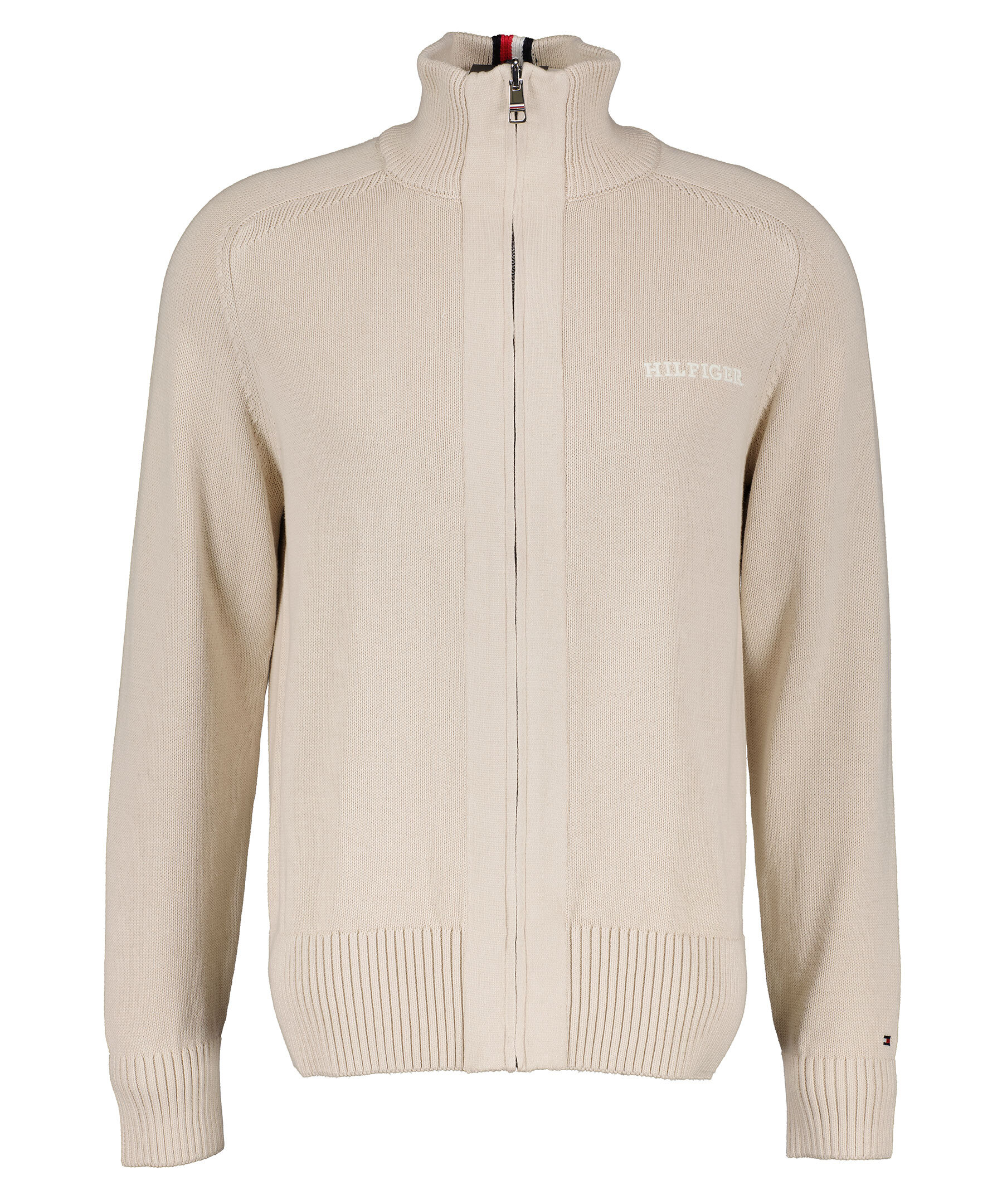 Beige zip up cardigan från Tommy Hilfiger. Tröjan har en hög hals och är komplett med en dragkedja för enkel styling. Tillverkad av ren bomull. Ribbstickad krage, ärmslut och fåll. Hilfiger monotype logotypbroderi på bröstet. Signaturränder på nacken. Avslappnad passform.