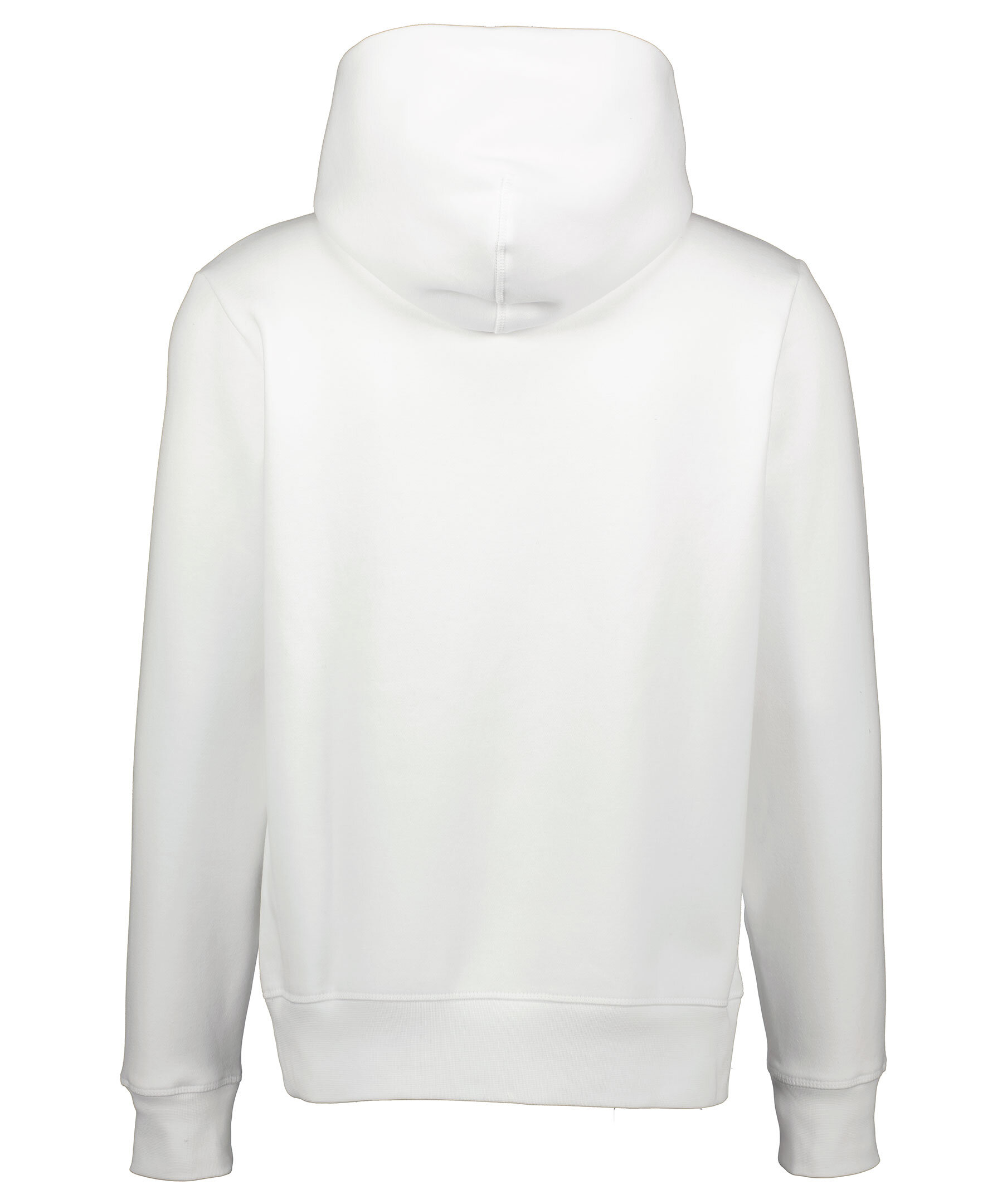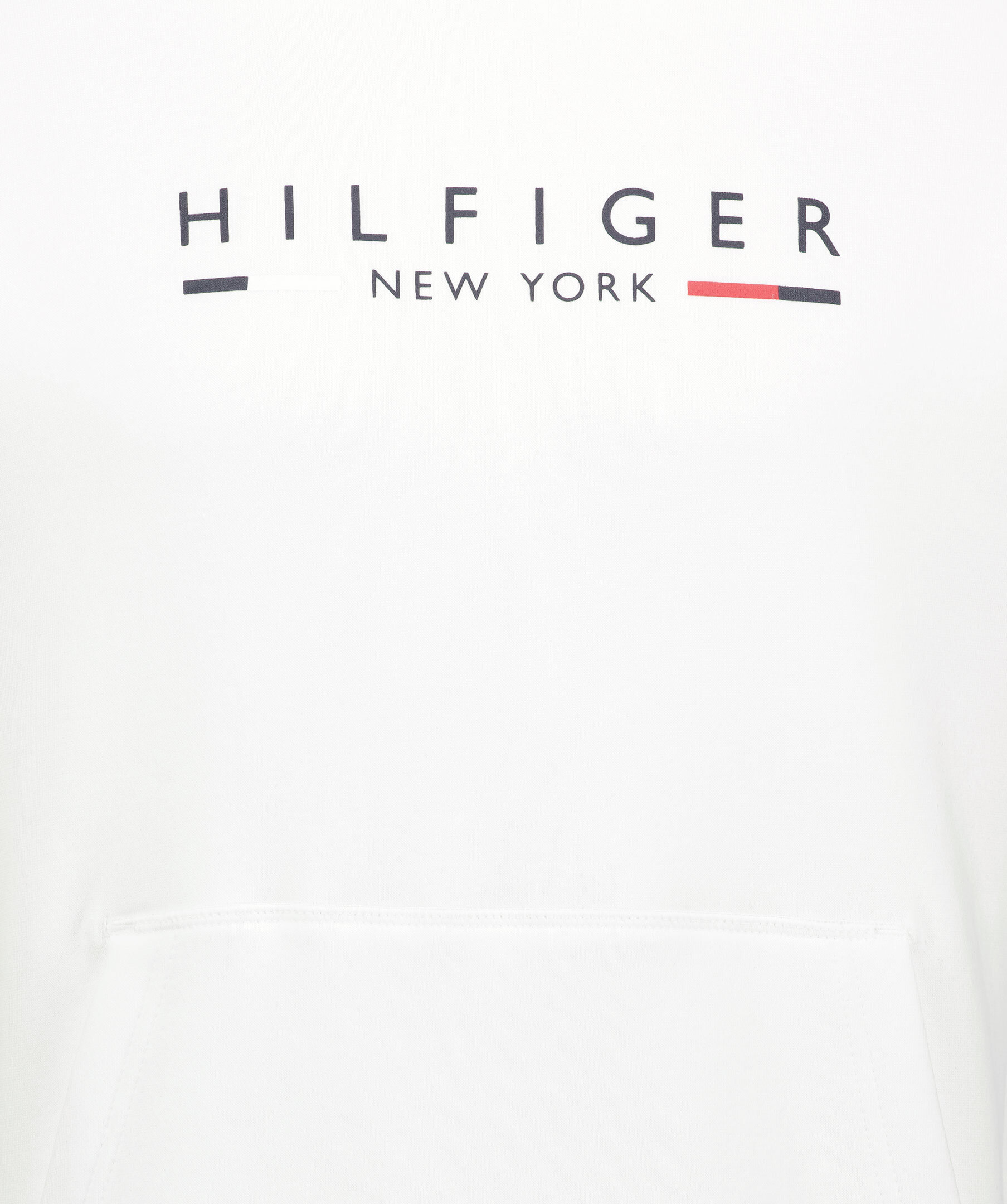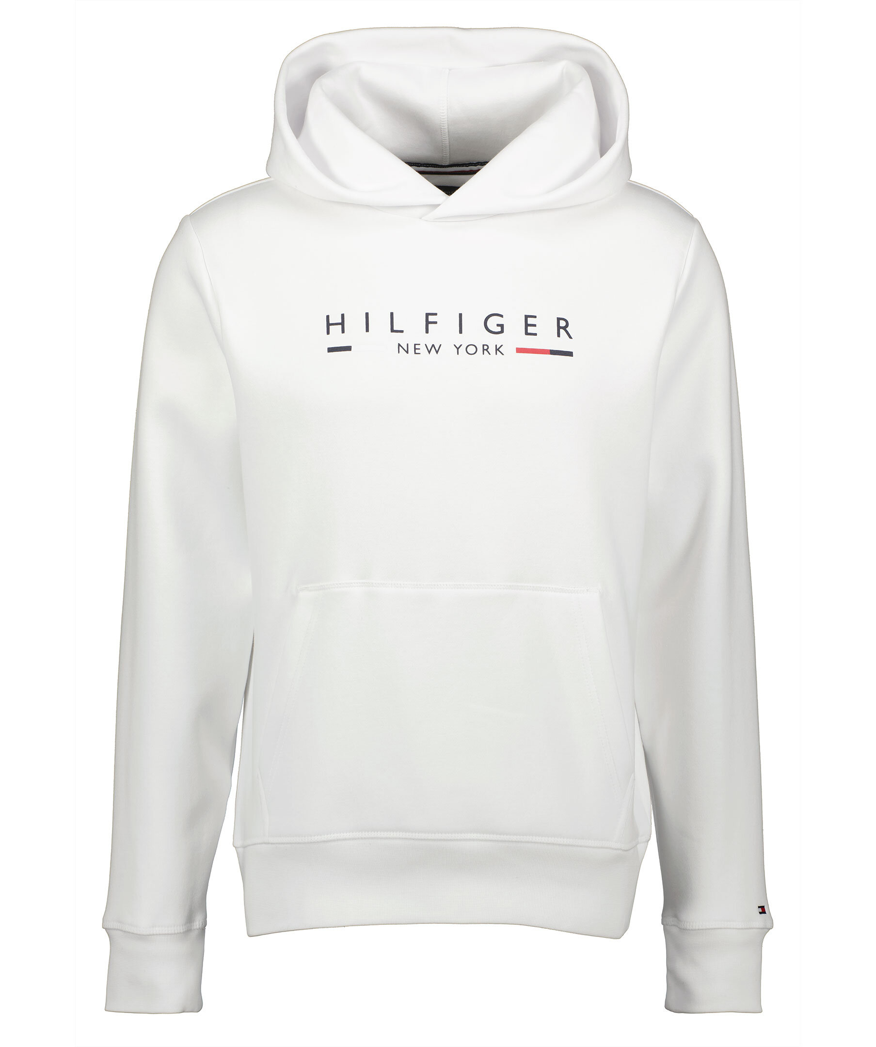 Vit hoodie från Tommy Hilfiger. Tryckt logotyp över bröstet. Luva med dragsko. Känguruficka på magen. Ribbstickade muddar vid ärm och plaggslut. Borstad insida.