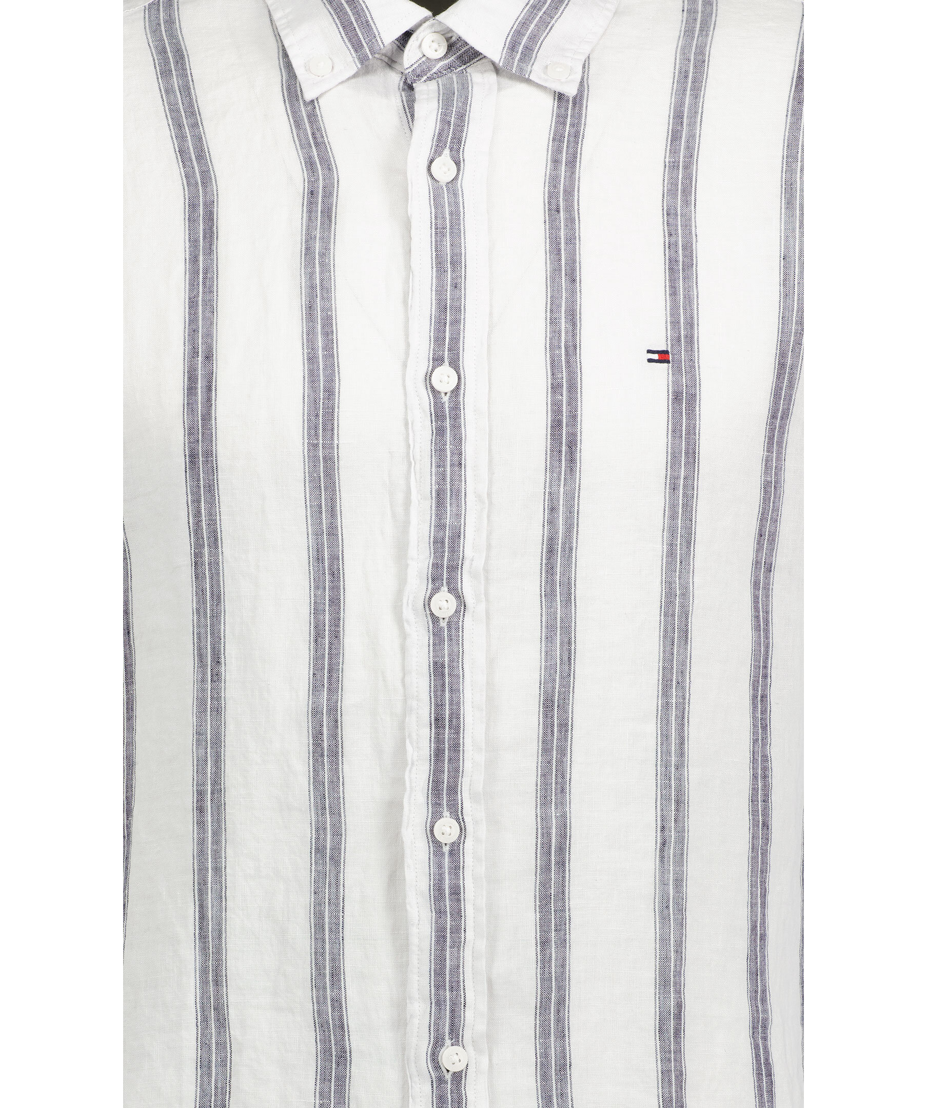 Vit och mörkblå skjorta med vertikala ränder från Tommy Hilfiger. Tillverkad i 100% linne. Button-down krage och liten broderad Tommy Hilfiger flagga på bröstet. Normal passform.