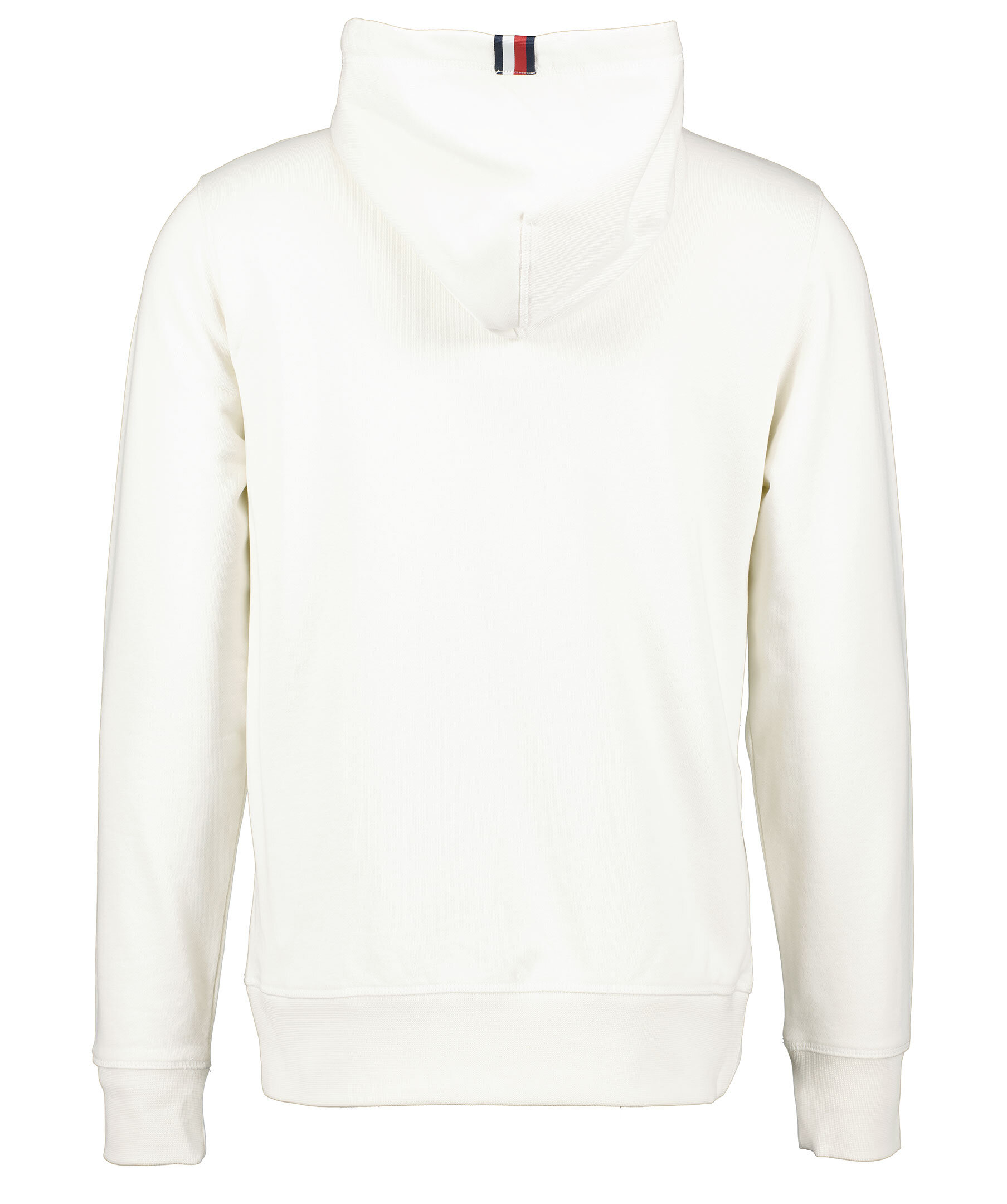 Benvit hoodie från Tommy Hilfiger. Stort vinrött och marinblått monogram i textil fast broderat på bröstet samt vit broderad logga. Snörning i luva. Gjord i 100 bomull.