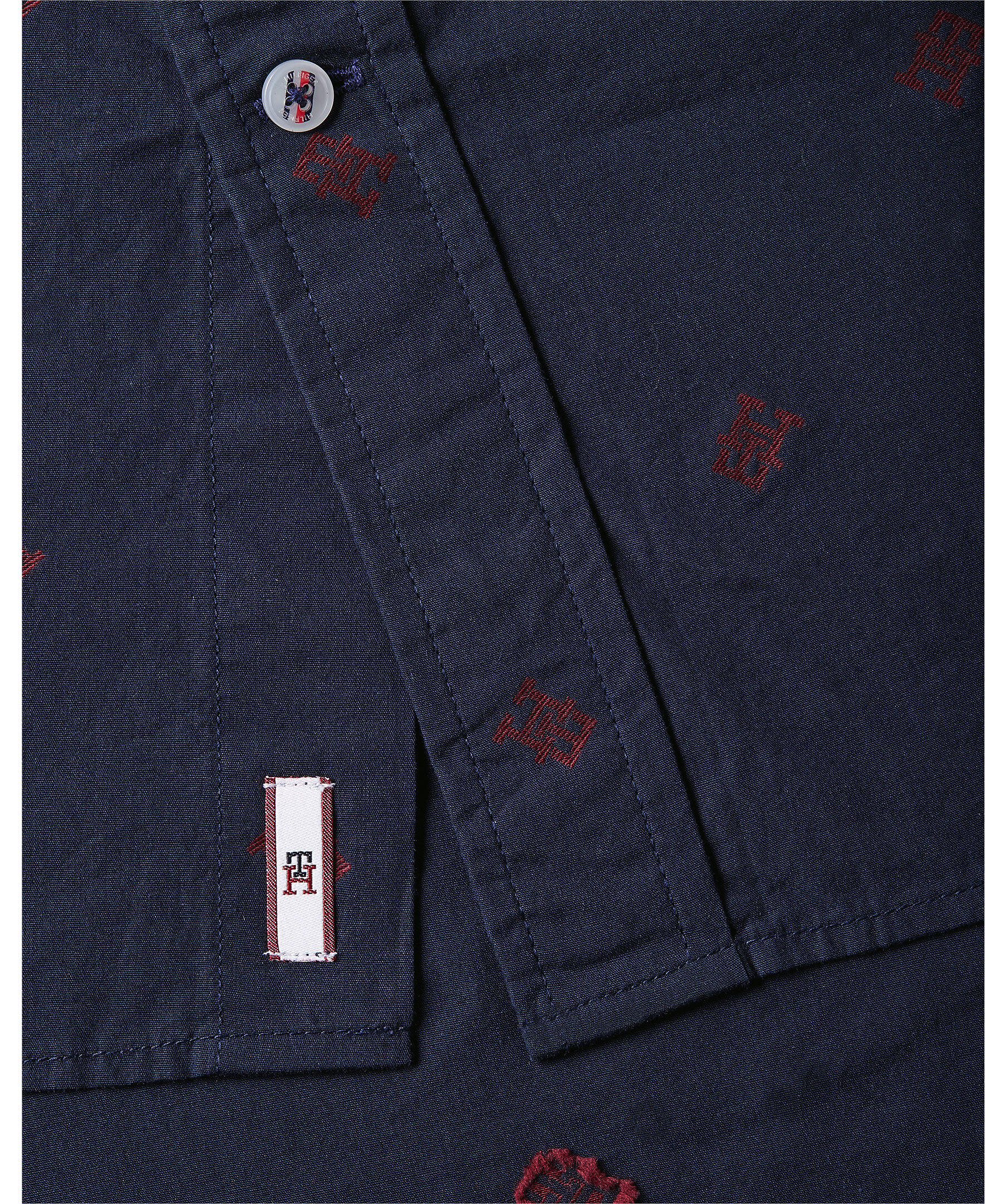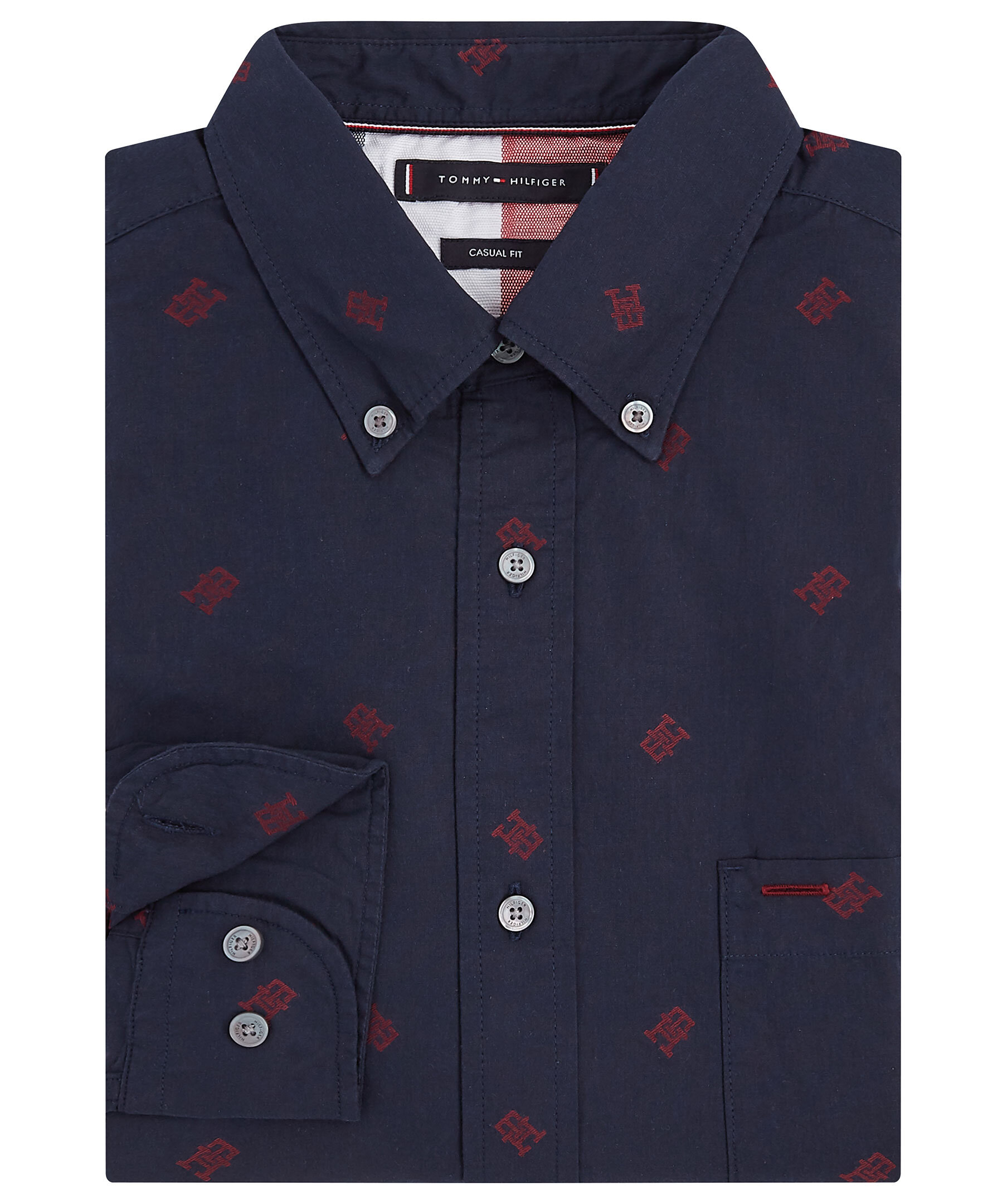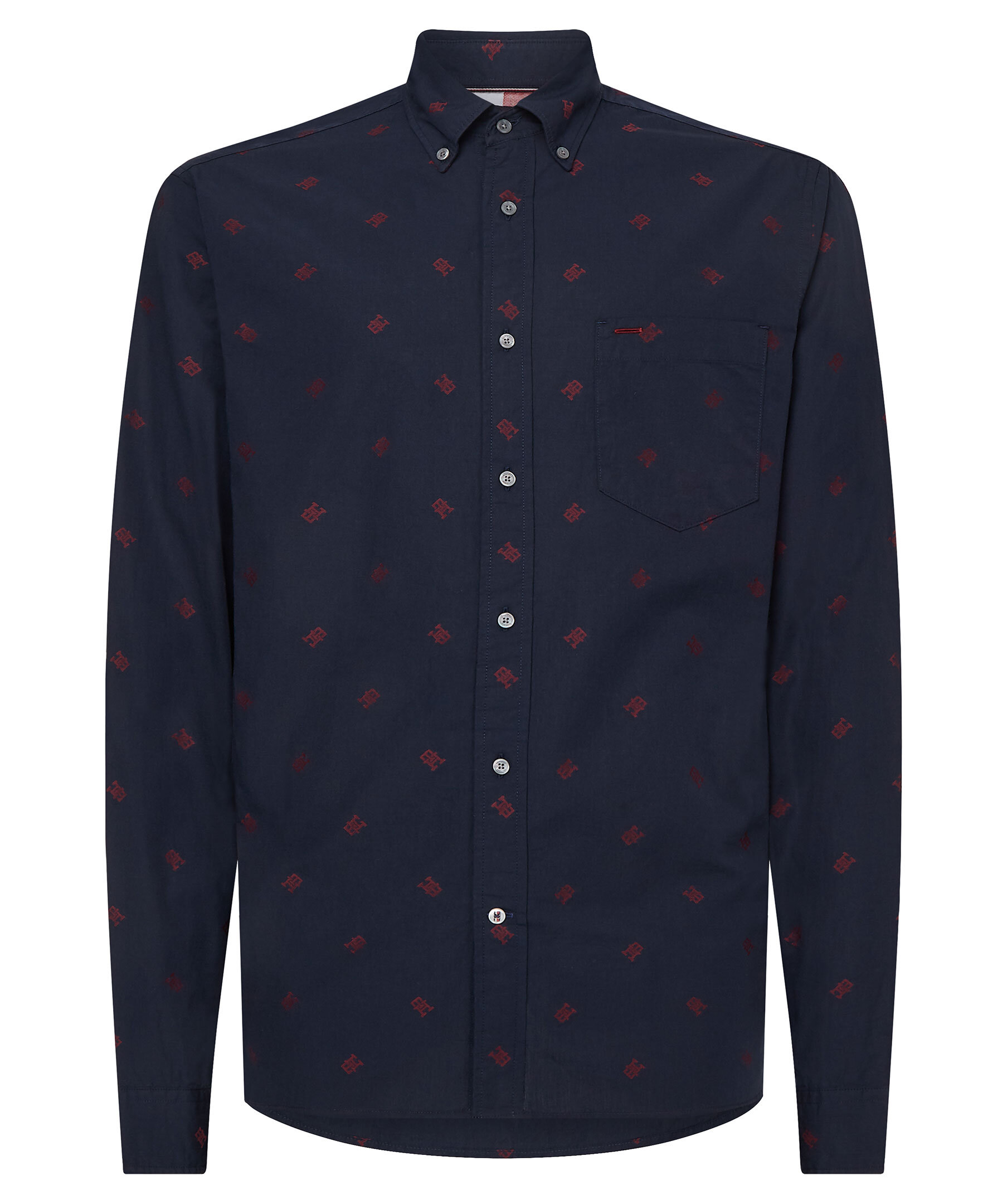 Marinblå skjorta med mönster i rött TH Monogram från Tommy Hilfiger. Avslappnad passform och button-down krage. Manschetter med en knapp, en bröstficka och Tommy Hilfiger flaggabroderi vid mudd.