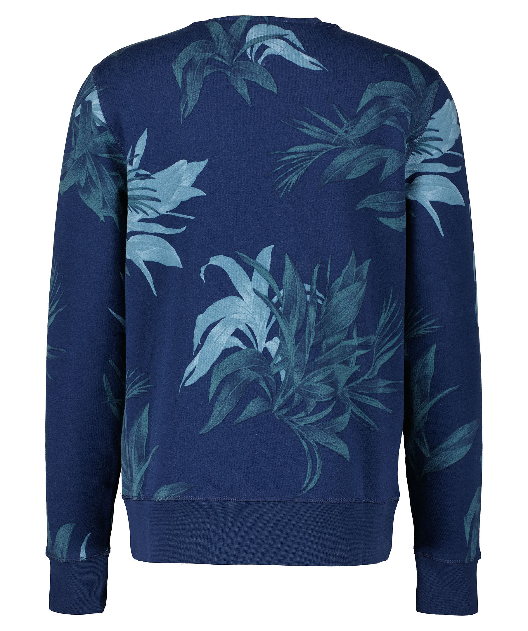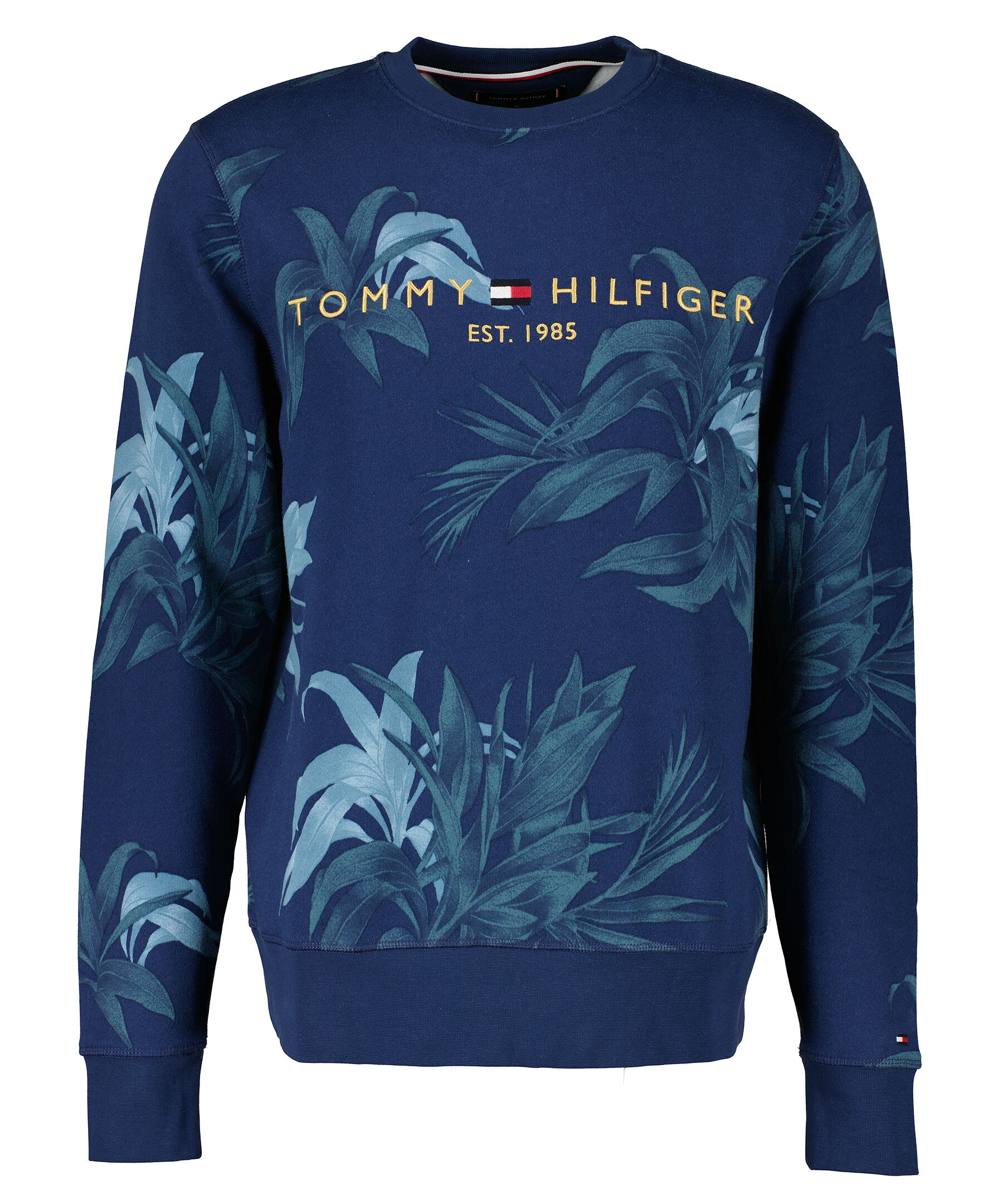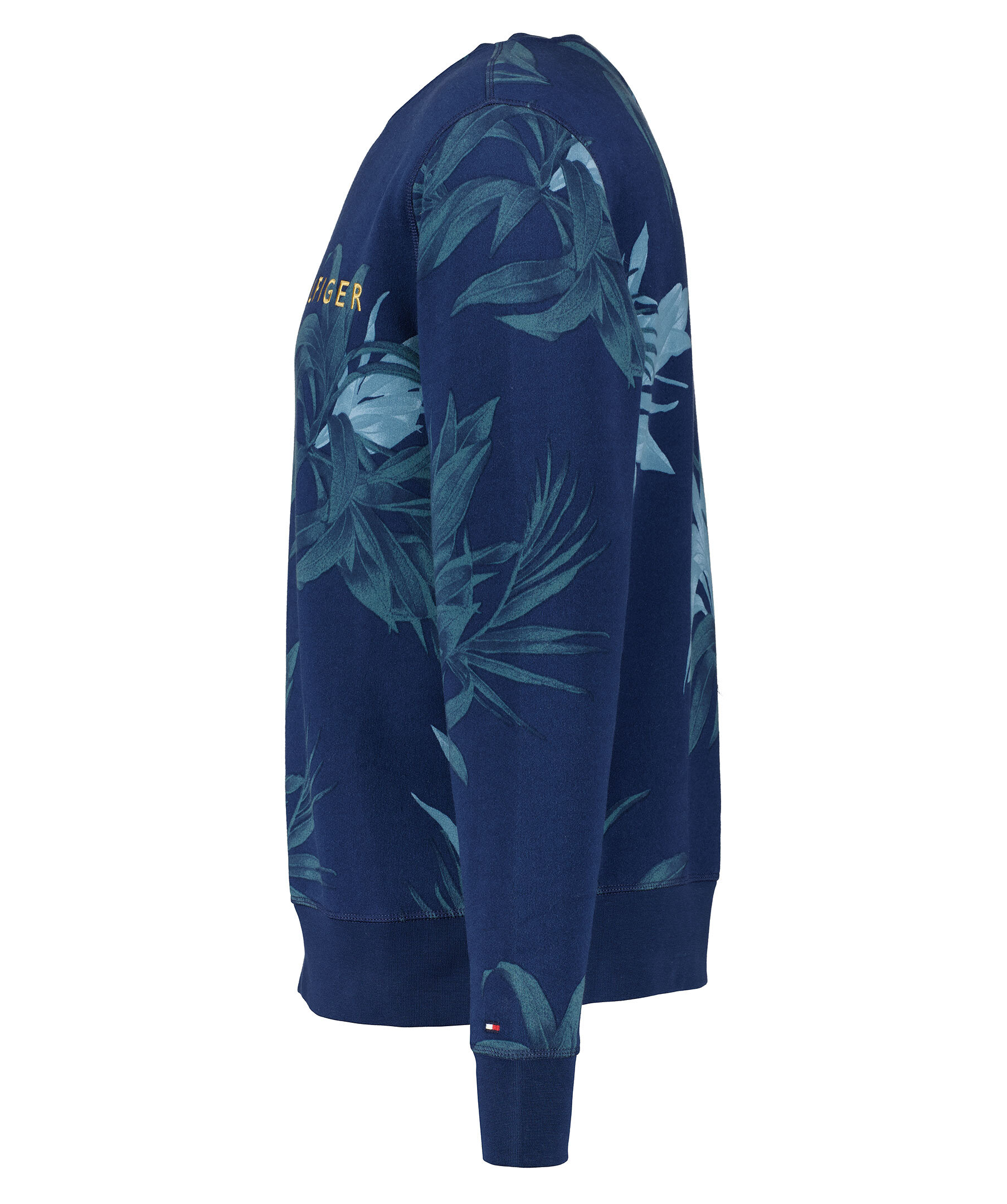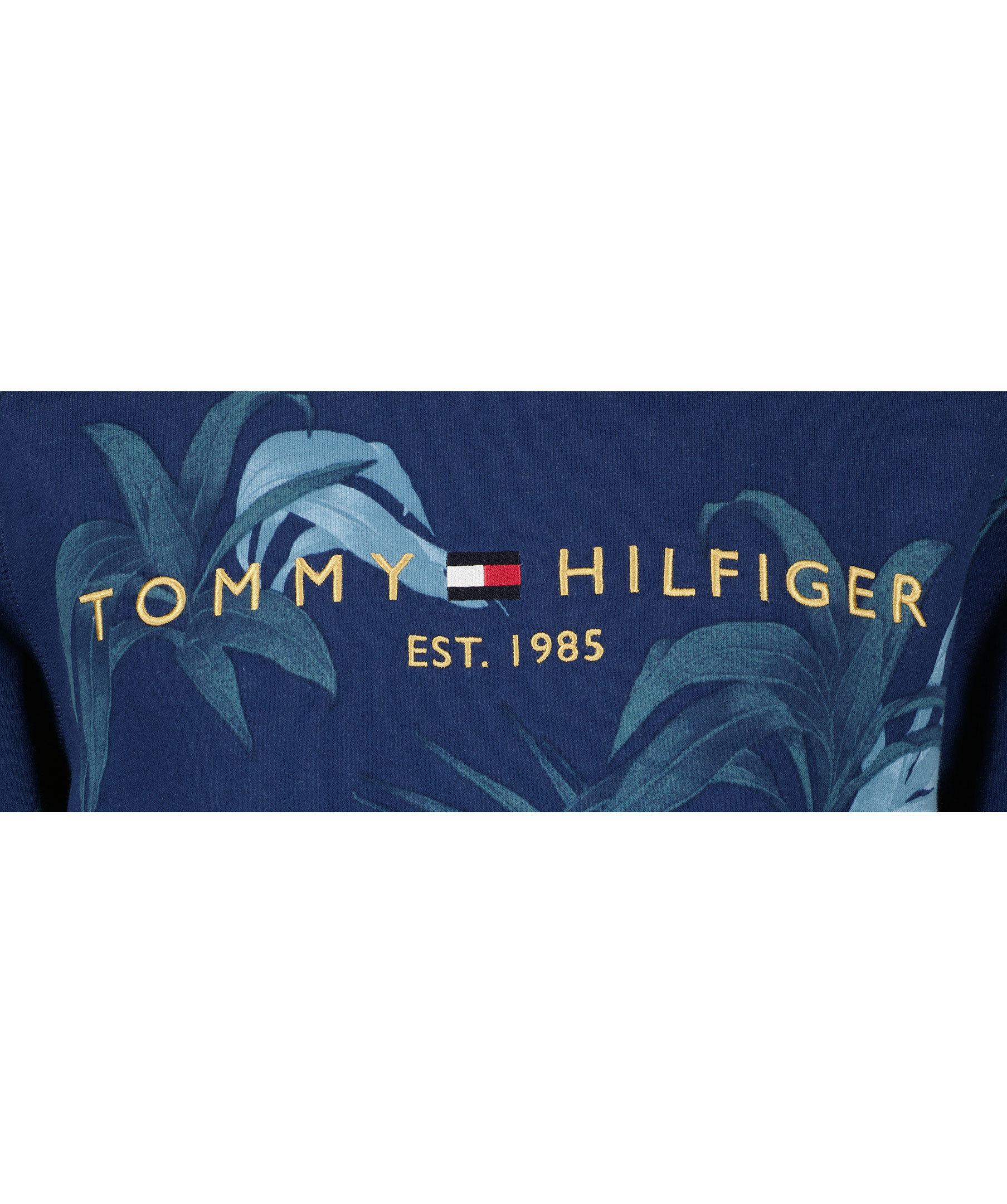 Mörkblå, mönstrad sweatshirt från Tommy Hilfiger. Logotyp broderad över bröstet och en liten broderad flagga vid vänster ärmslut. Mönster av palmblad över hela tröjan, rundad halsringning och ribbade muddar.