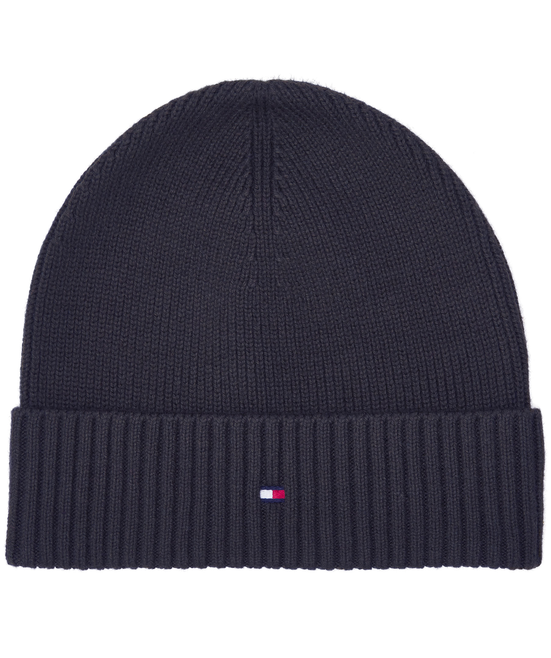 Marinblå ribbstickad mössa från Tommy Hilfiger gjord i en mjuk blandning av bomull och kashmir. Broderad Tommy-flagga på den vikta kanten.