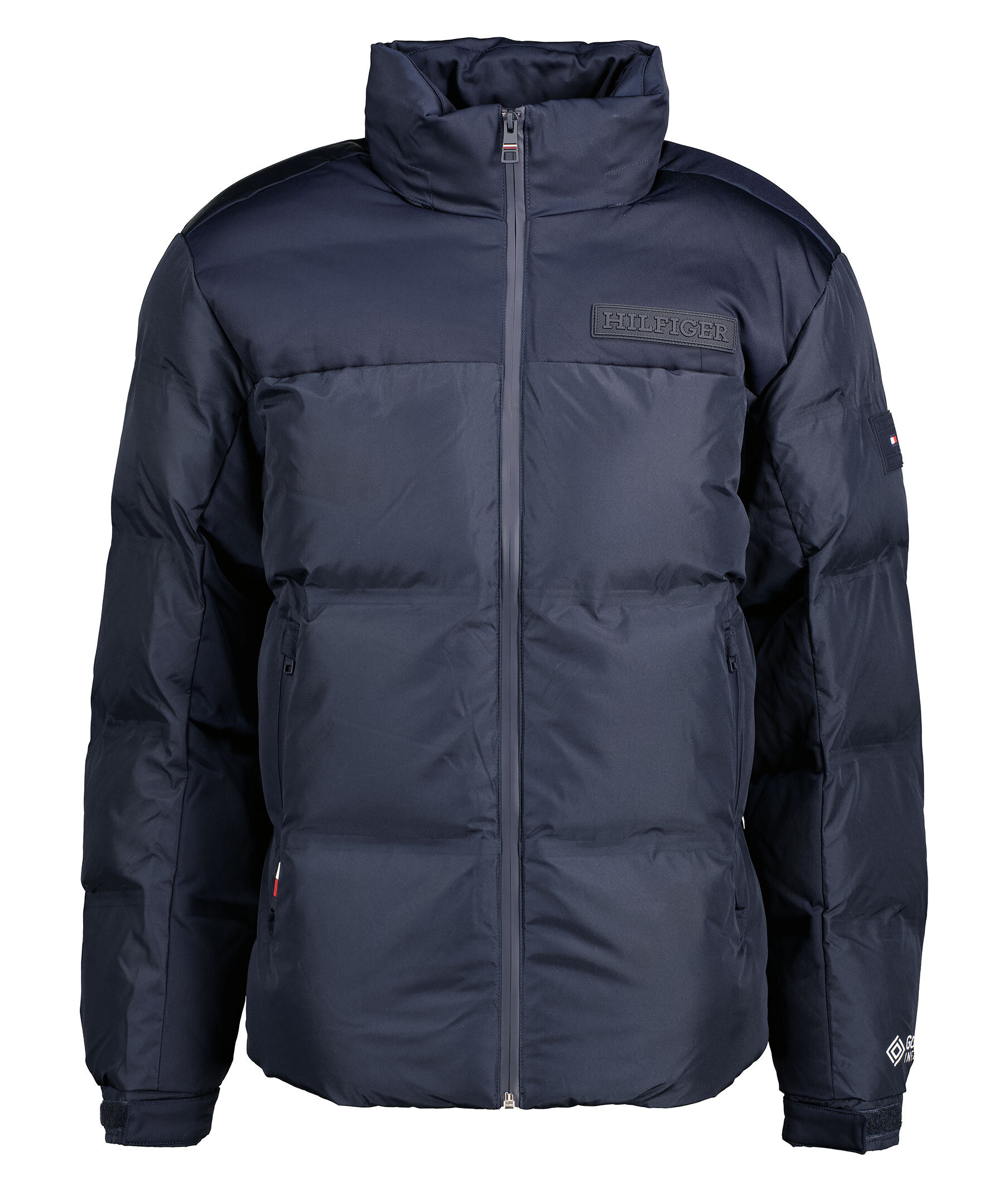 Marinblå pufferjacka från Tommy Hilfiger. GORE-TEX-tyger ger dig suveränt skydd mot vind och regn samtidigt som de andas, gjord av vattenavvisande återvunnen polyester med vattentät dragkedja. Ståkrage, stängs med dragkedja. Två sidofickor med dragkedja, Hilfiger monotype logotyp på bröstet. Normal passform. Tillverkad i 100% återvunnen polyester.