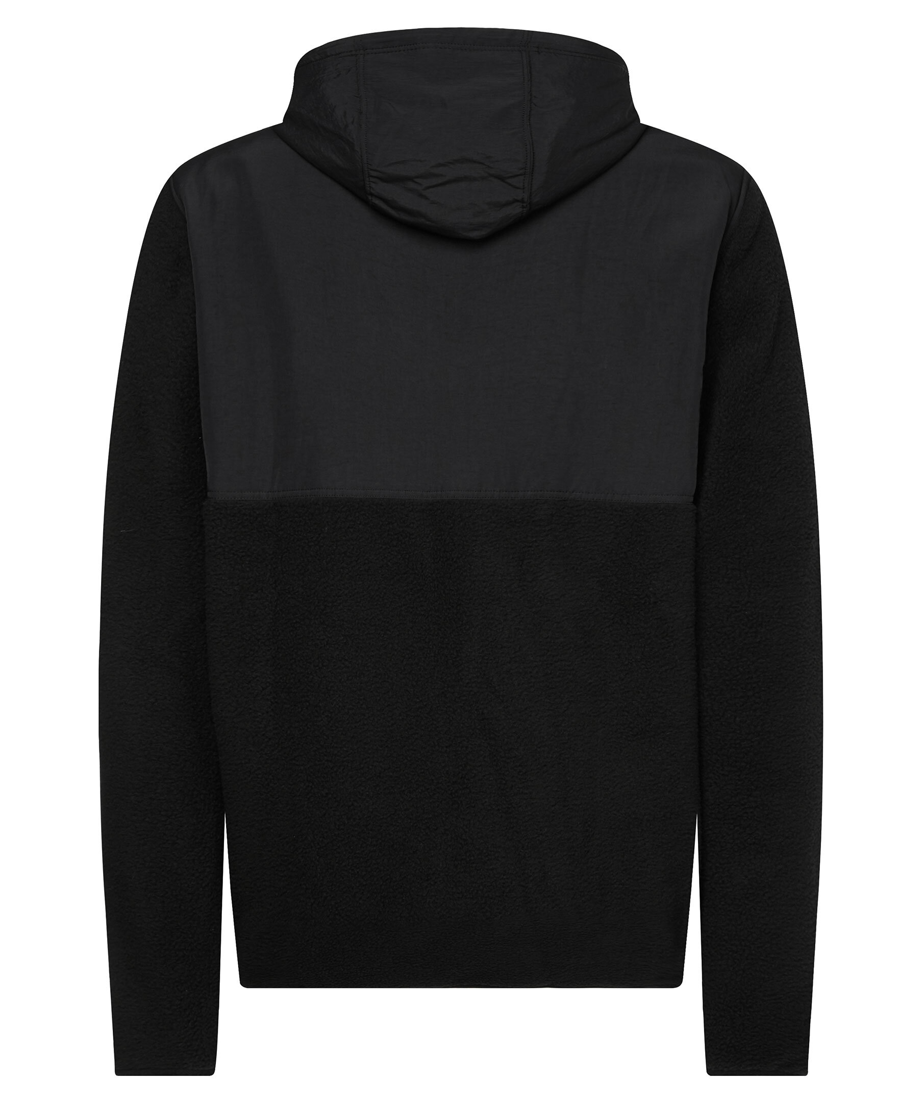 Svart fleecejacka med luva i avslappnad passform från The North Face. Jackan har en känguruficka på magen och en bröstficka med dragkedja. Stretchigt kantband vid muddarna i plaggslut och i ärmslut samt half-zip dragkedja mitt fram. Kontrasttyg i svart på krage, luva, bröst och oket bak. Luva med elastisk dragsko och gummerad patch med logotyp på vänster ärm.