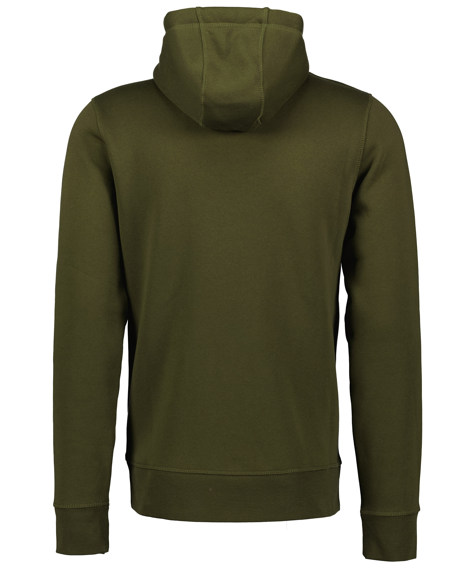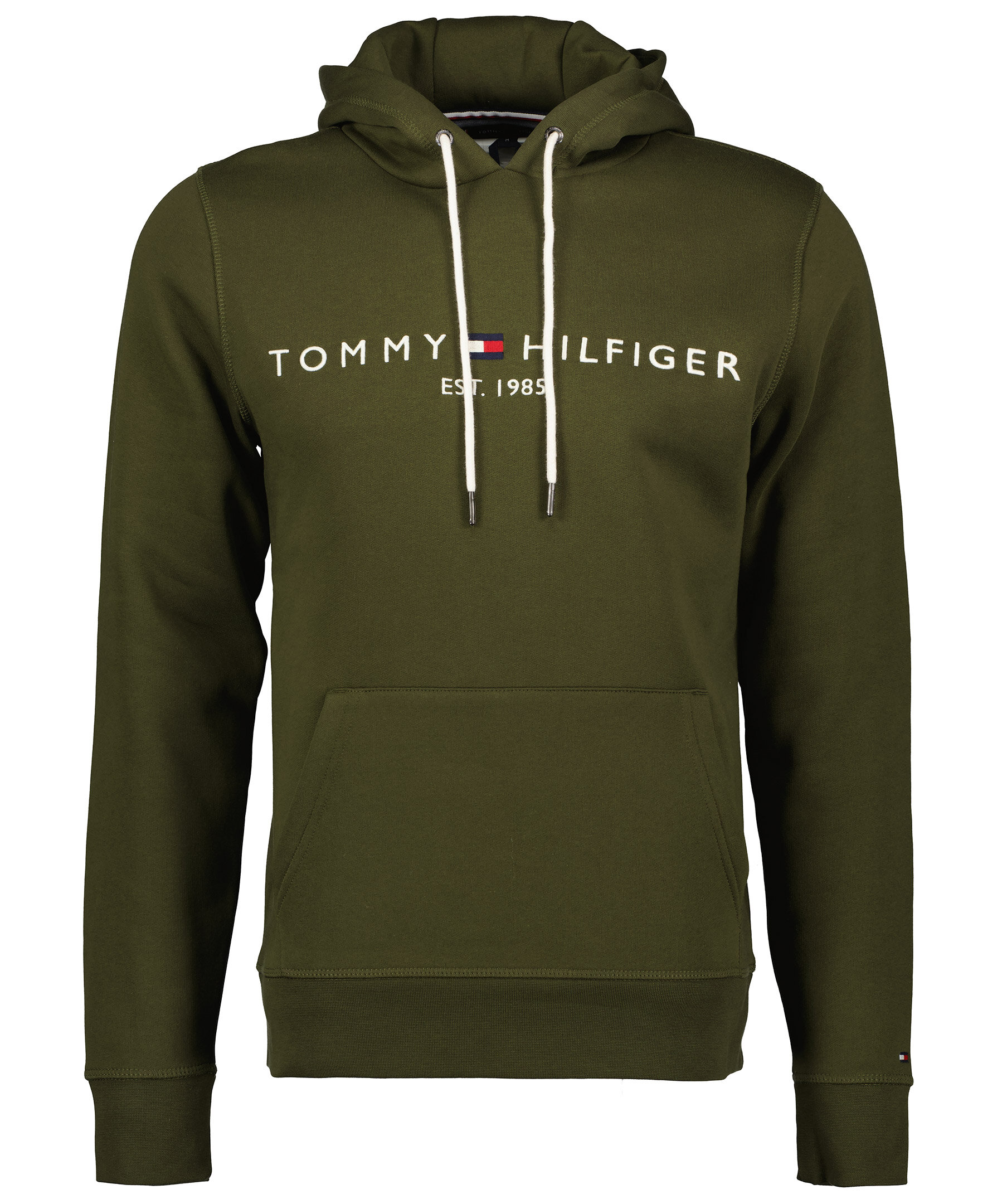 Mörkgrön luvtröja från Tommy Hilfiger. Logotyp broderad över bröstet och en liten broderad flagga vid vänster ärmslut. Tröjan har en ficka på magen, snörning i luva och ribbstickade muddar.