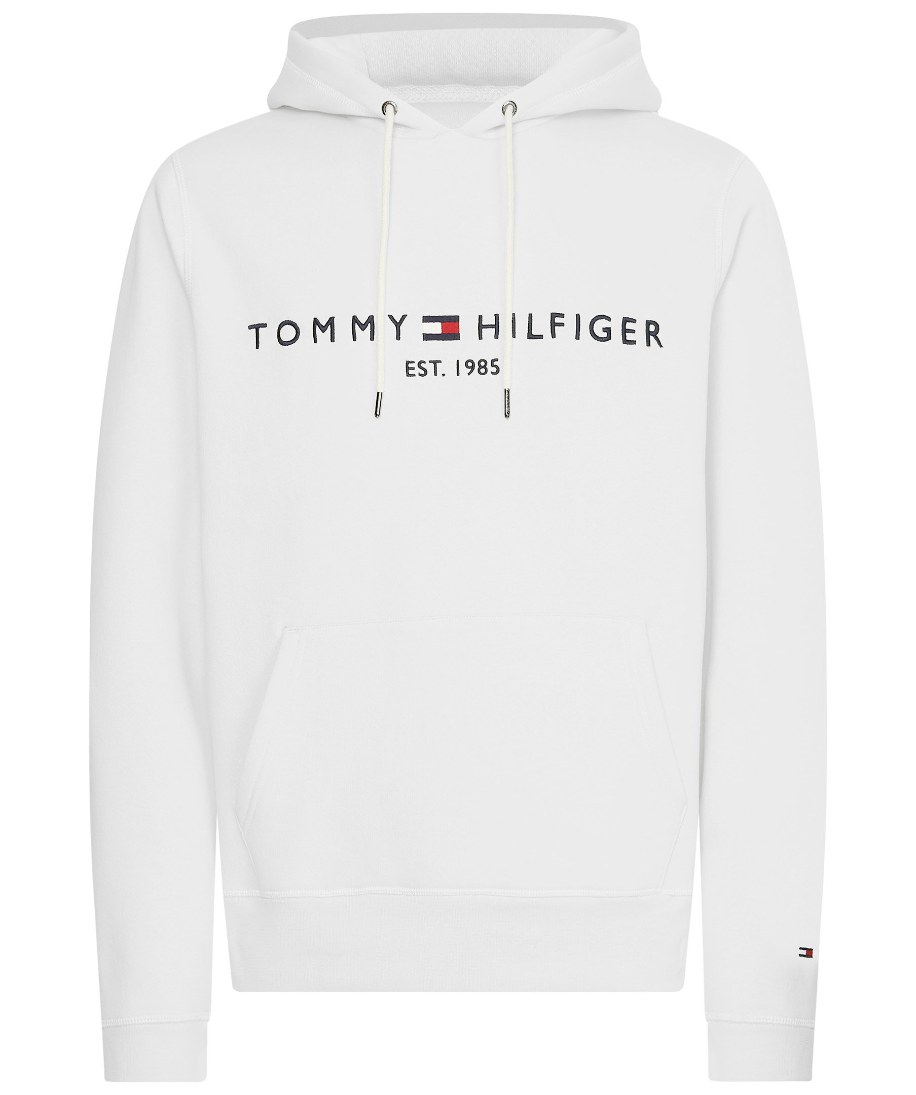 Vit hoodie från Tommy Hilfiger. Luva med dragsko. Broderad logotyp över bröstet. Ribbstickade muddar i ärm- och plaggslut. Borstad insida.