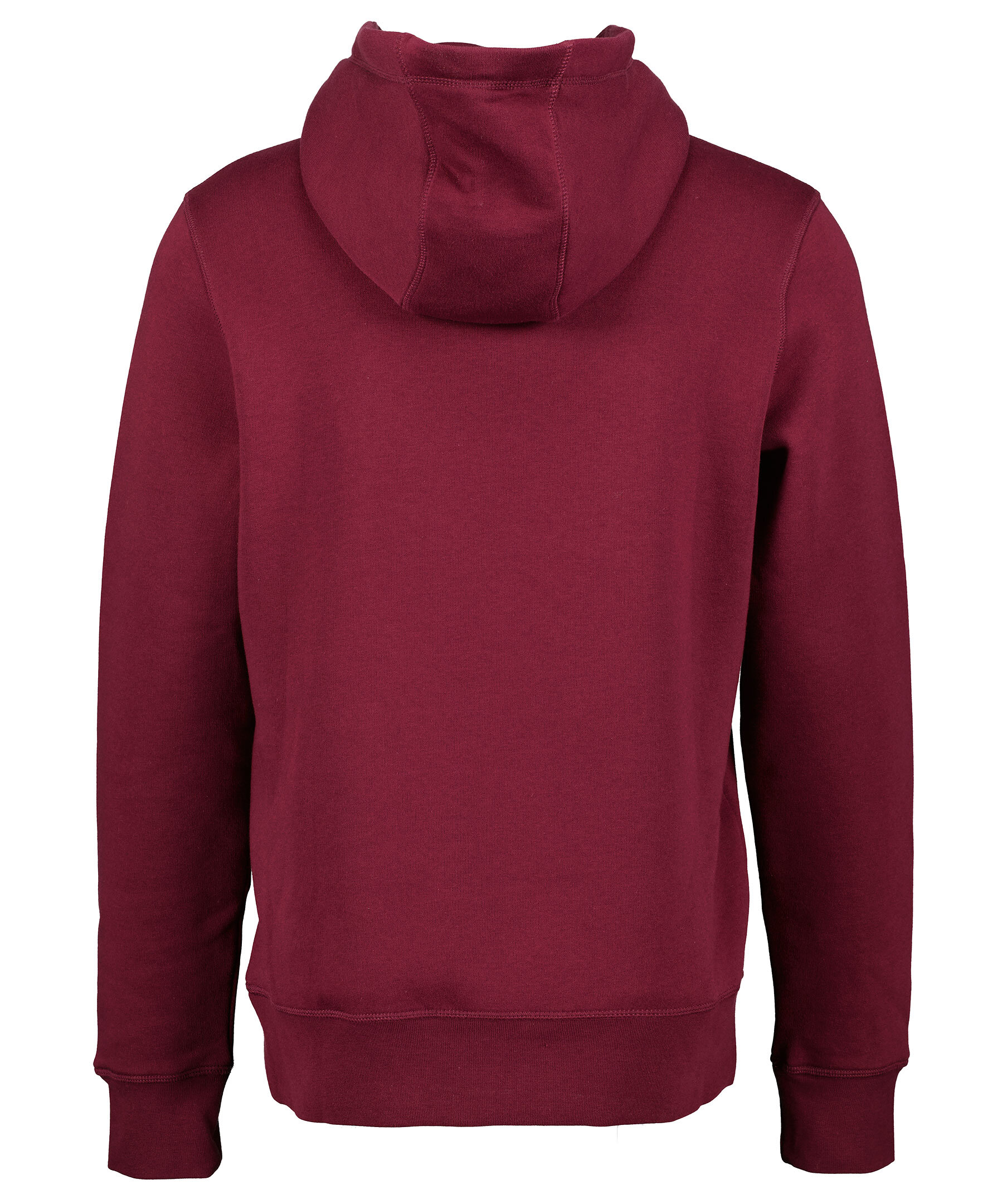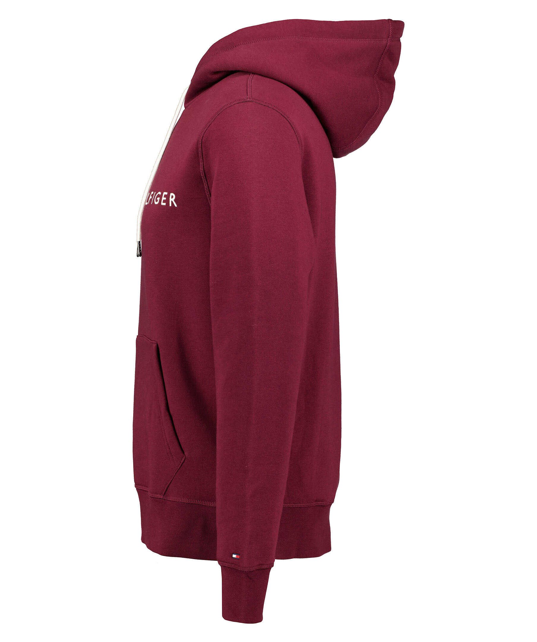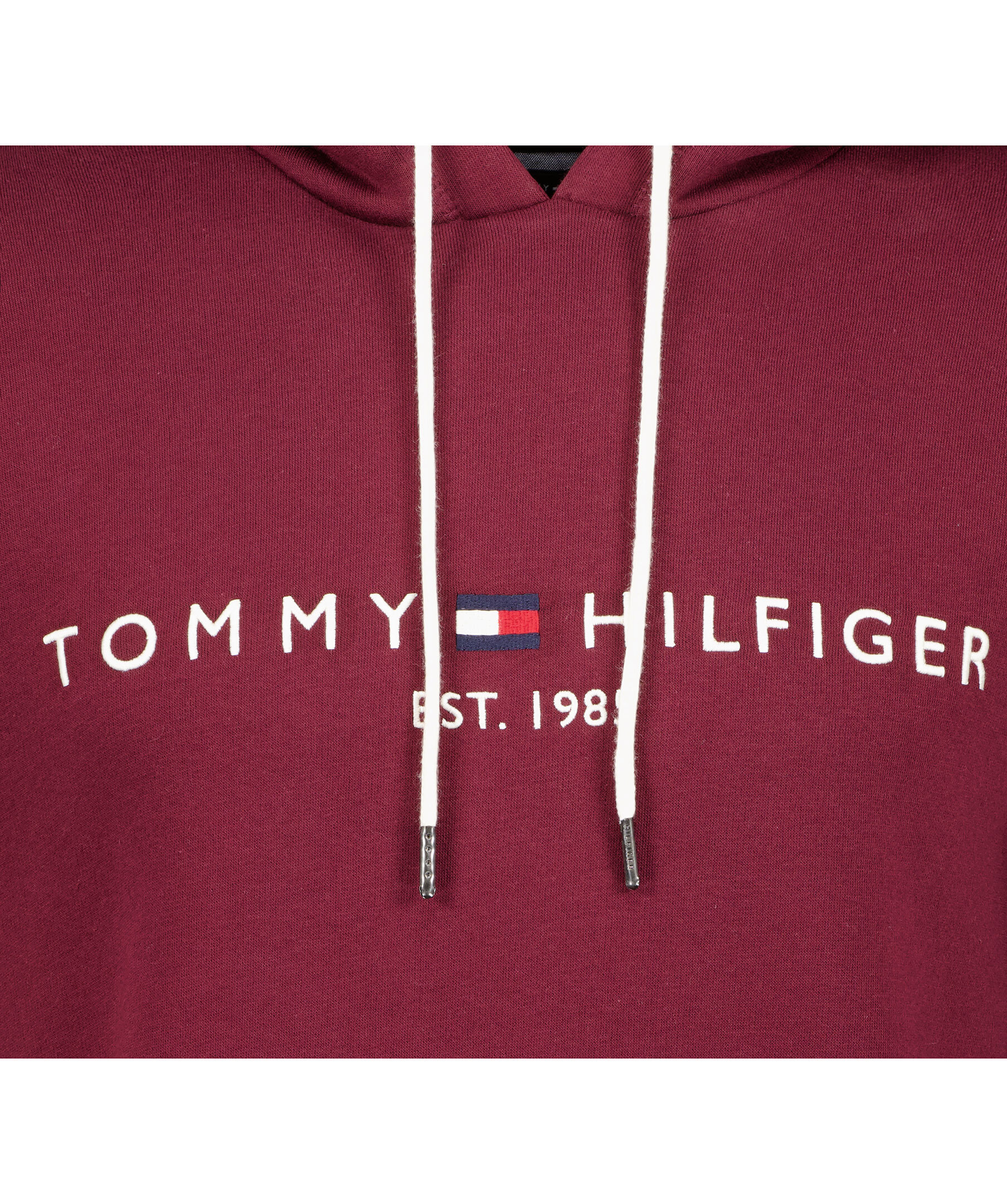 Vinröd hoodie med vit snörning i luvan från Tommy Hilfiger. Tillverkad i bomullsmix och har en mjuk, borstad insida. Vit, broderad logga på bröstet, känguruficka och ribbade muddar.