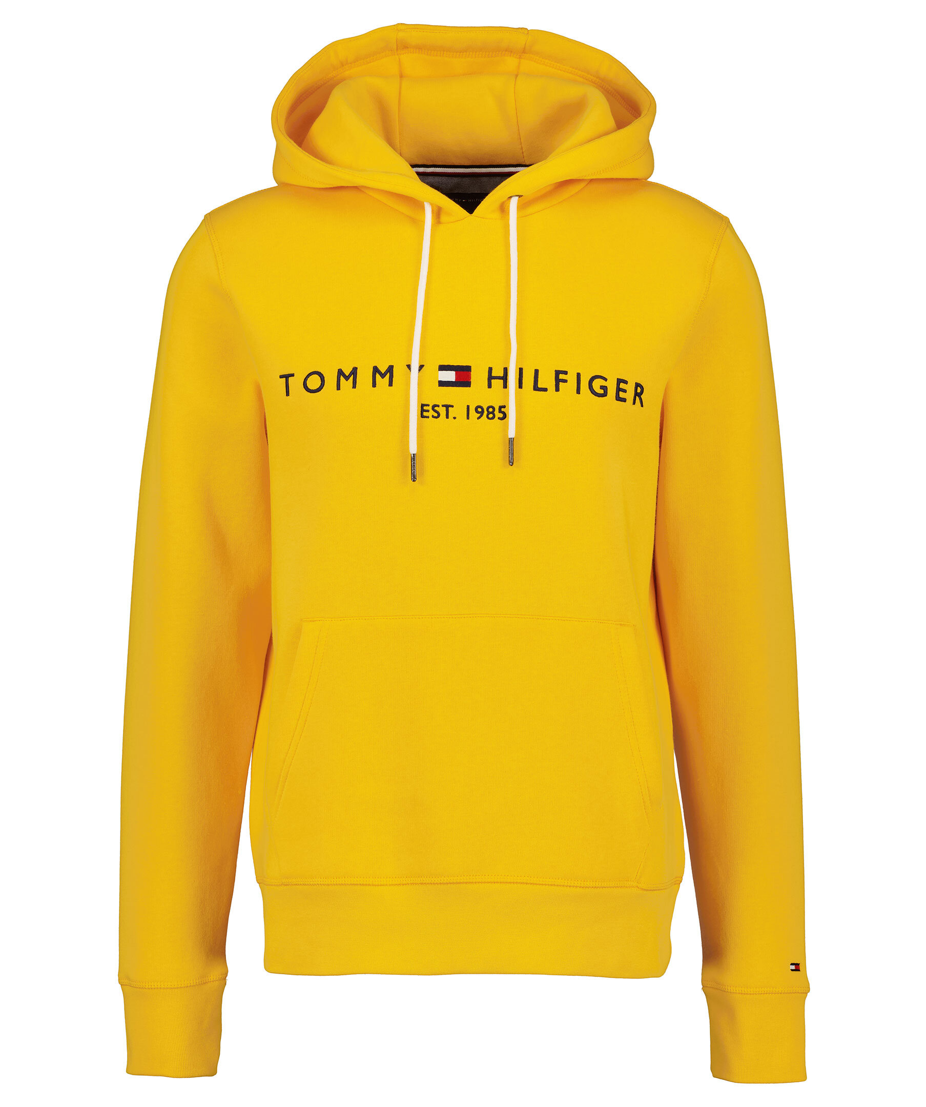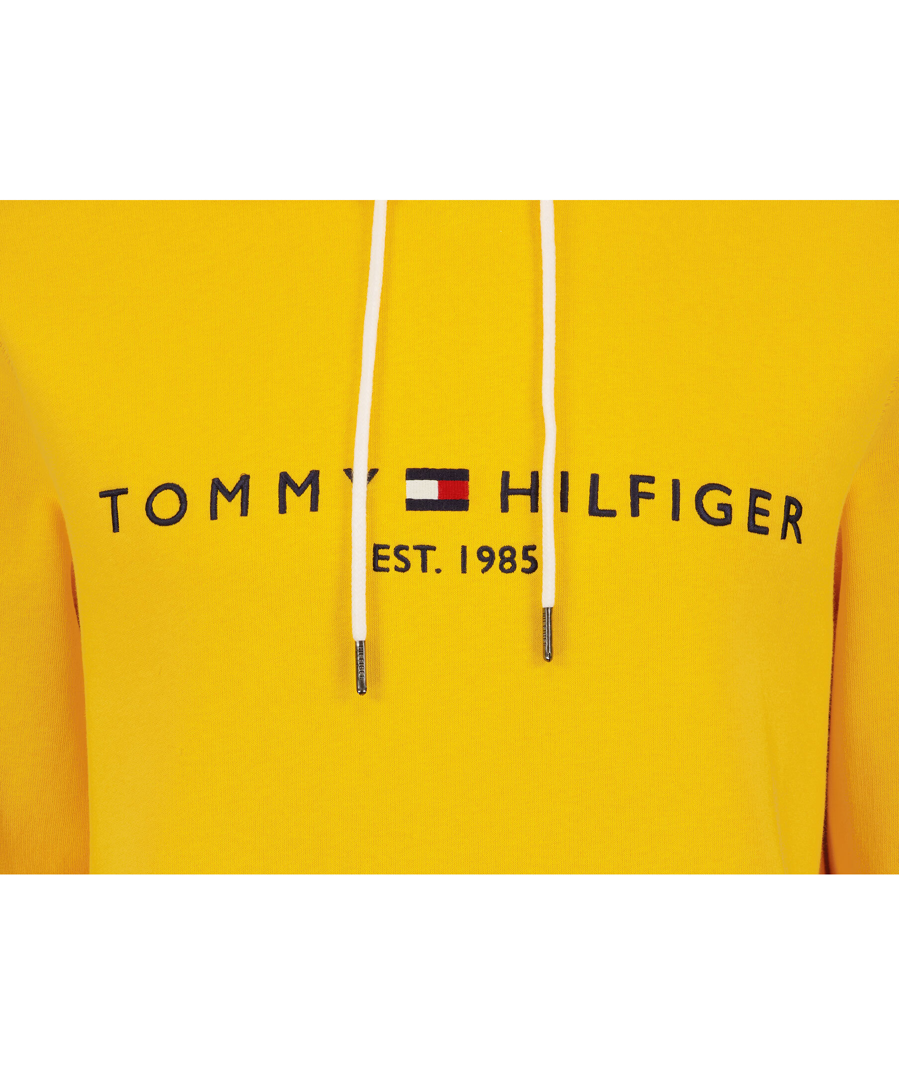 Gul hoodie med vit snörning i luvan från Tommy Hilfiger. Tillverkad i bomullsmix och har en mjuk, borstad insida. Vit, broderad logga på bröstet, känguruficka och ribbade muddar.